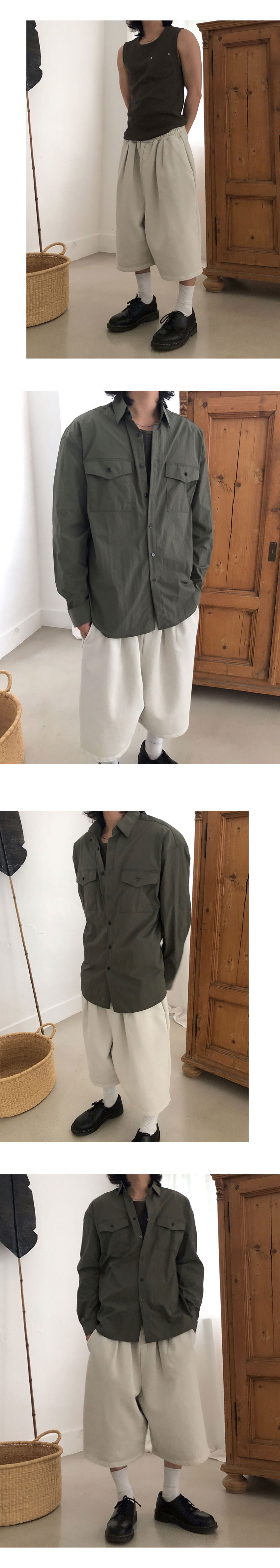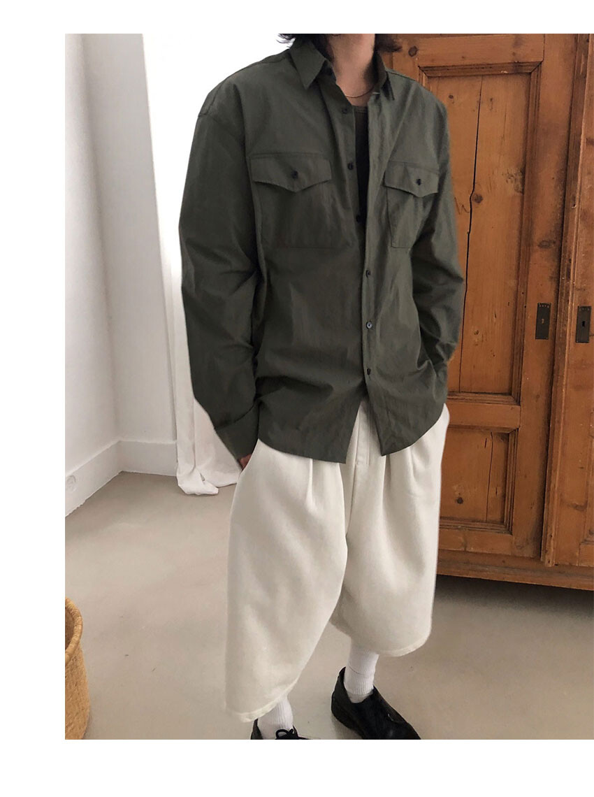 沿著簡單的圓領線條的胸部鉚釘口袋細節強調了休閒感,減少了沉悶感。