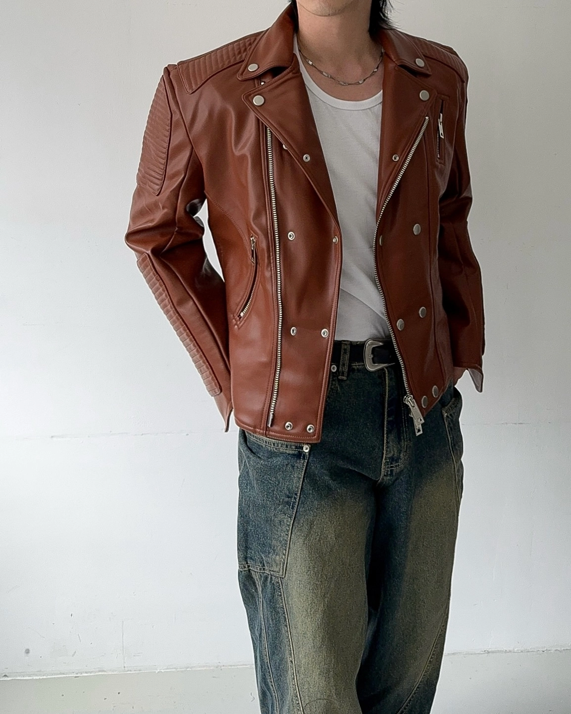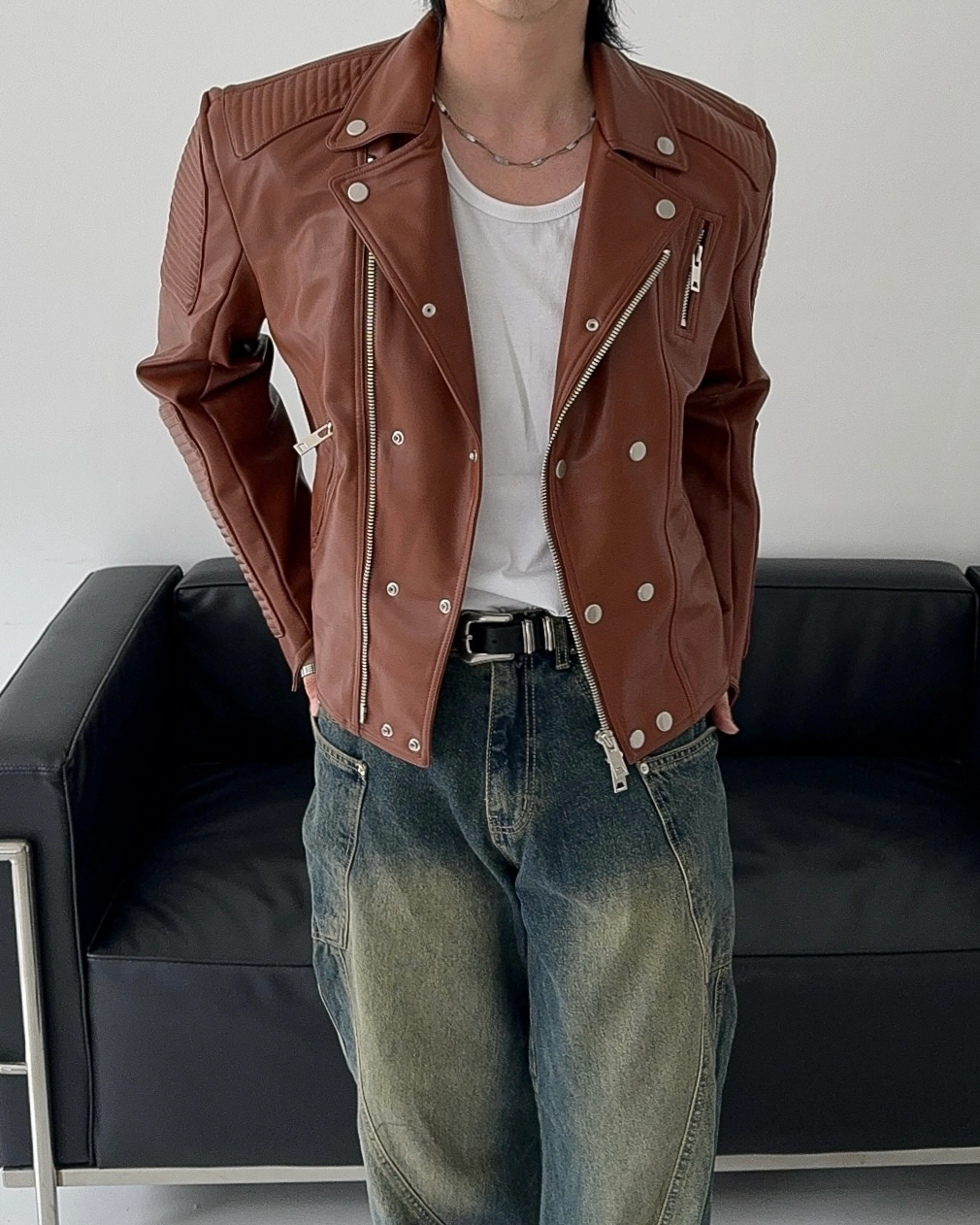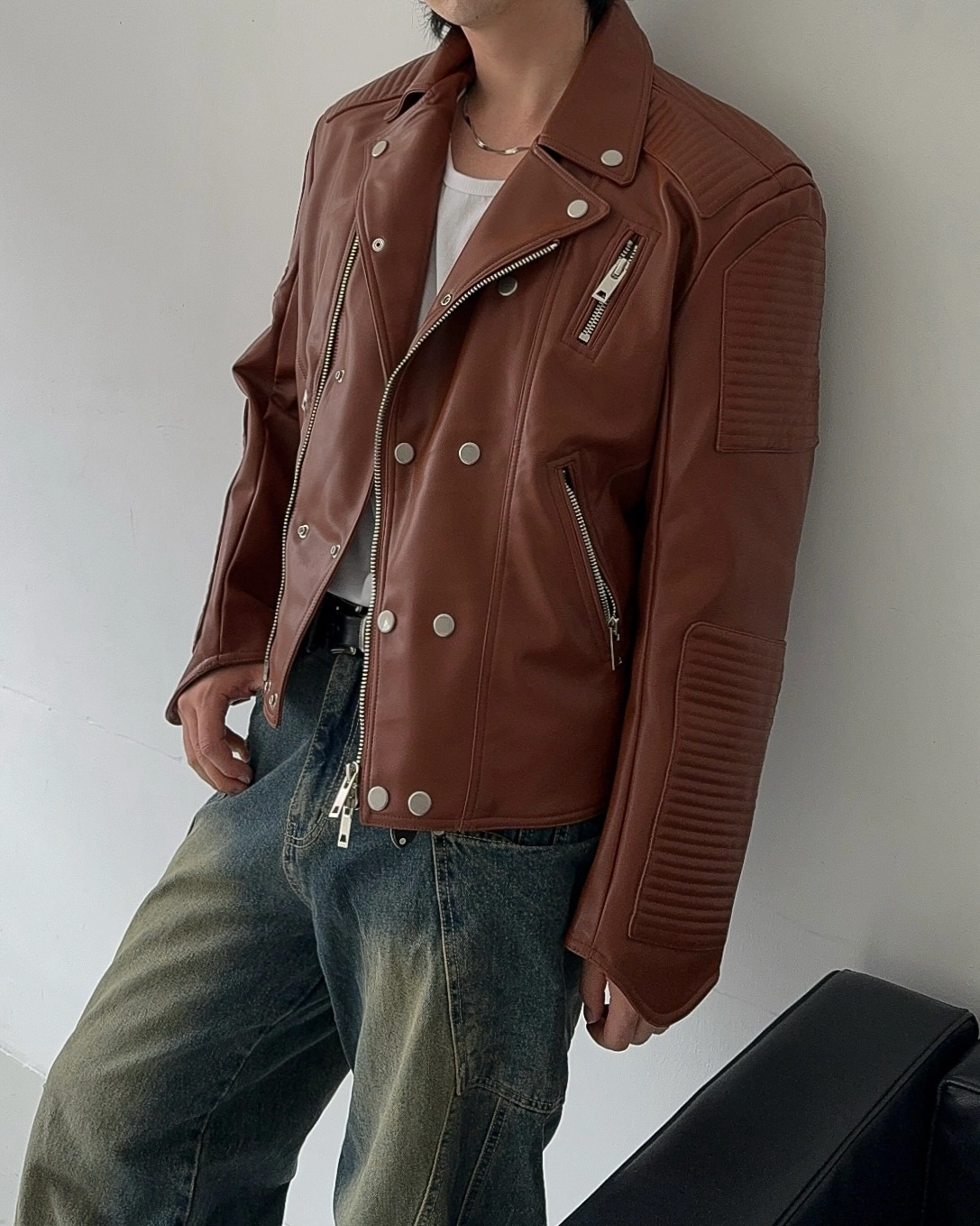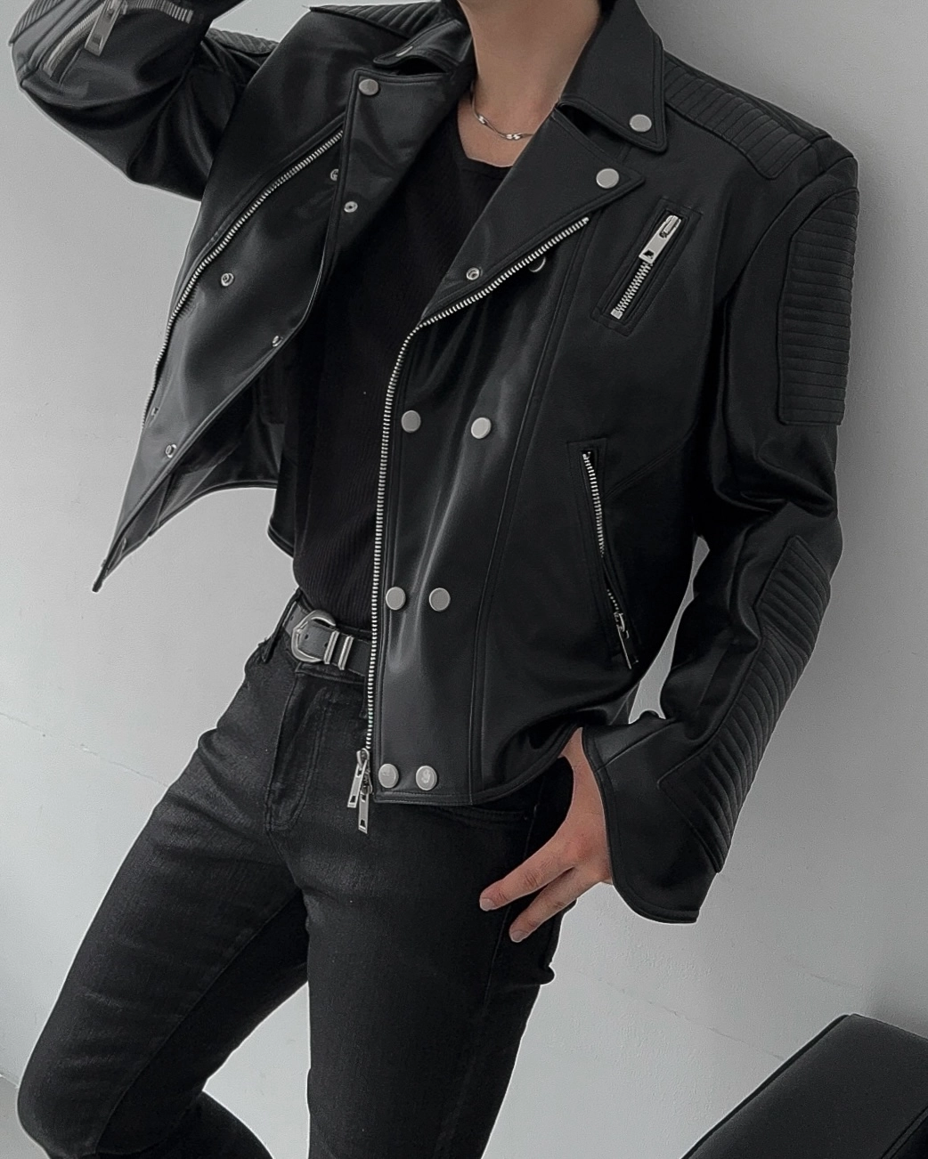 - 採用優質皮革面料製成的騎士夾克
