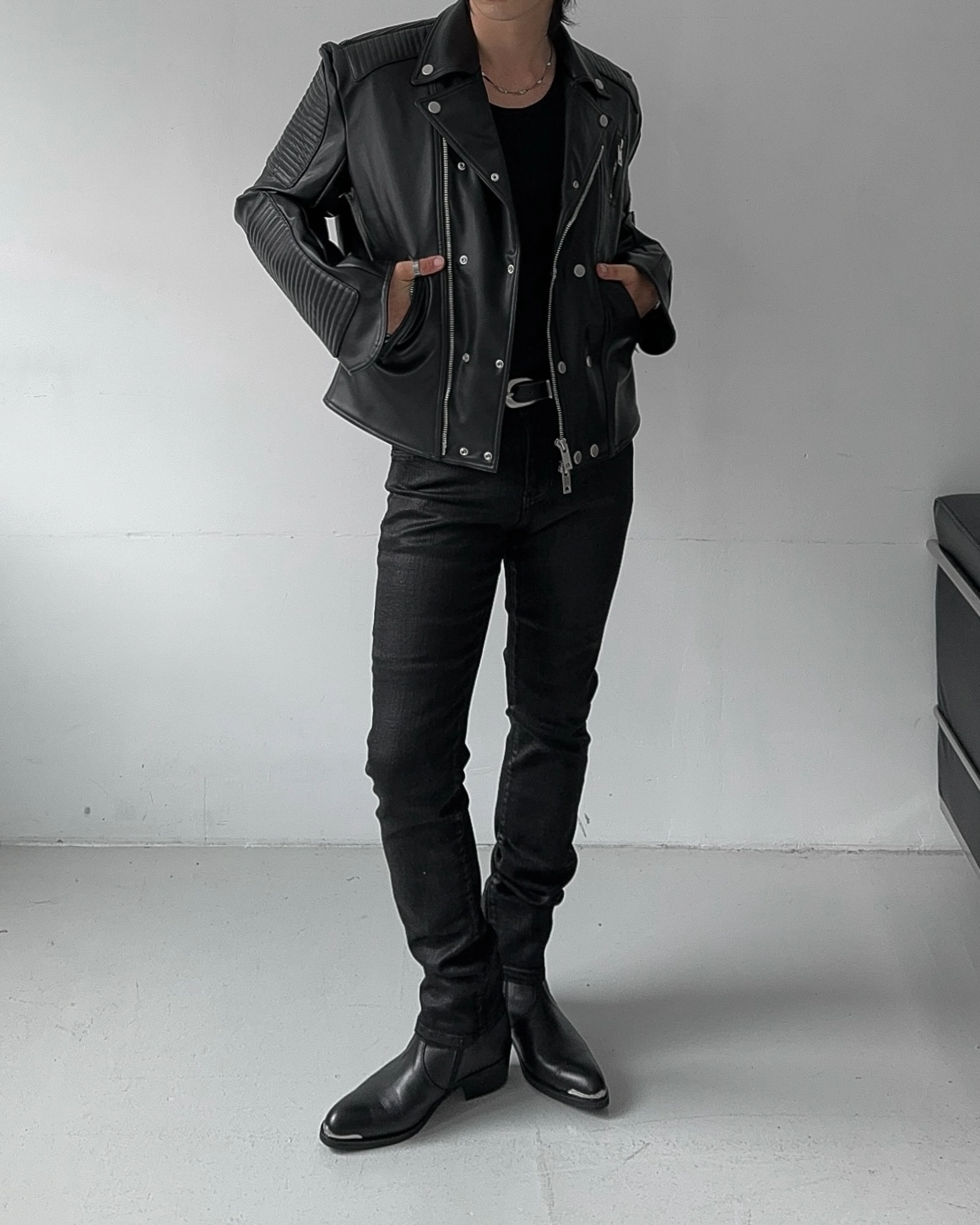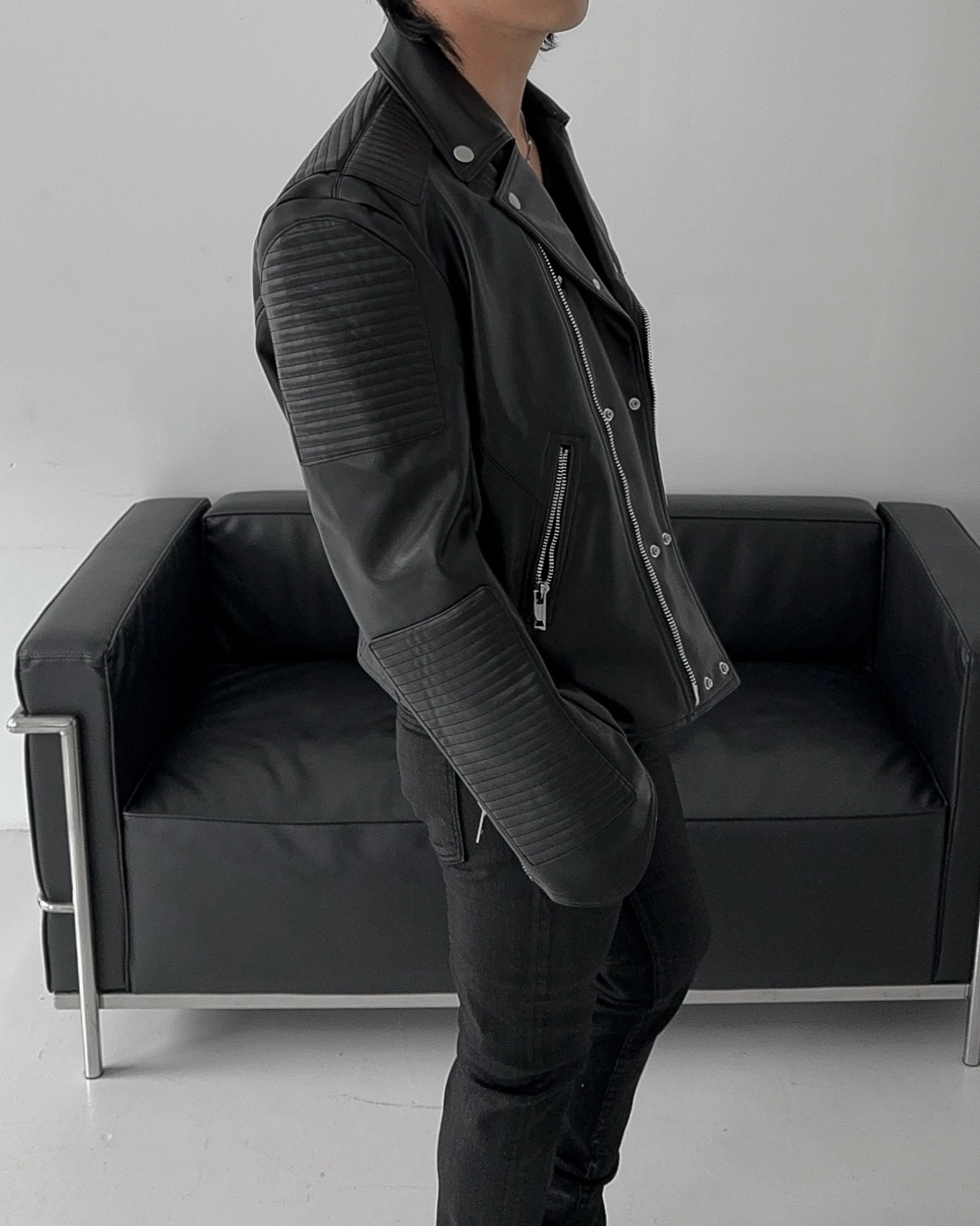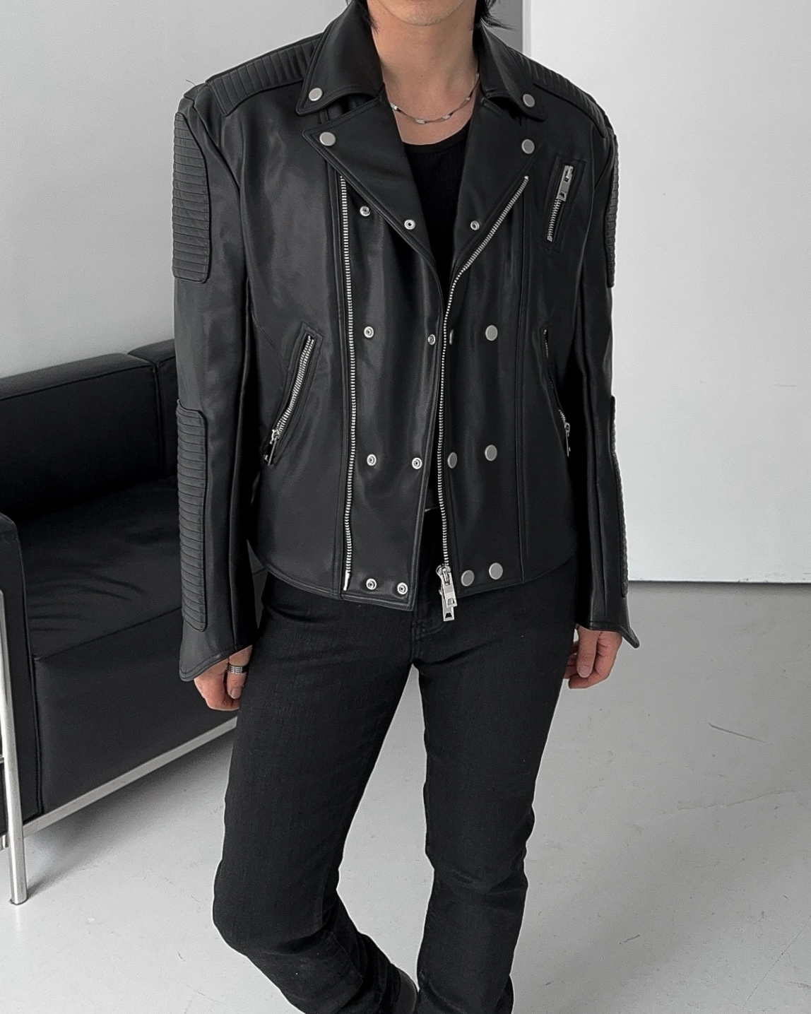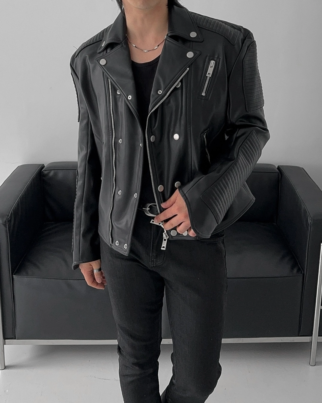 - 採用優質皮革面料製成的騎士夾克