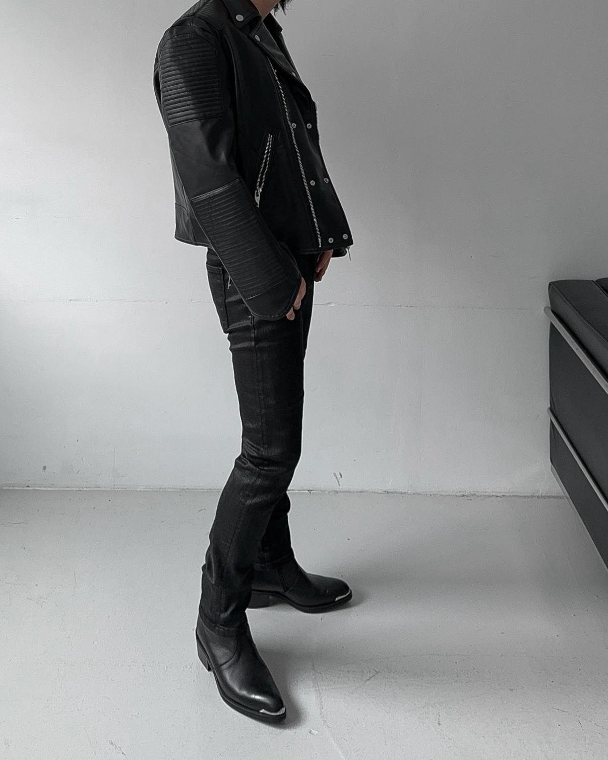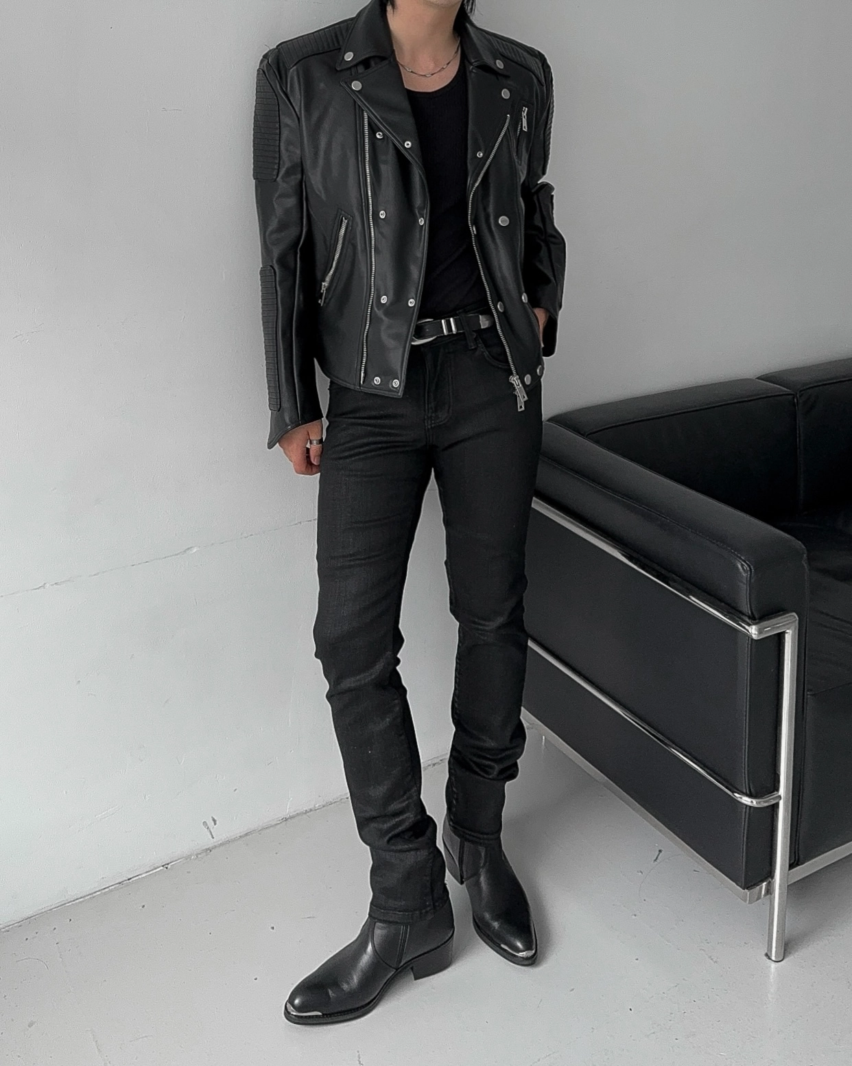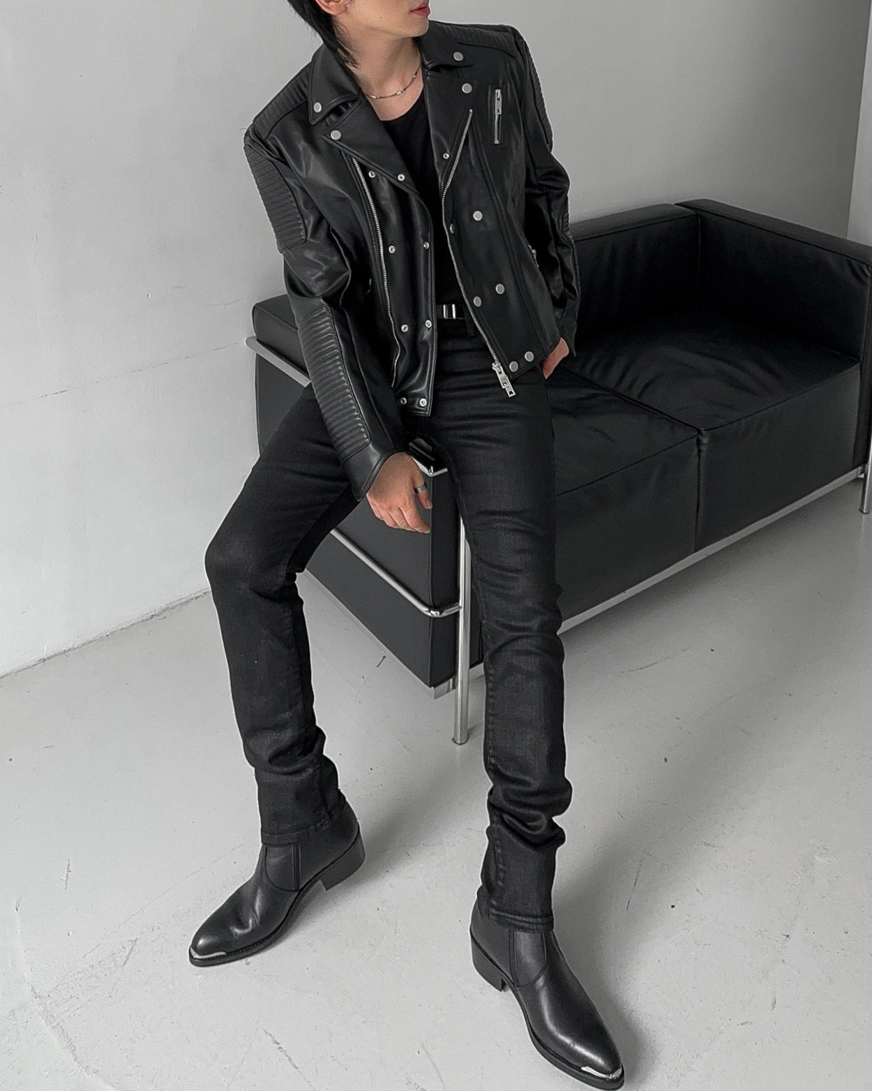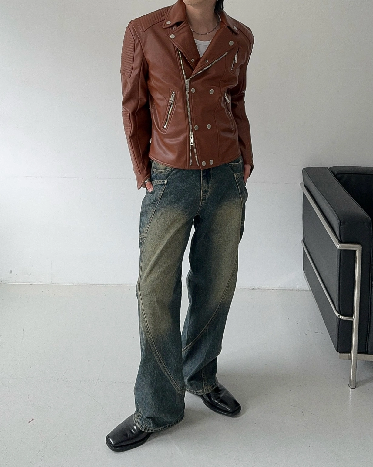 - 採用優質皮革面料製成的騎士夾克