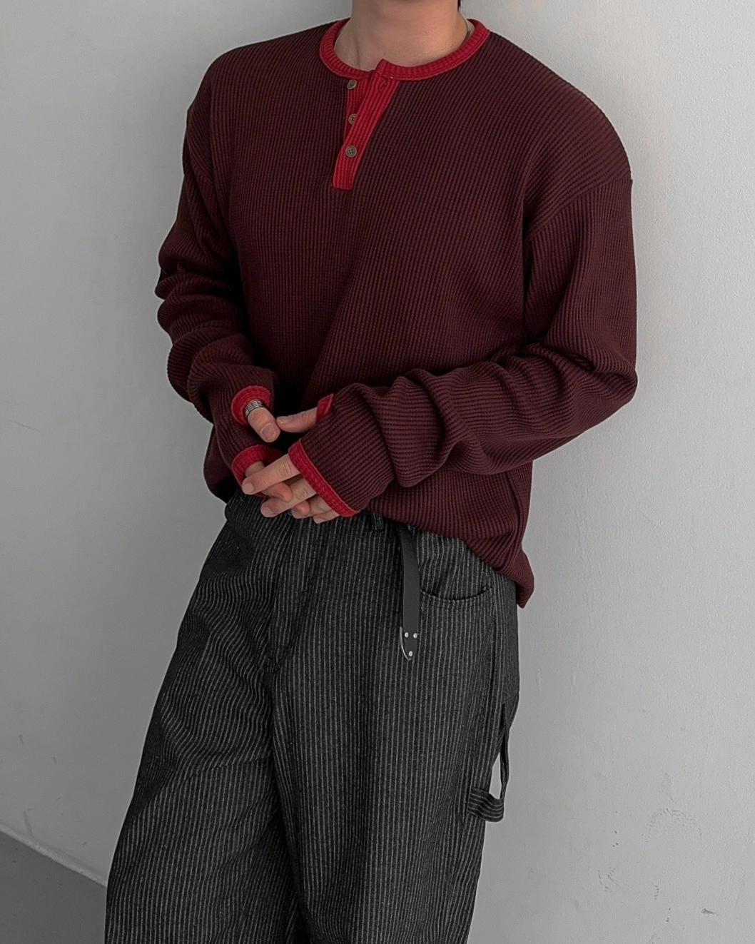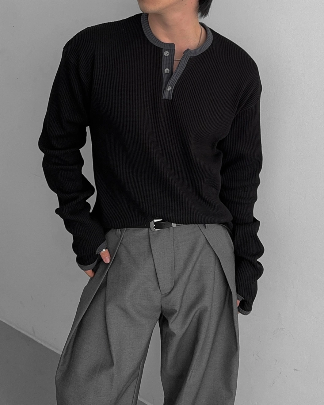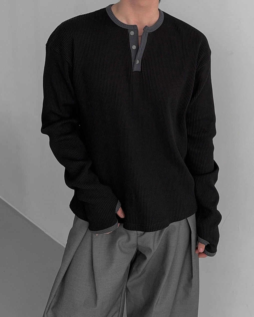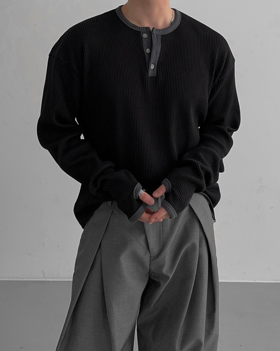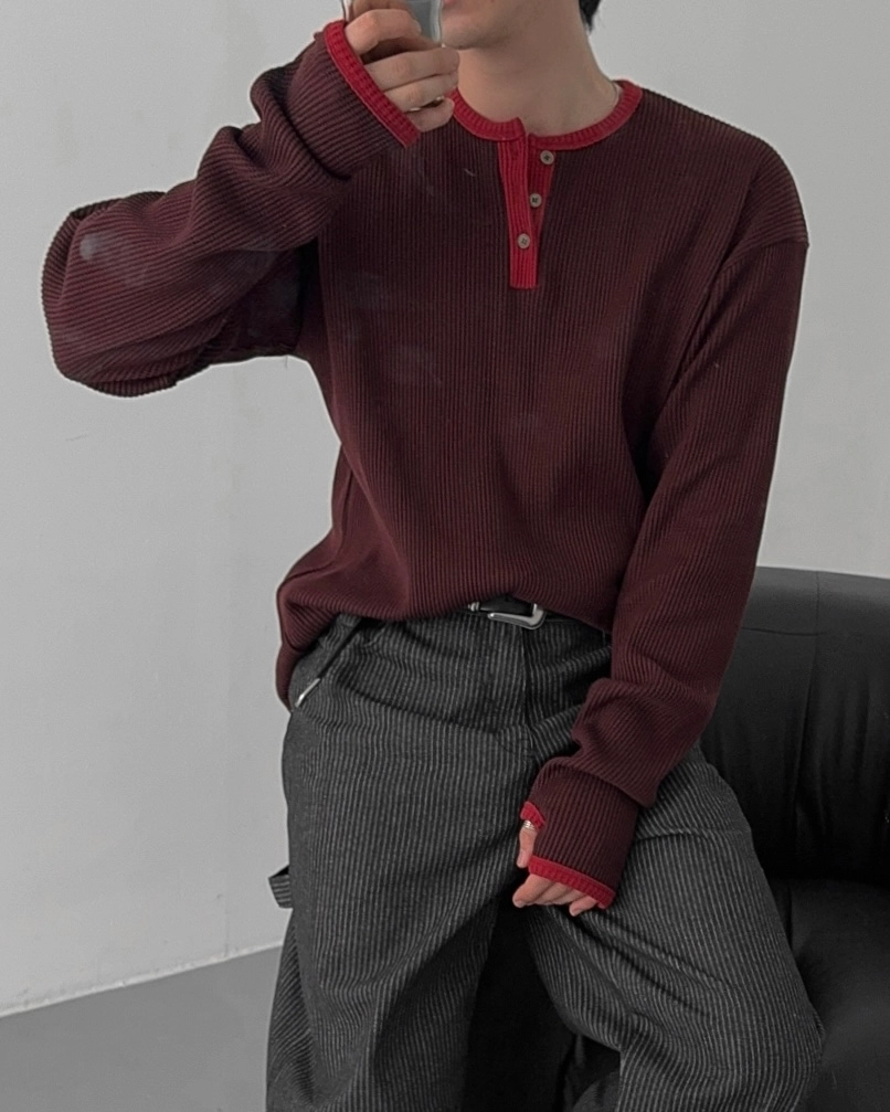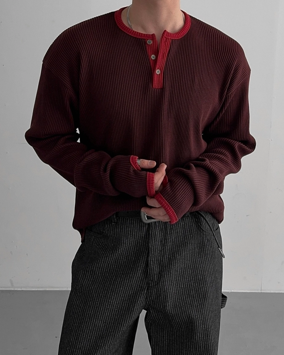 - 亨利領 T 卹採用密實的華夫格材質