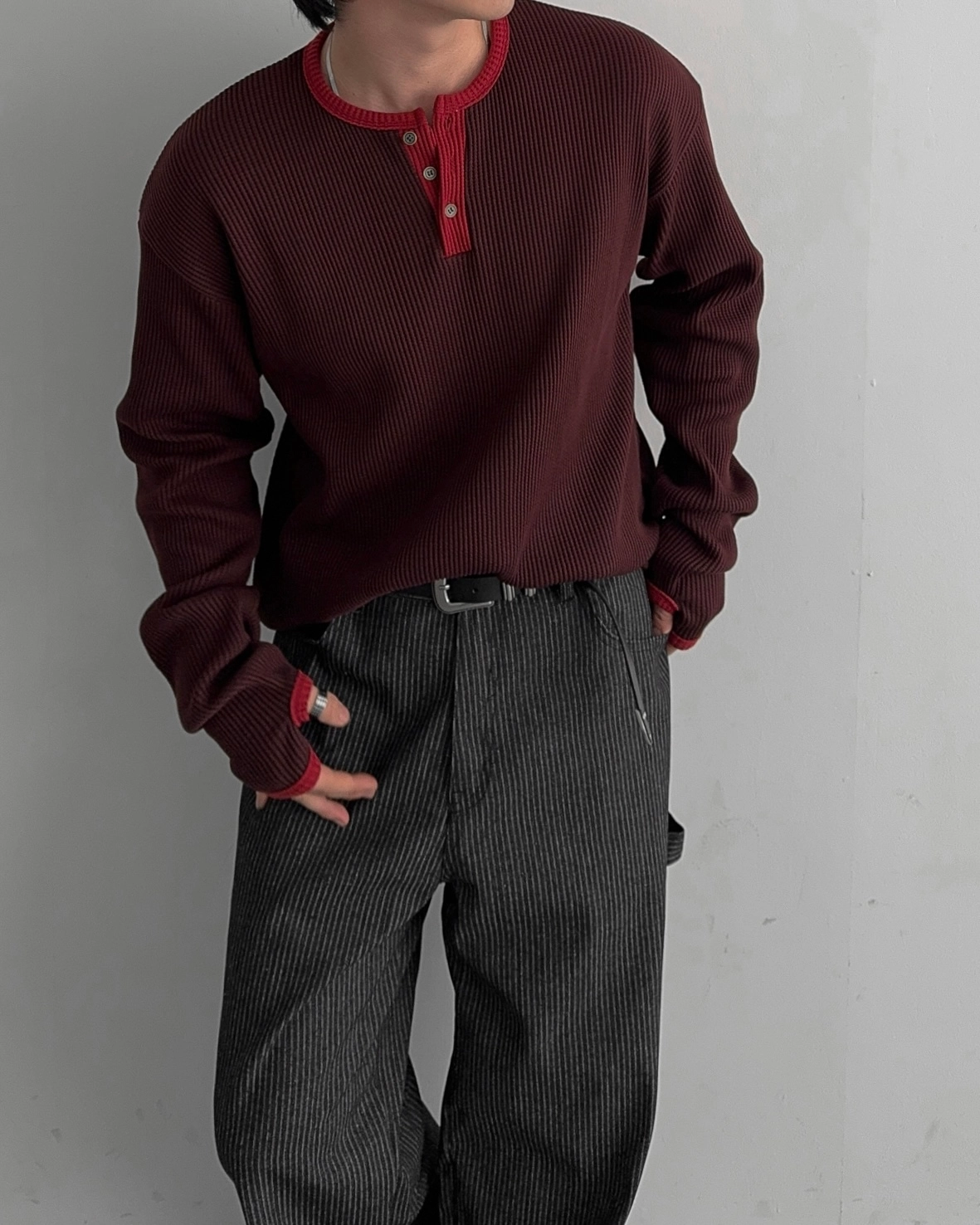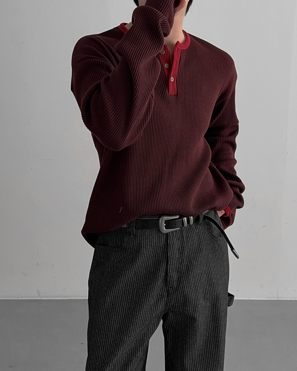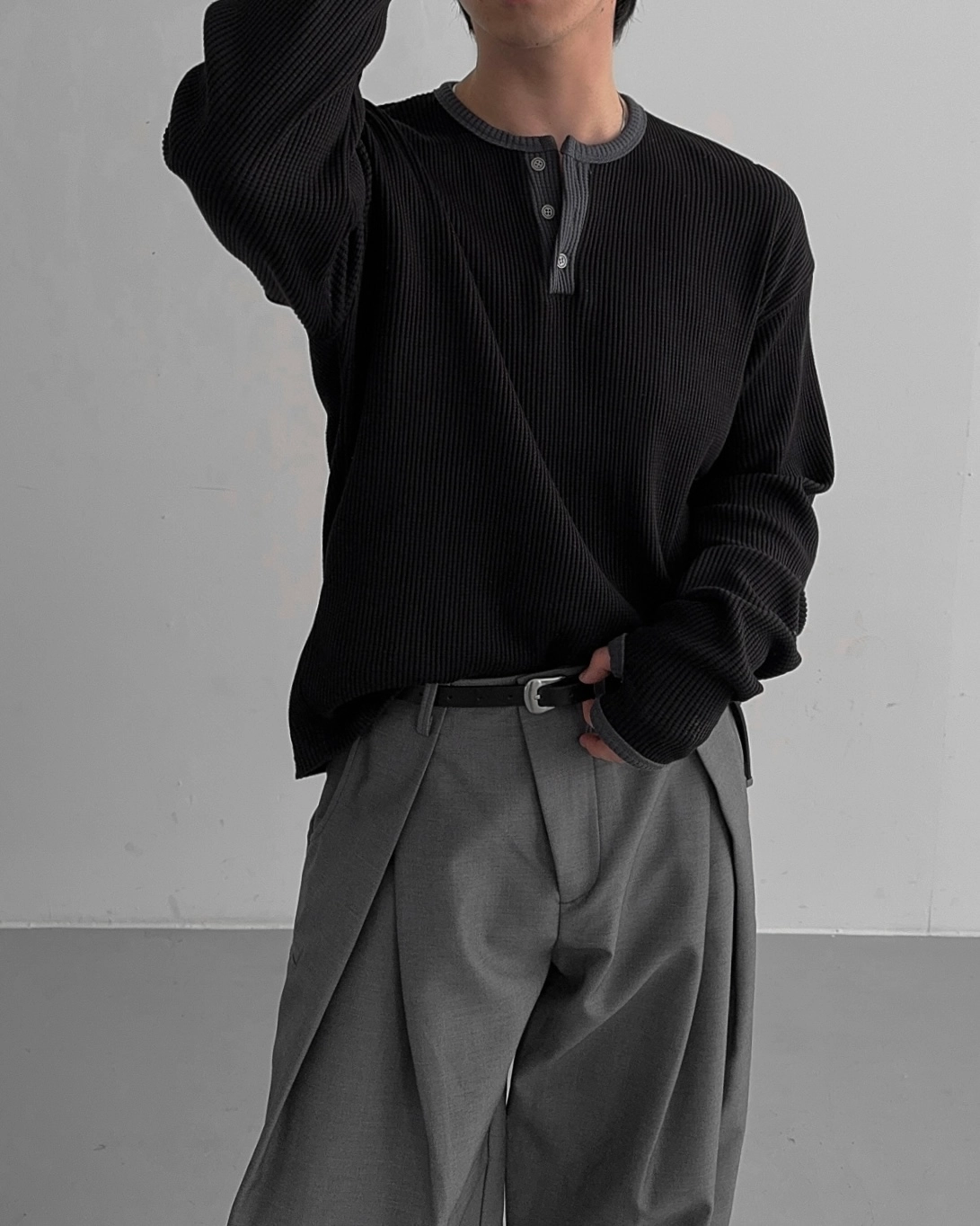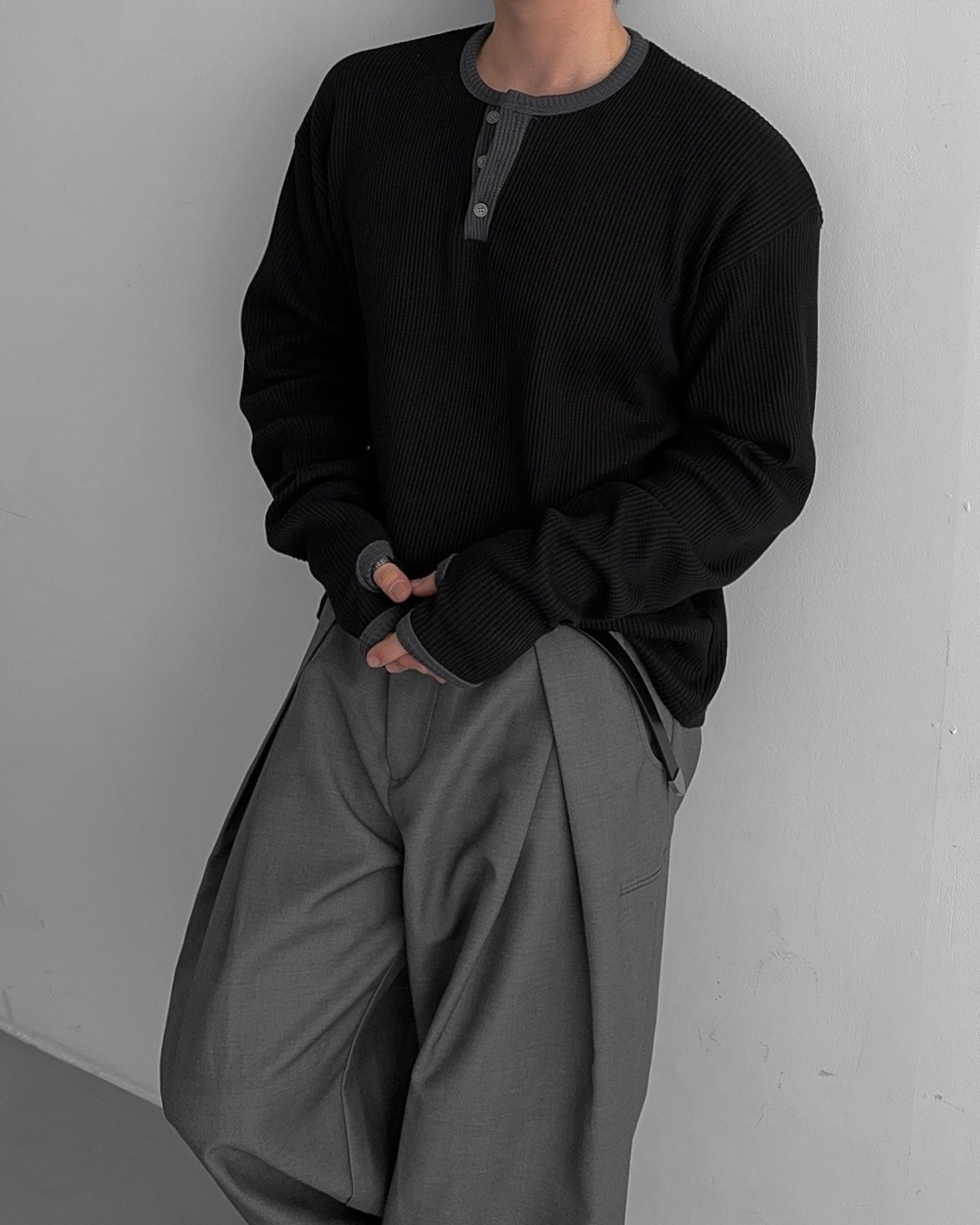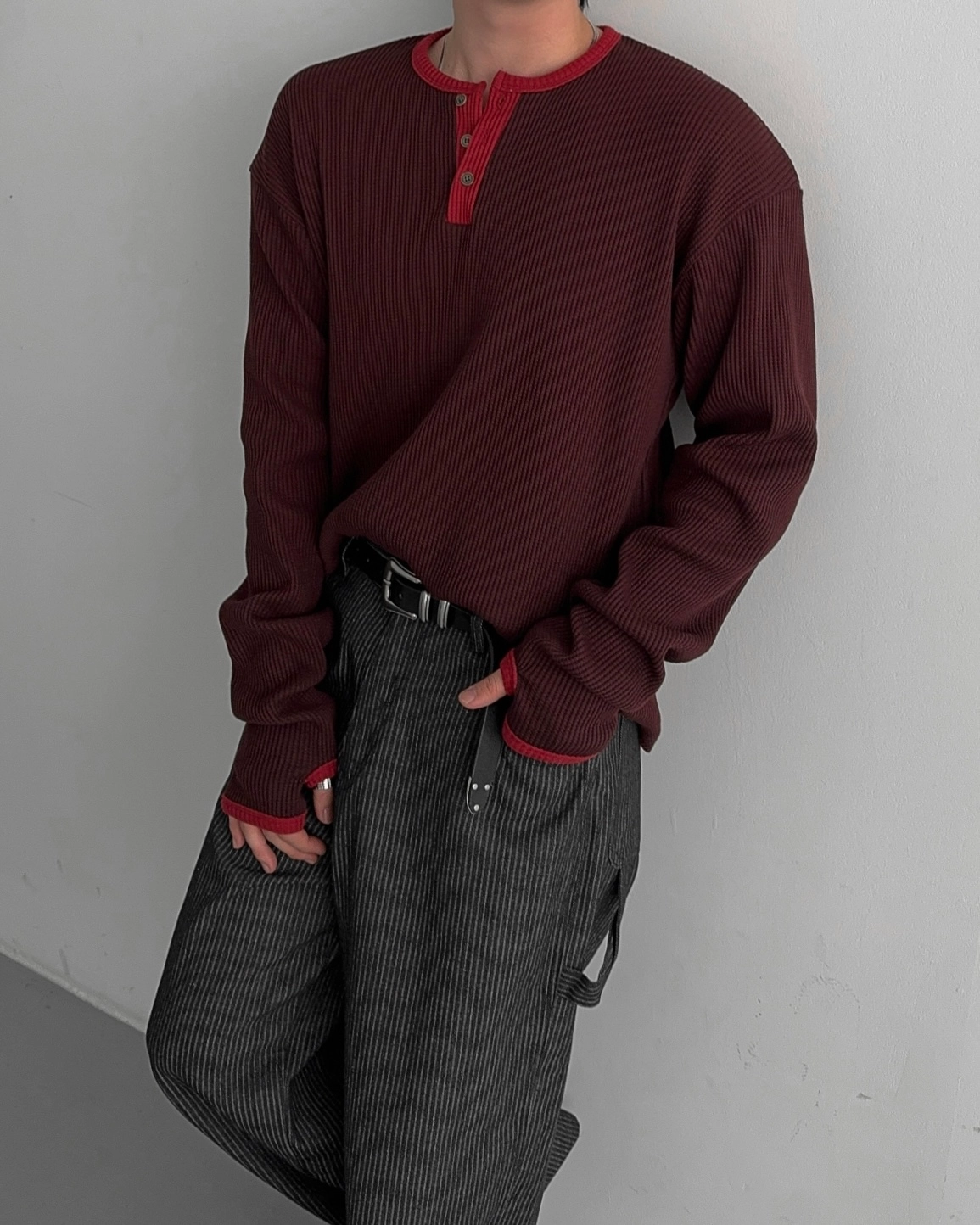 - 亨利領 T 卹採用密實的華夫格材質