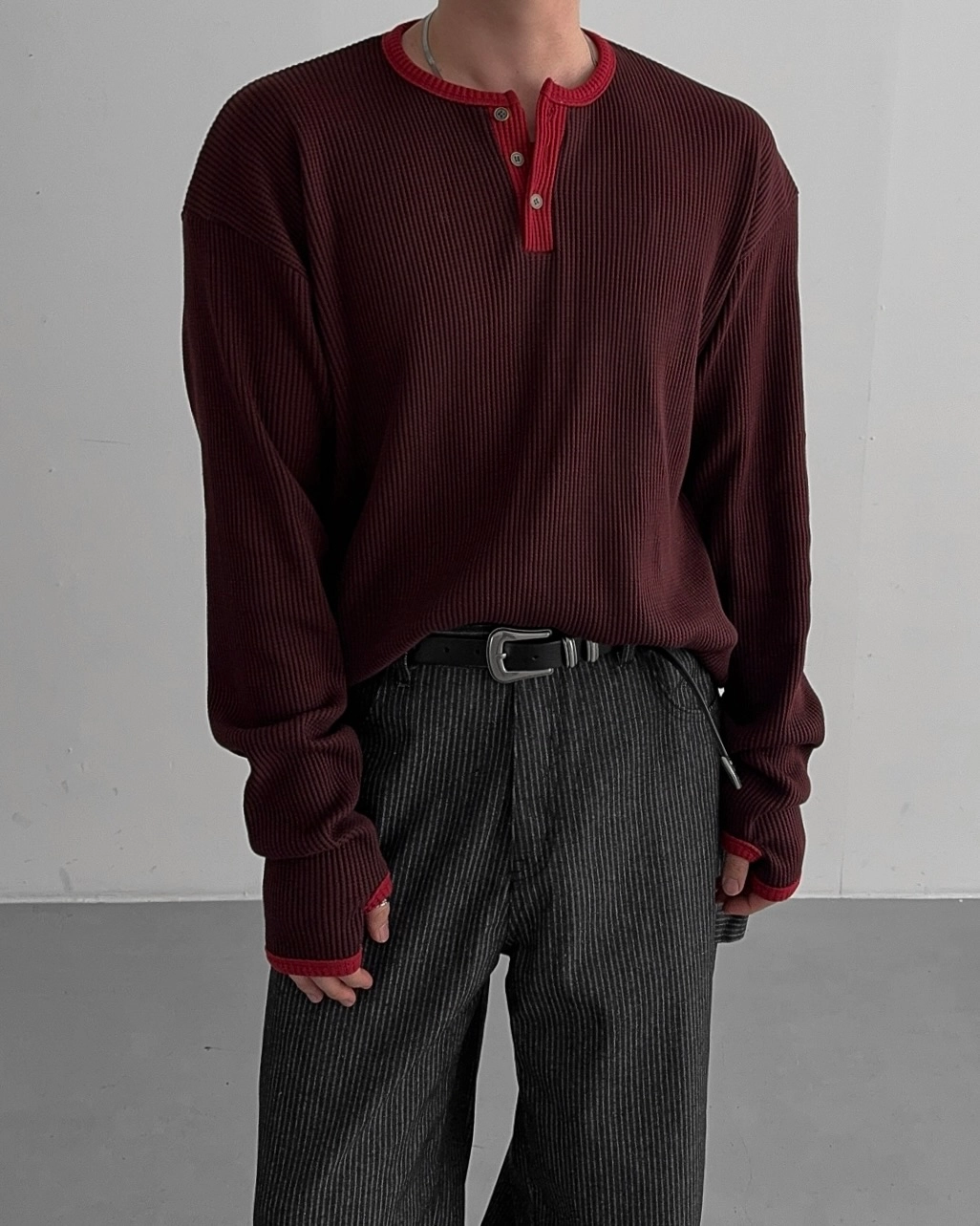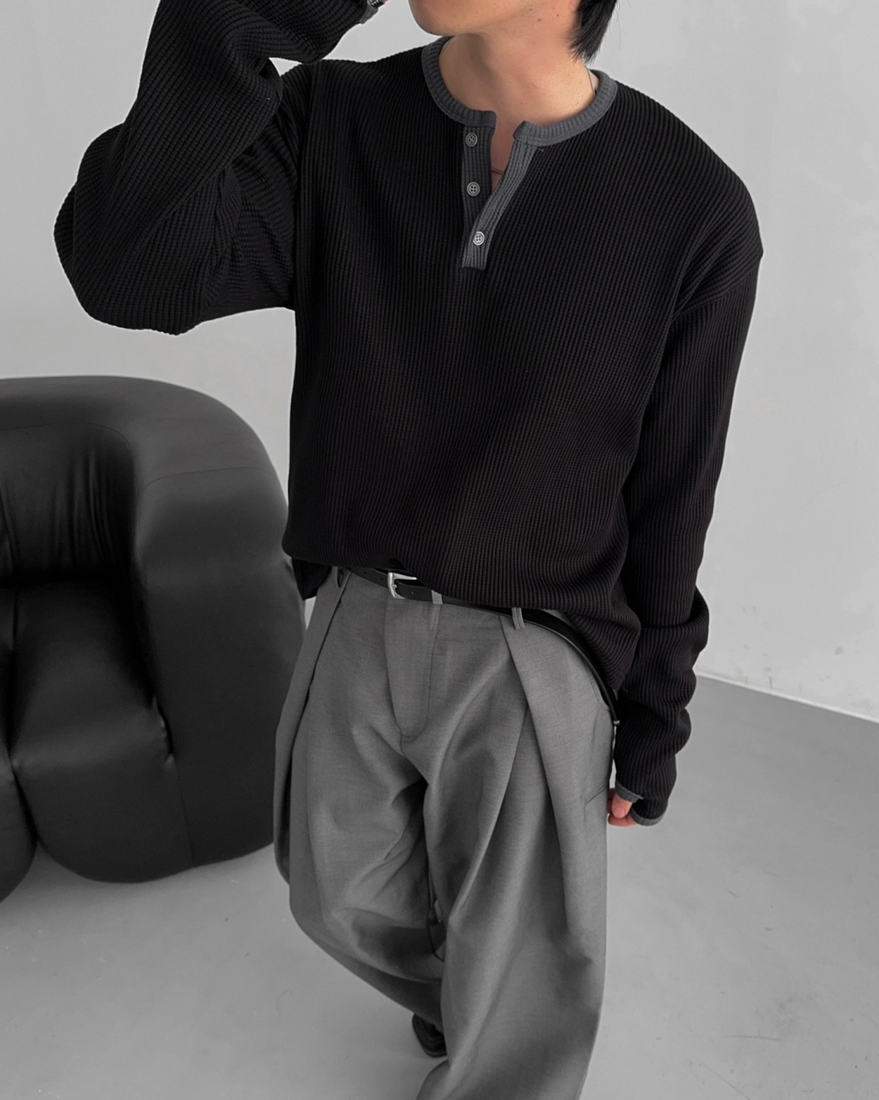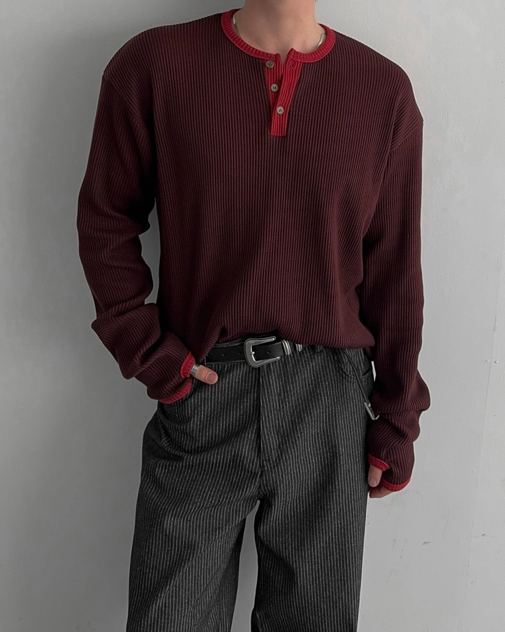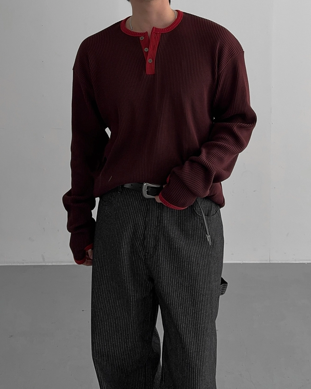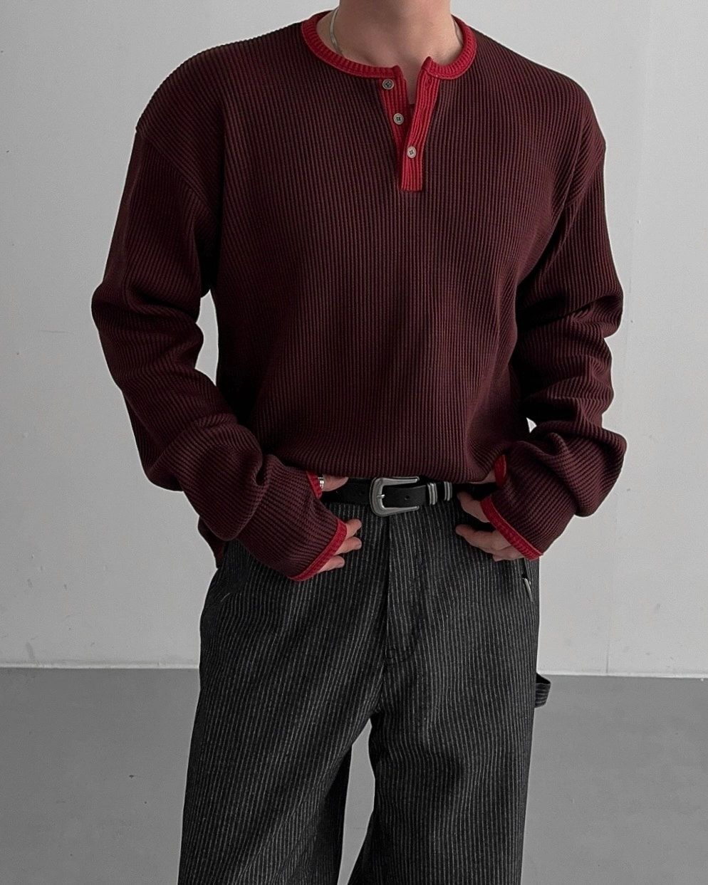 - 亨利領 T 卹採用密實的華夫格材質