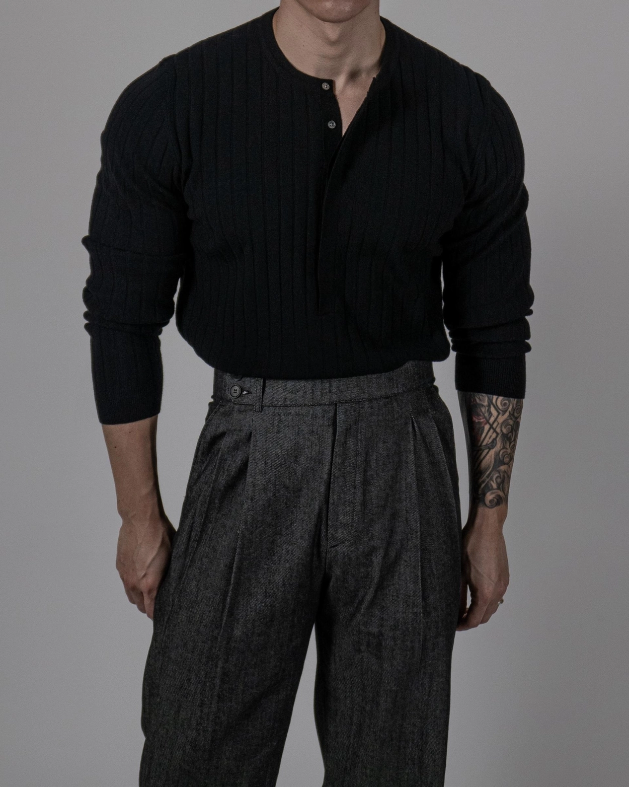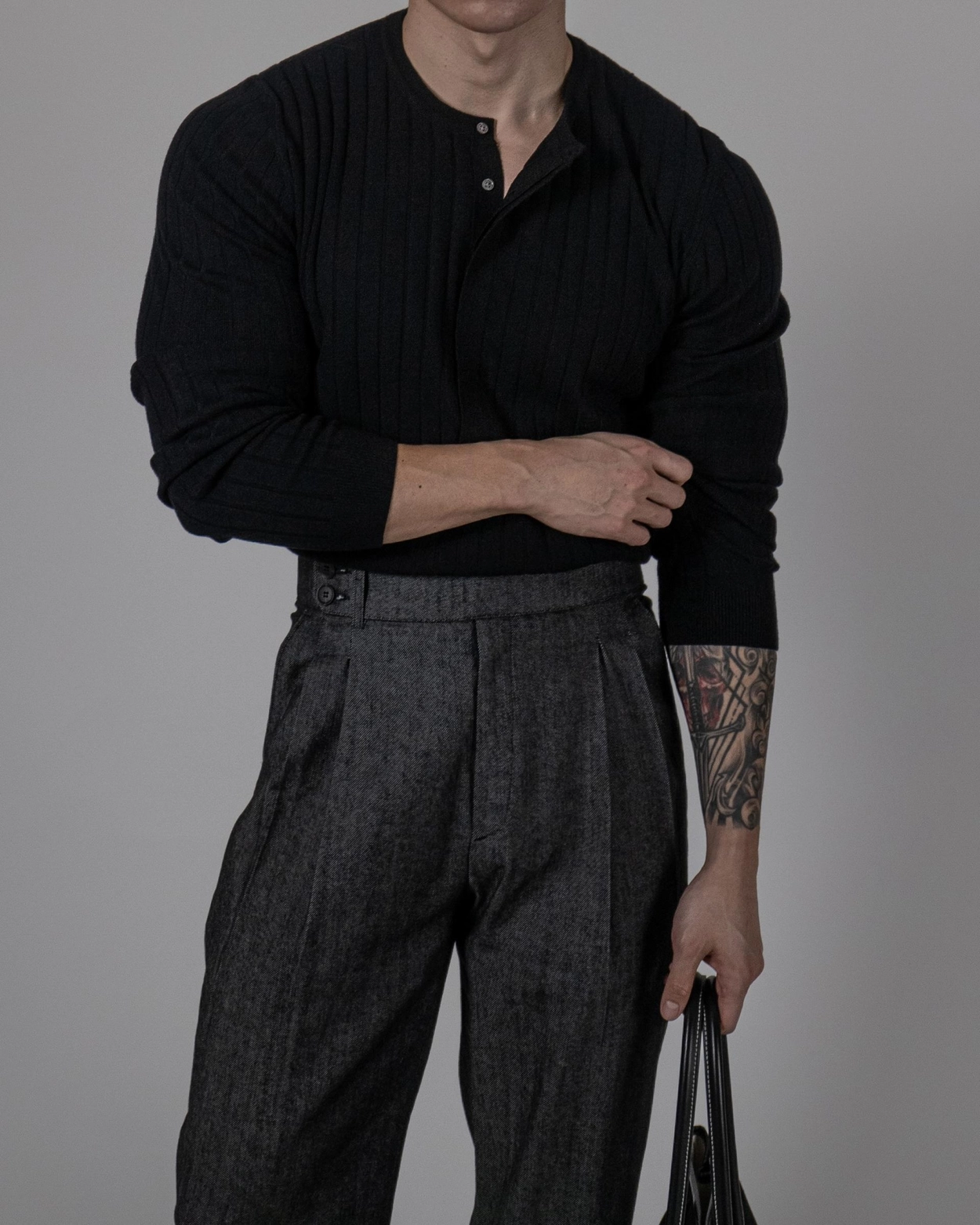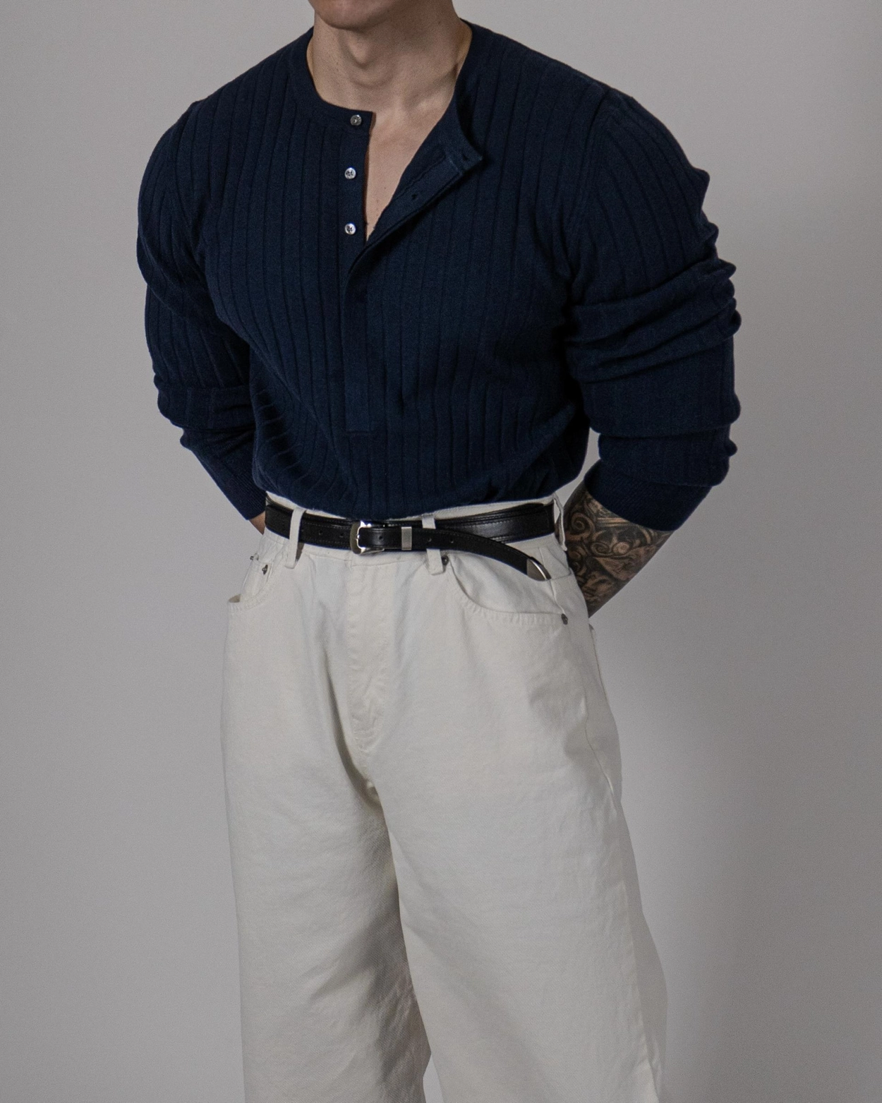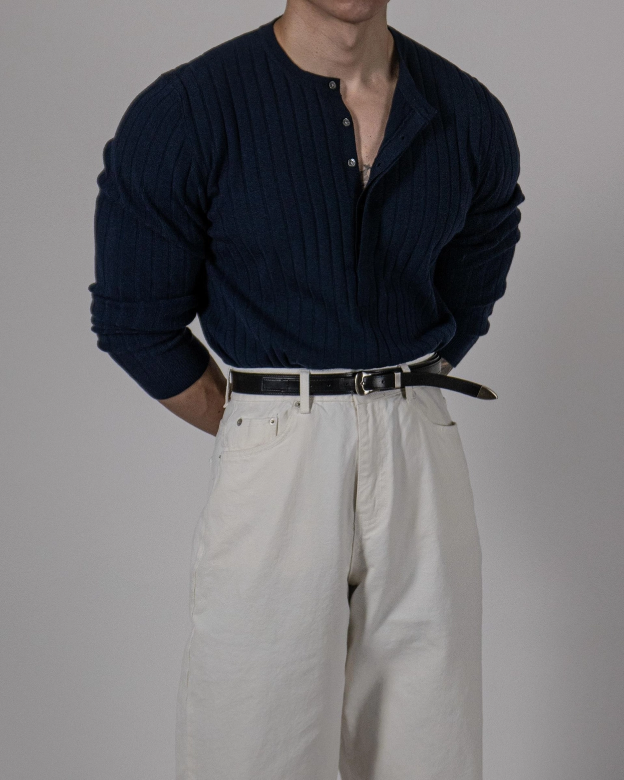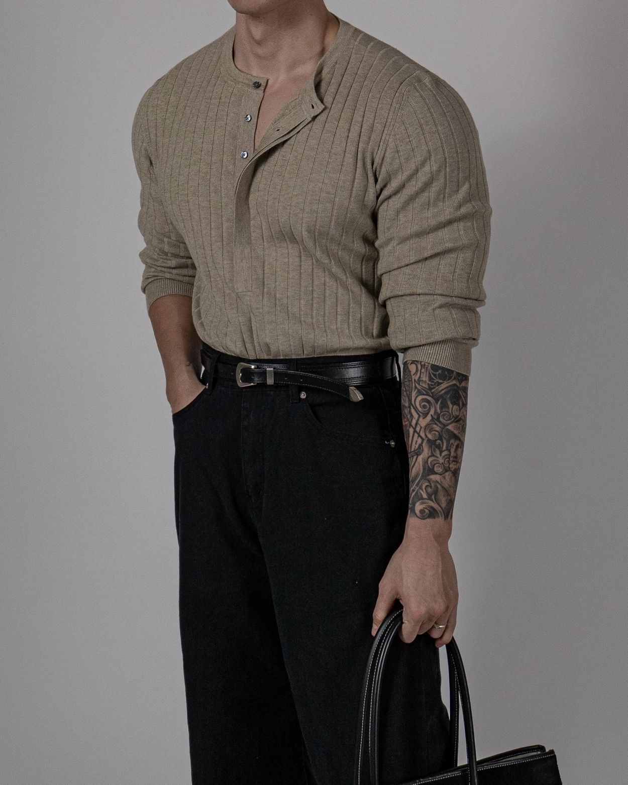 - 這是一款觸感柔軟的羅紋亨利領針織衫,採用羊絨替代紗線製成:)