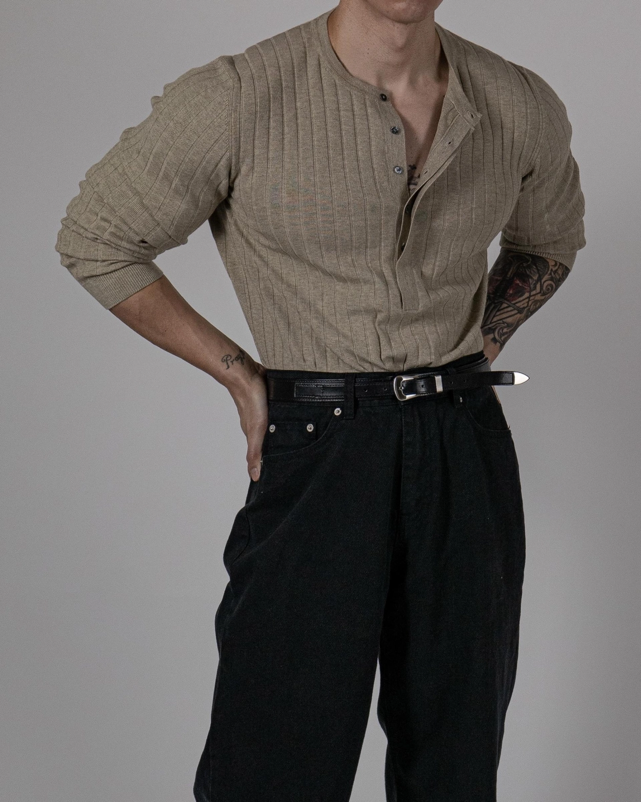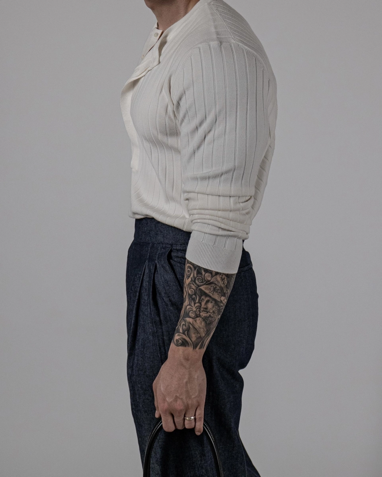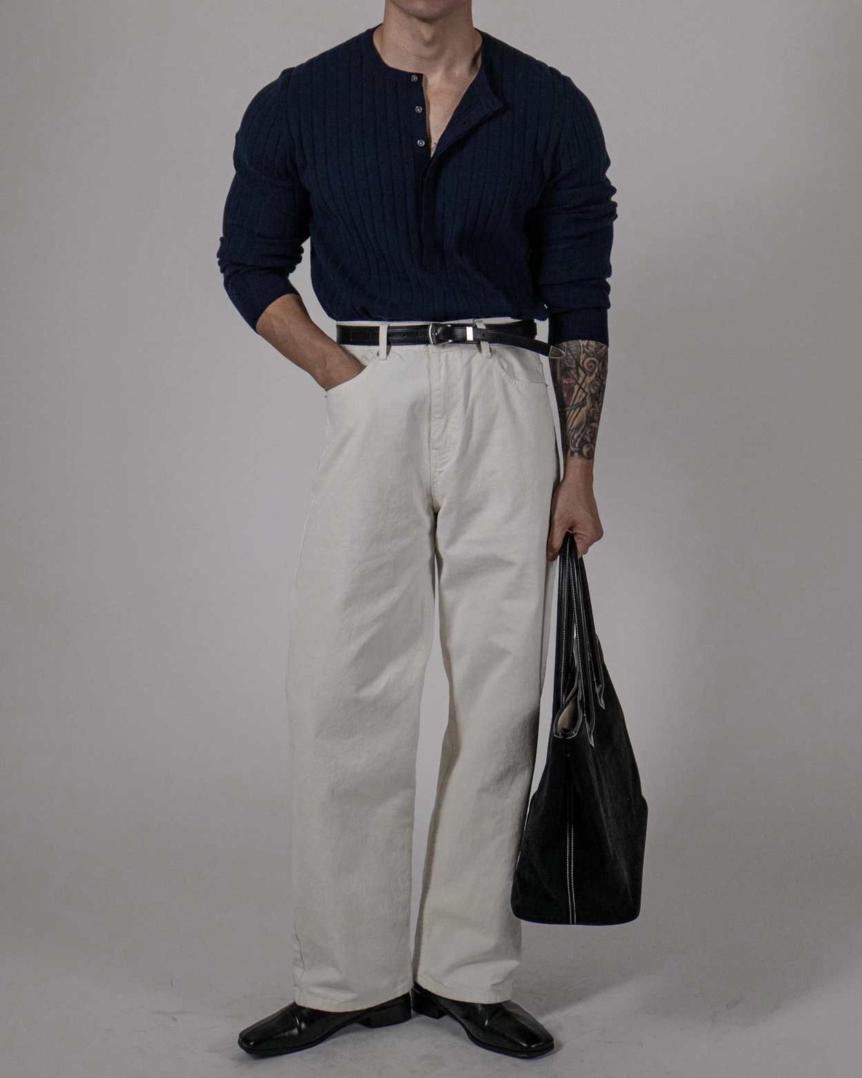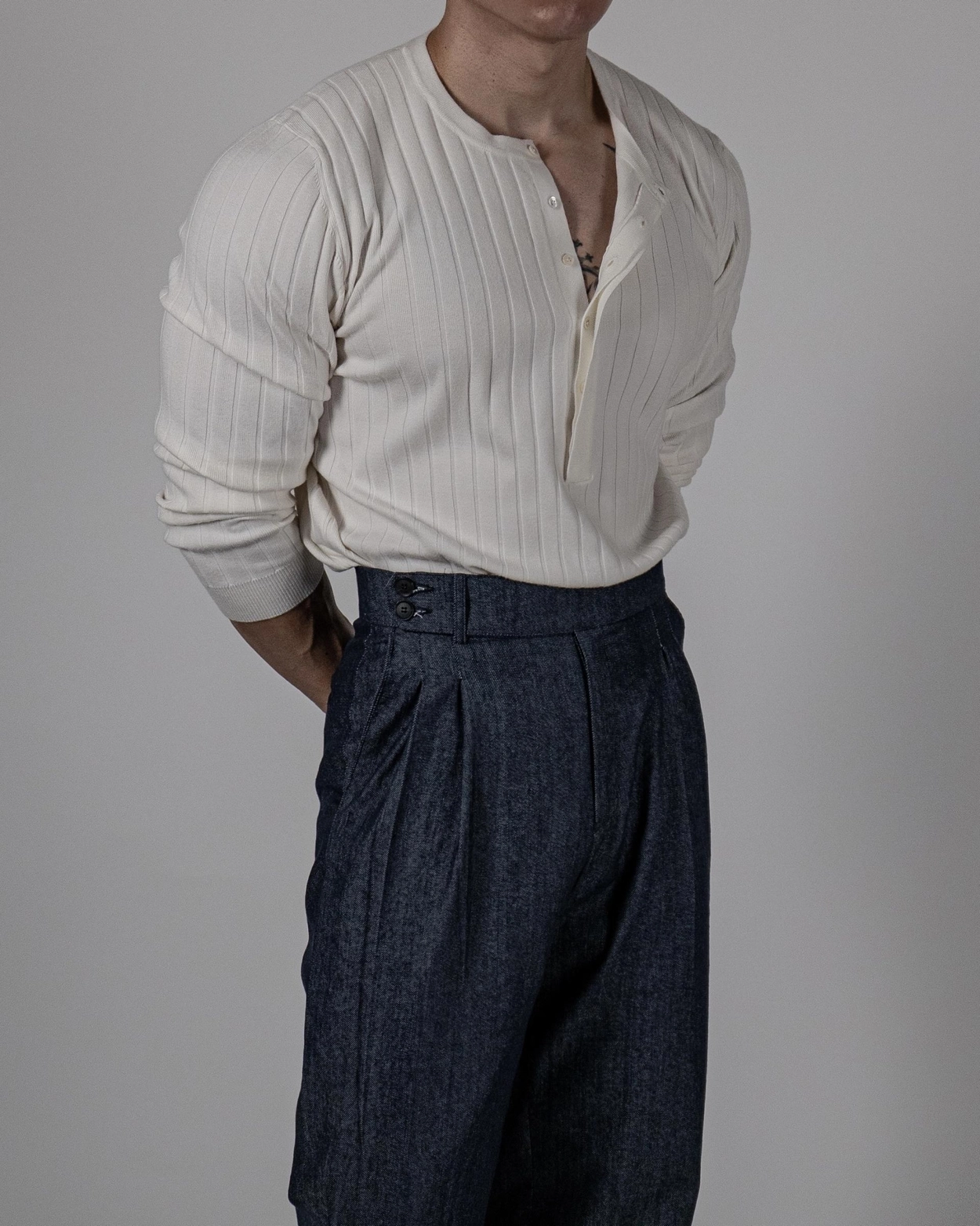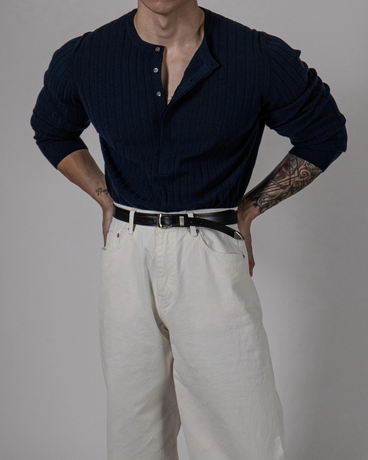 - 這是一款觸感柔軟的羅紋亨利領針織衫,採用羊絨替代紗線製成:)