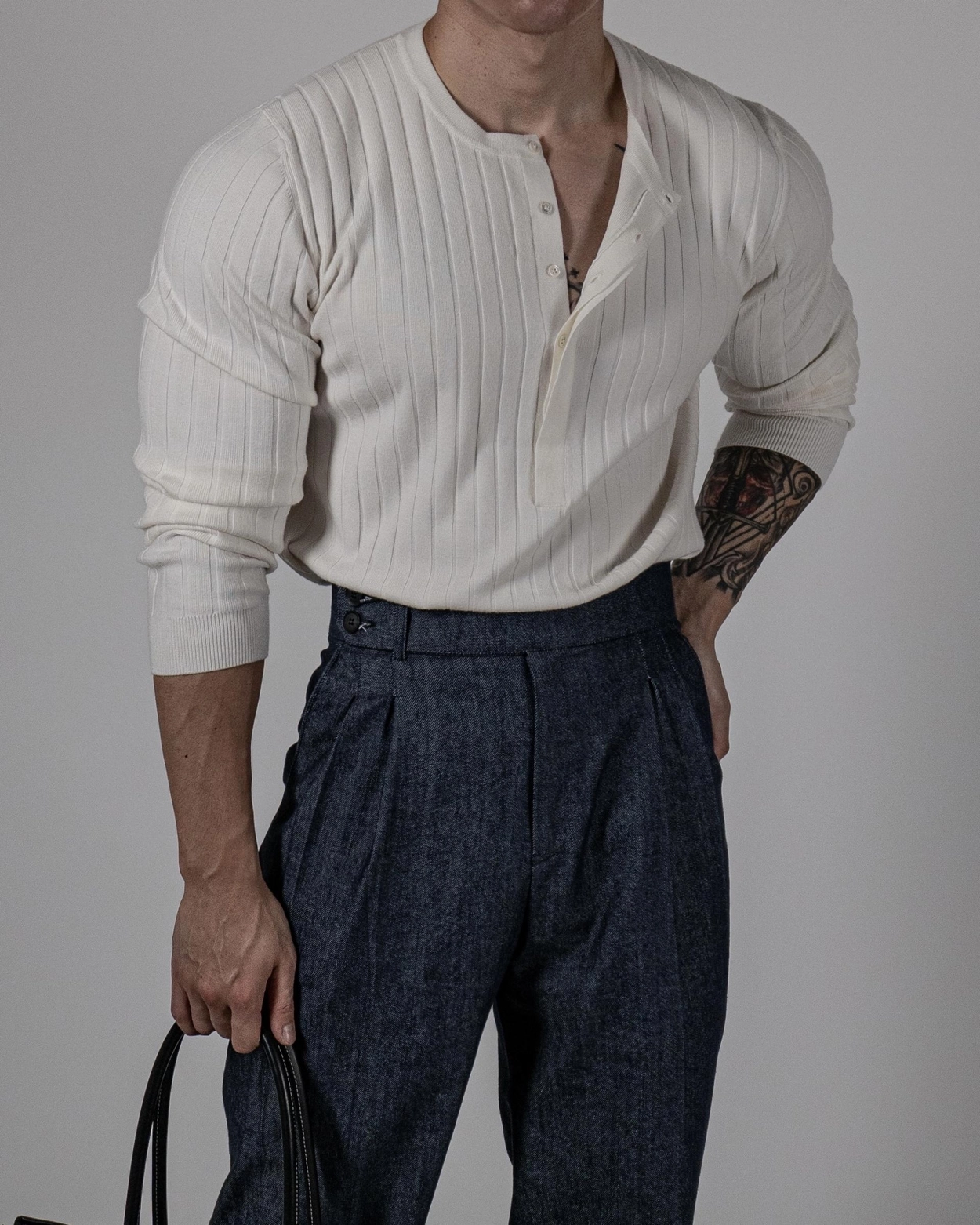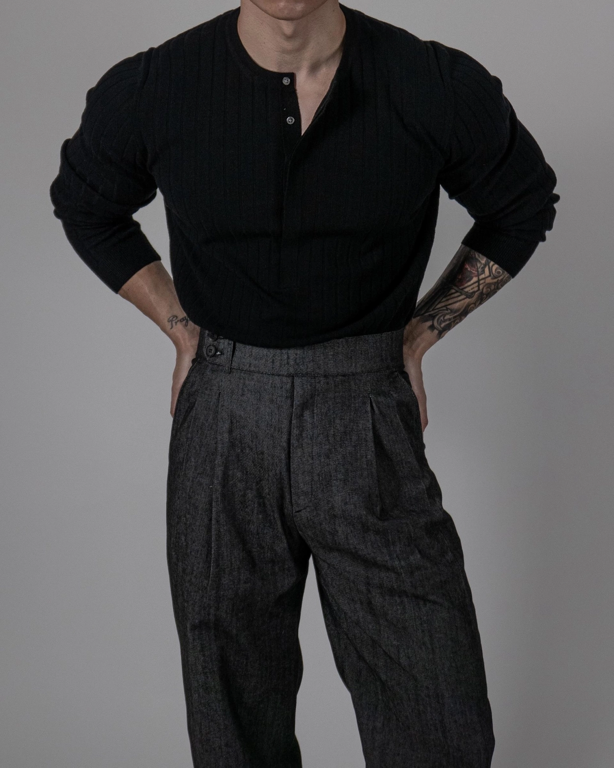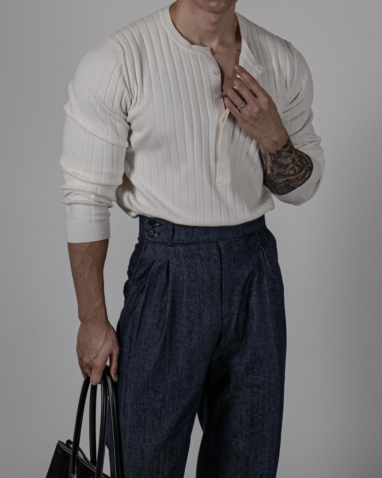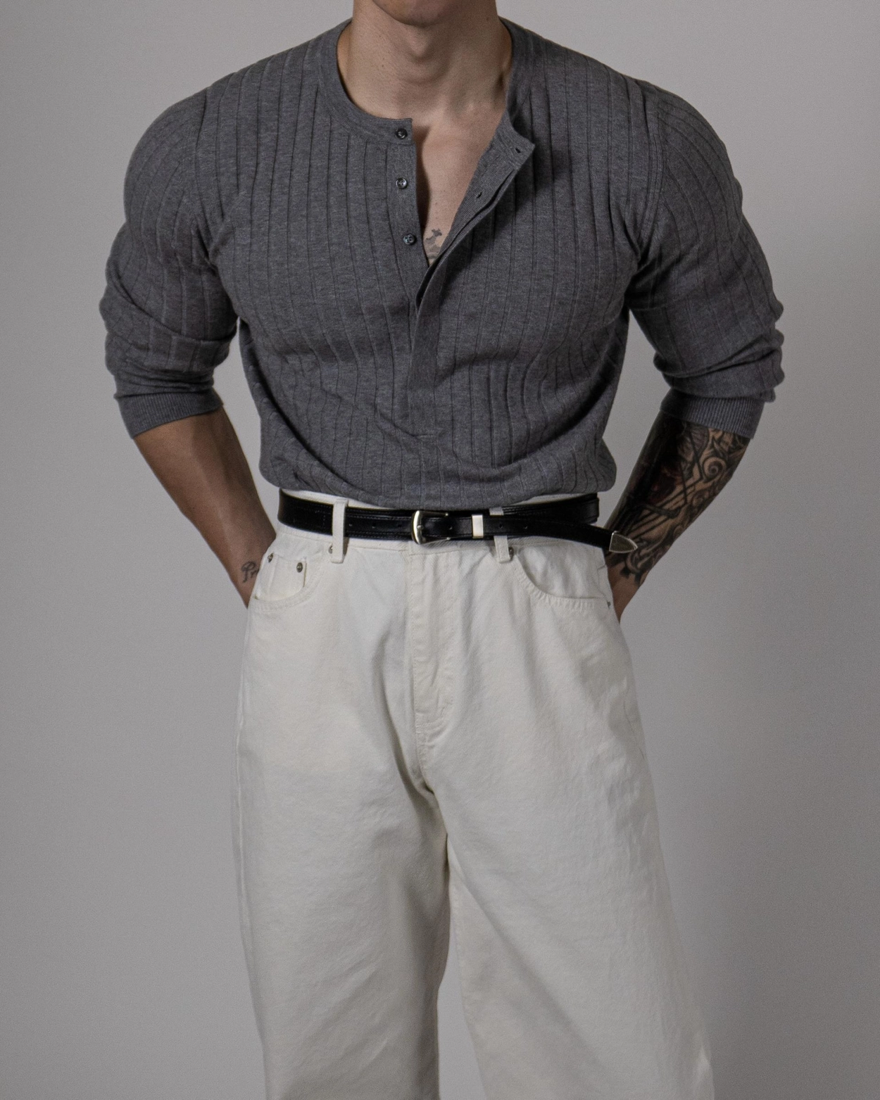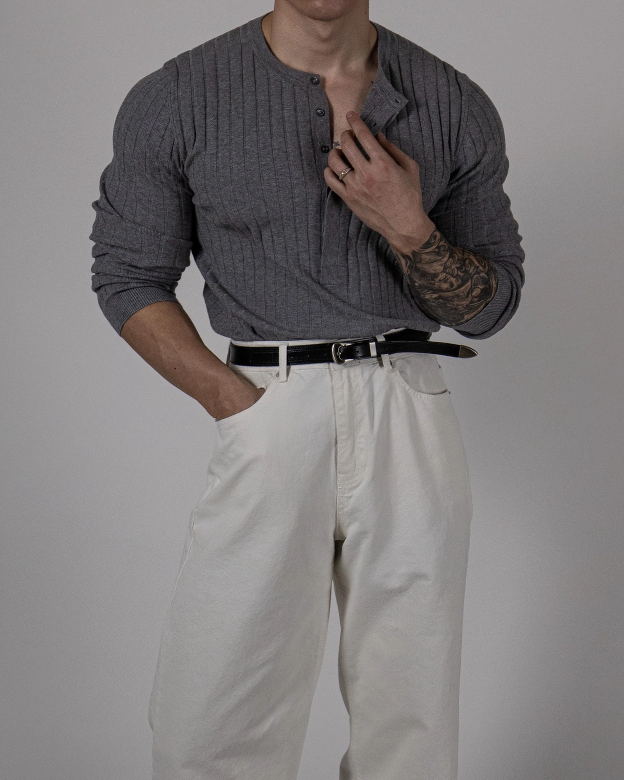 - 這是一款觸感柔軟的羅紋亨利領針織衫,採用羊絨替代紗線製成:)