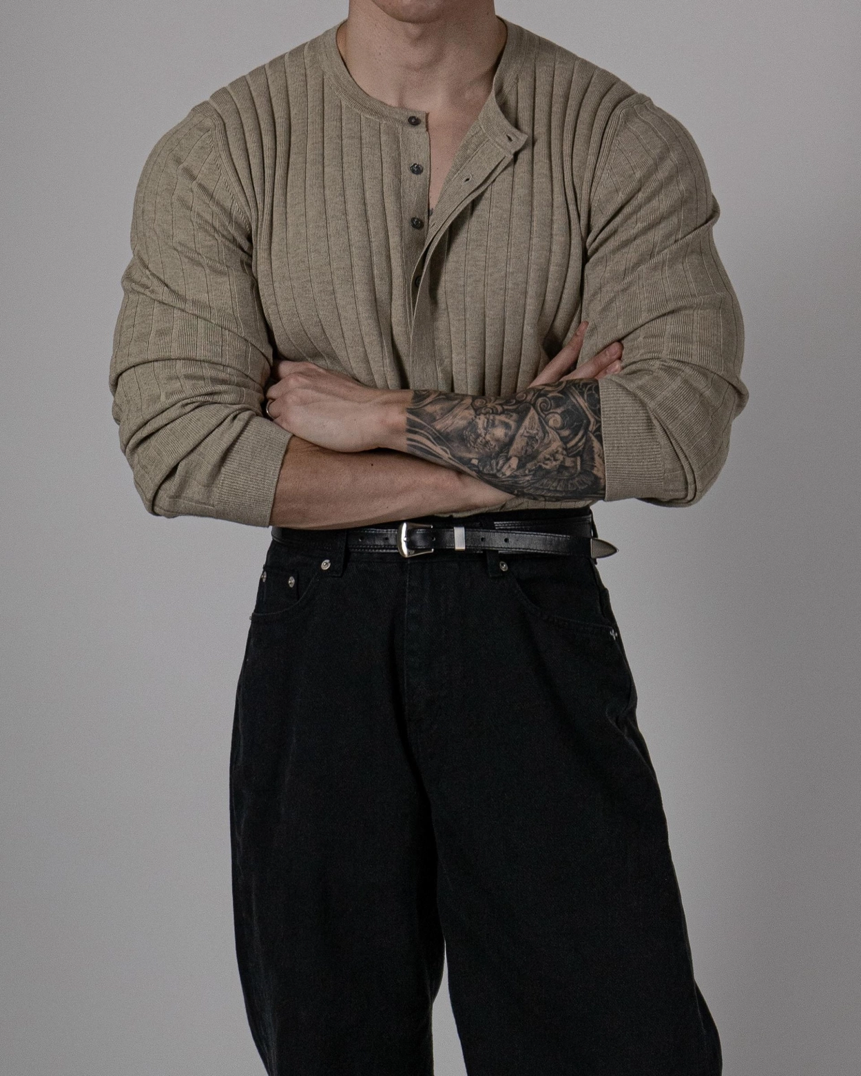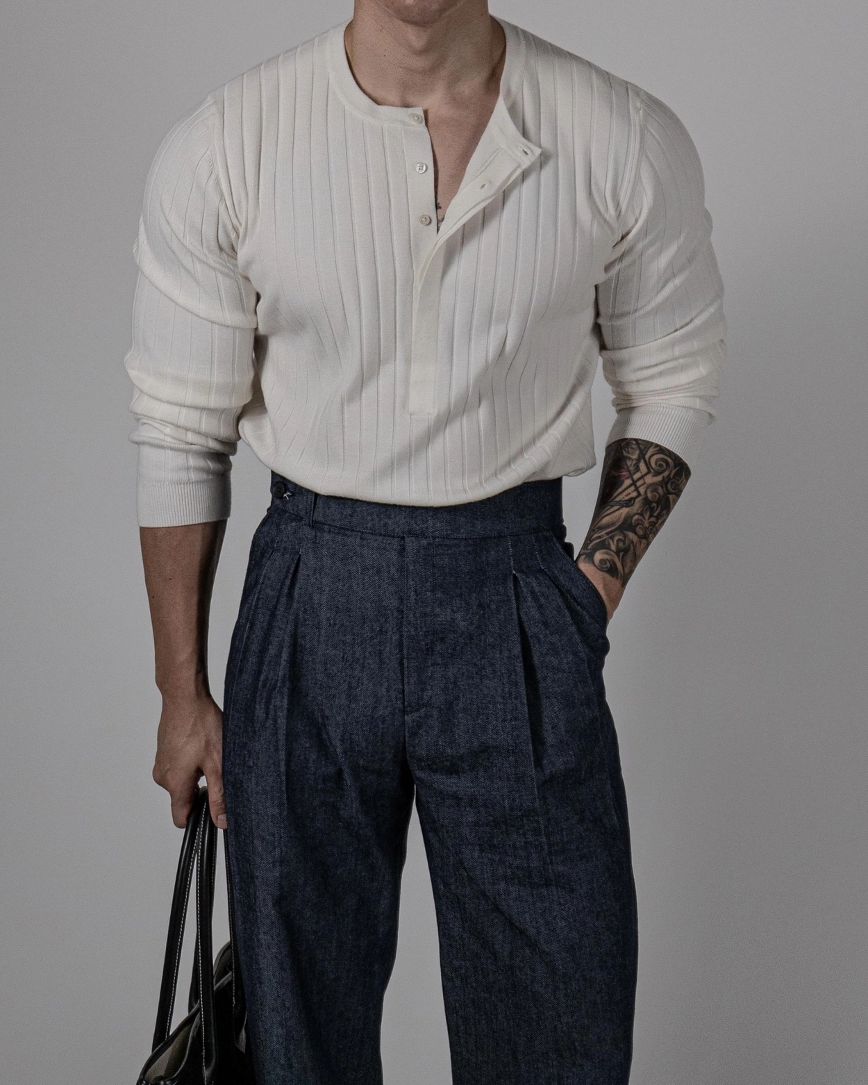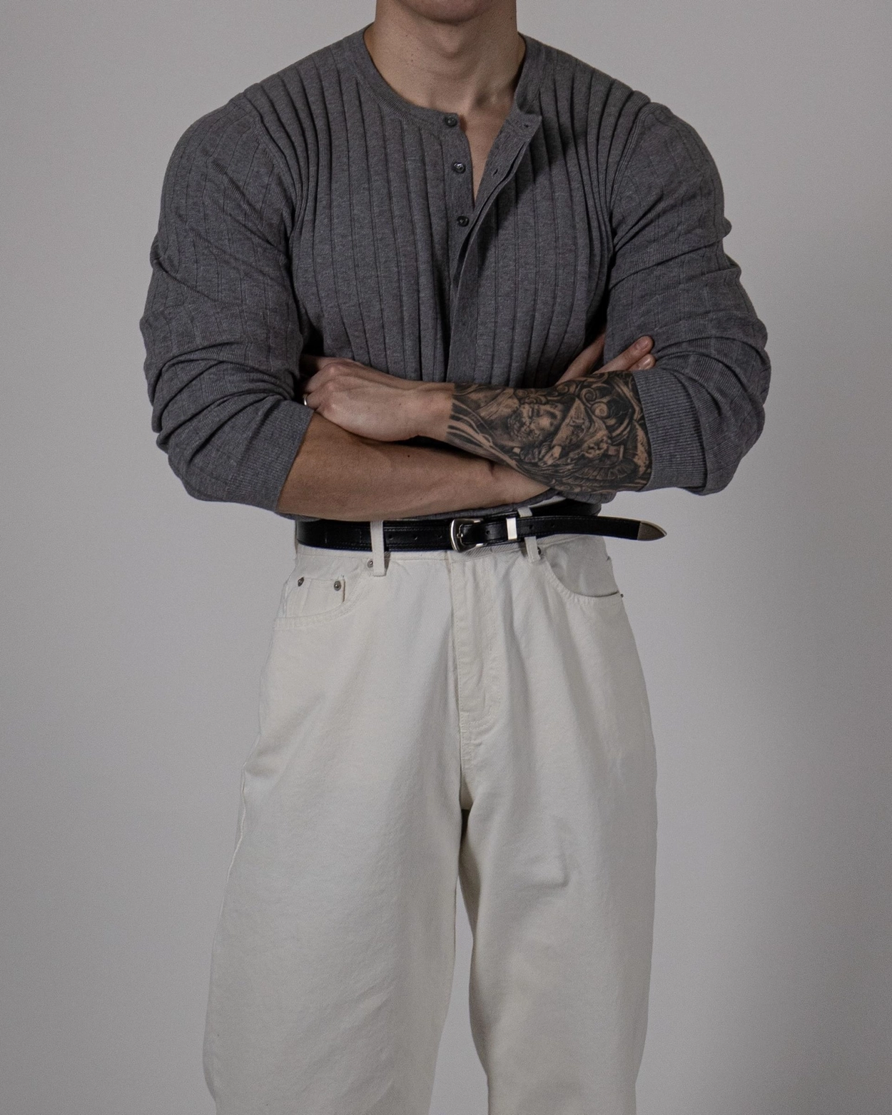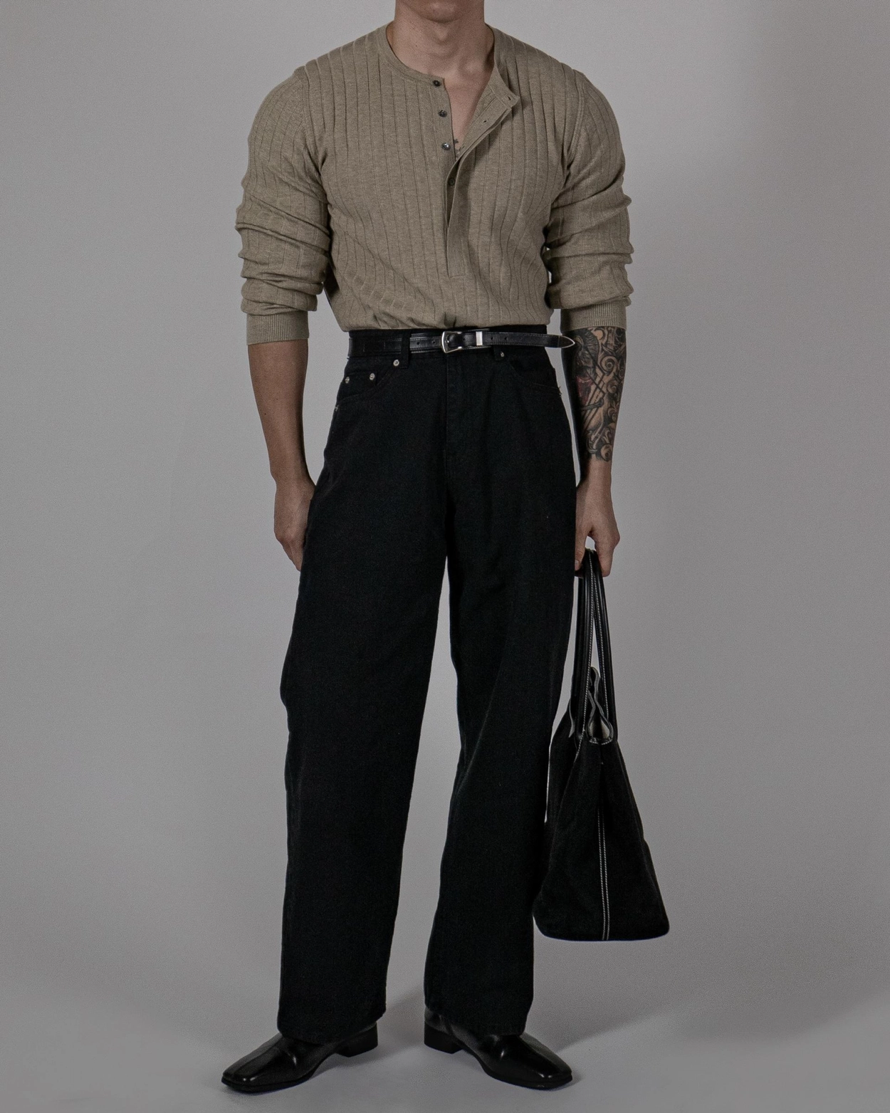 - 這是一款觸感柔軟的羅紋亨利領針織衫,採用羊絨替代紗線製成:)