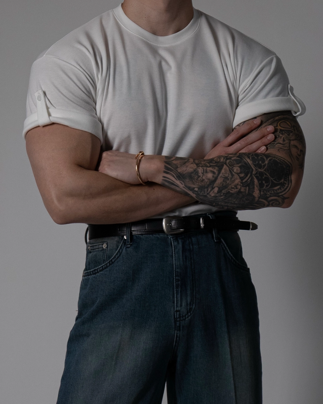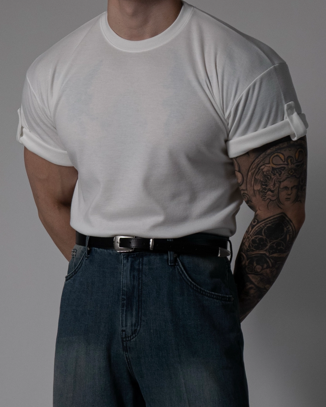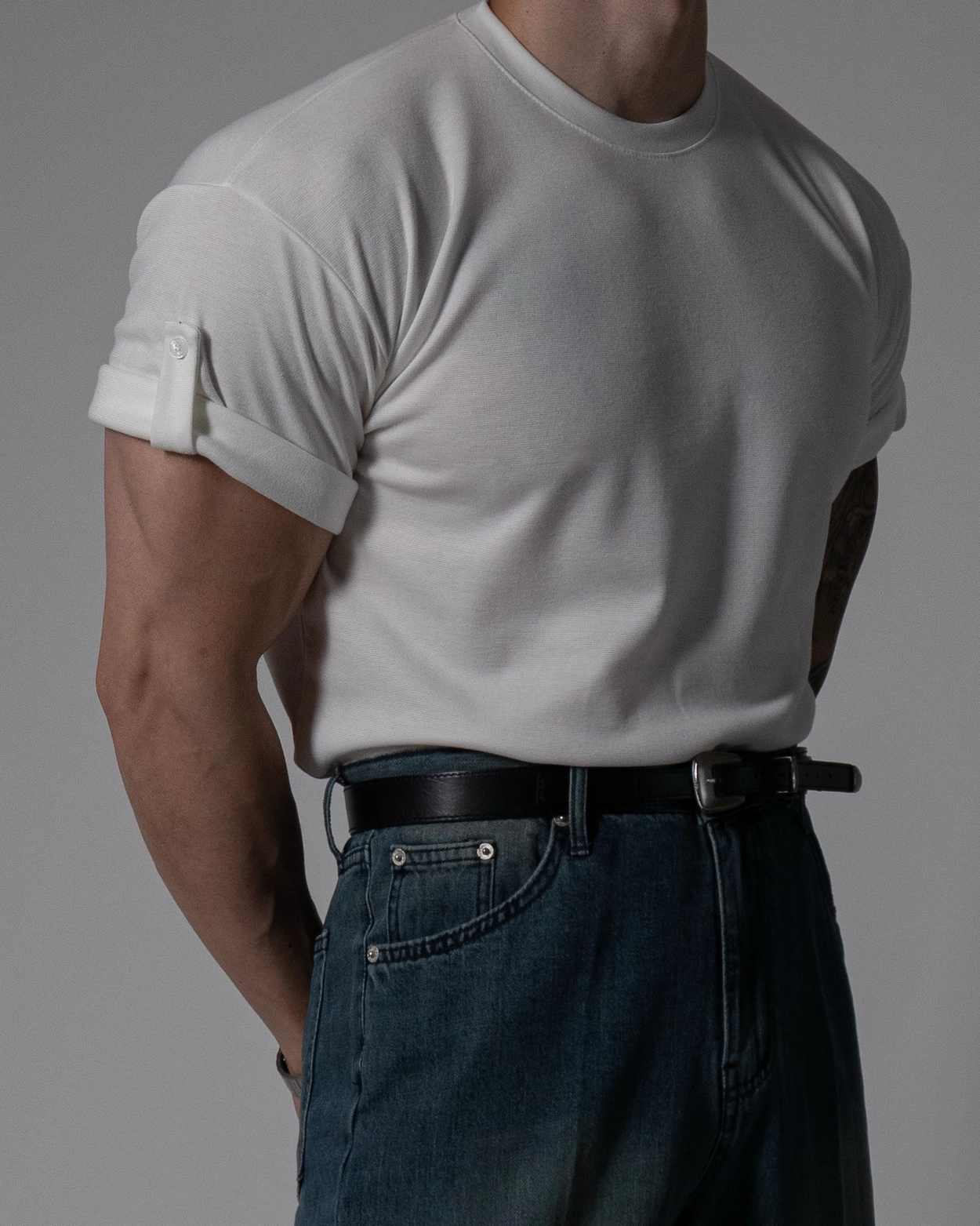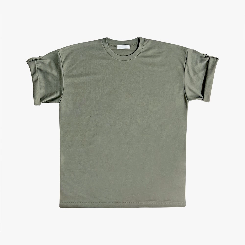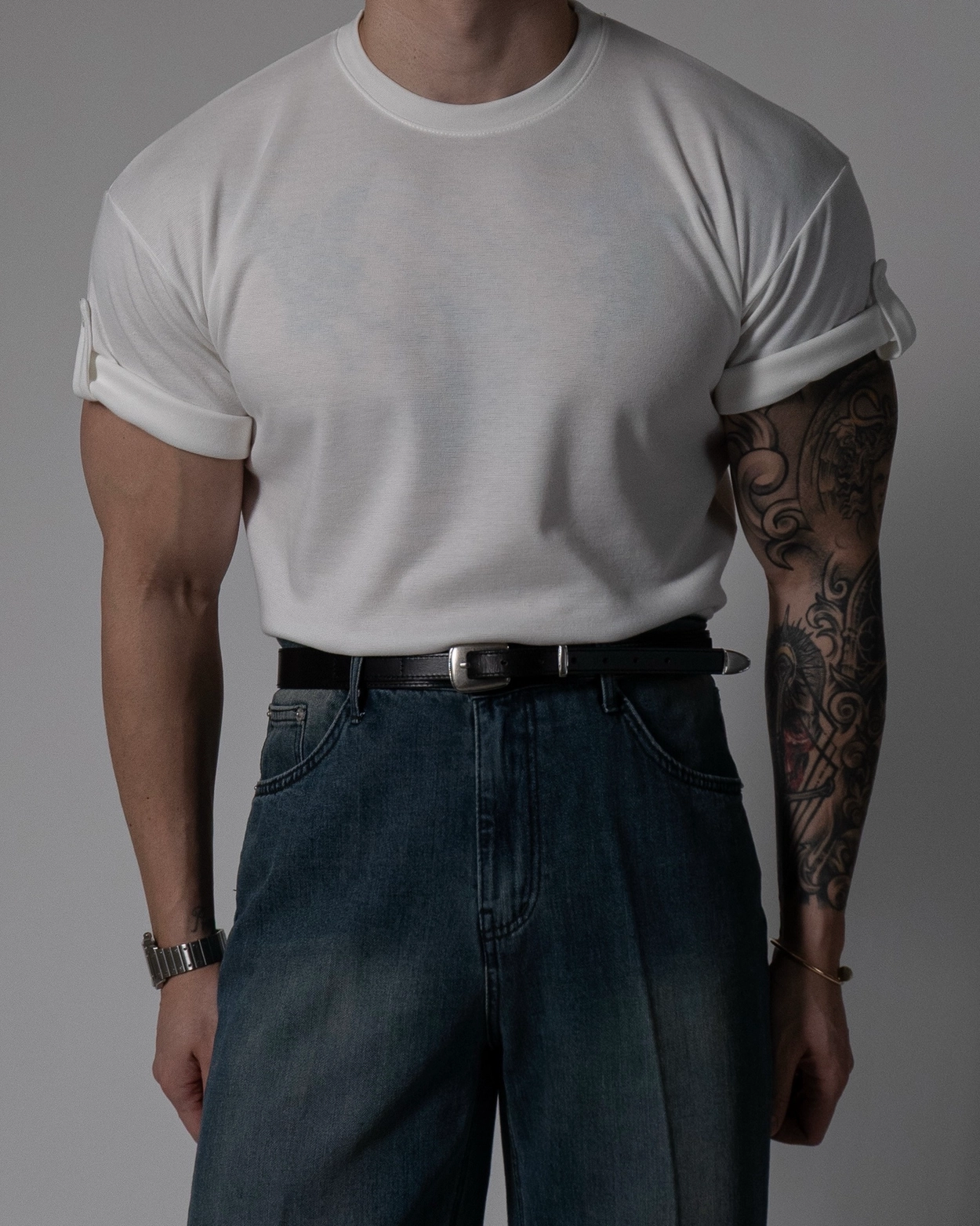 - 獨特設計的 T 卹,帶有捲起袖子的細節