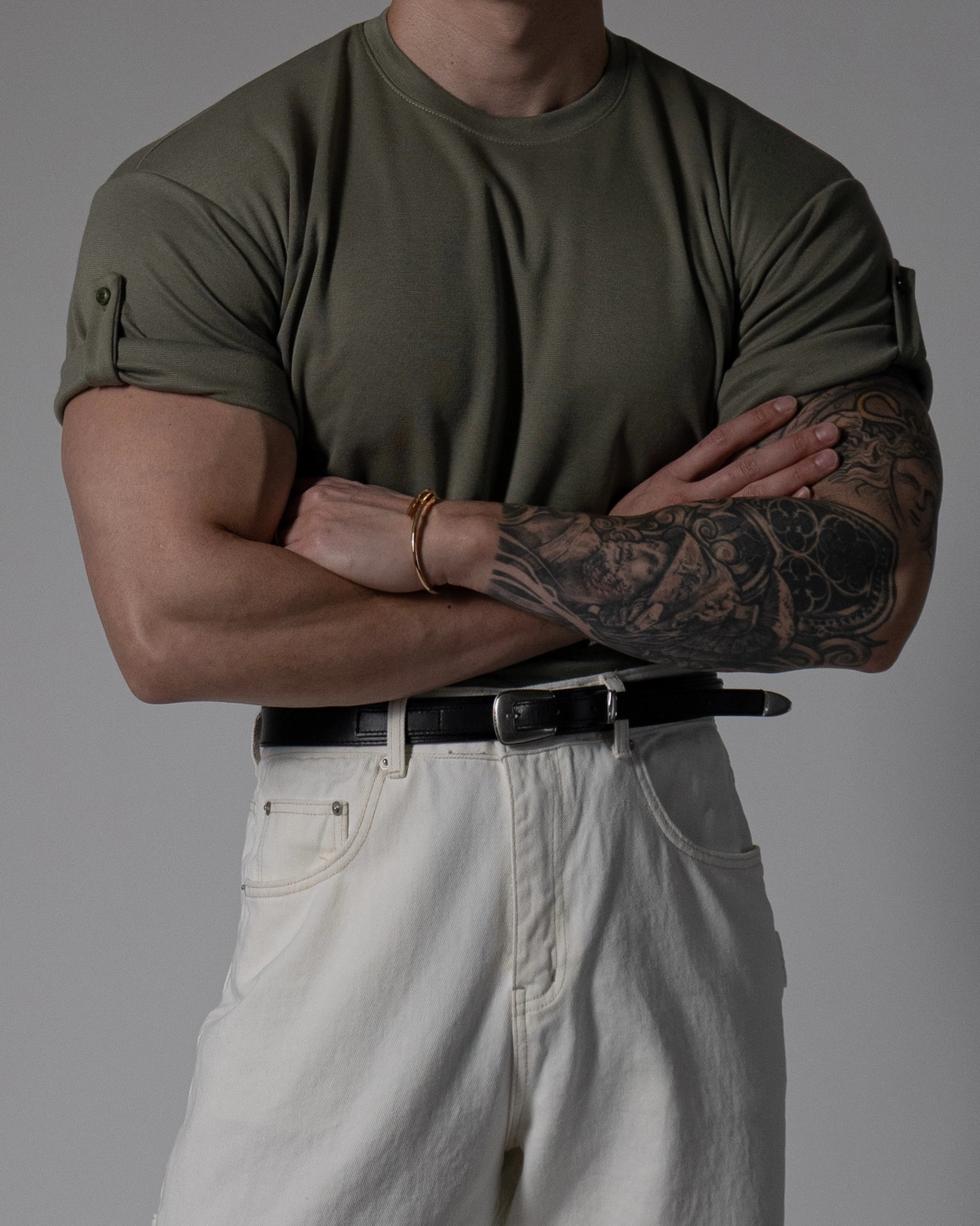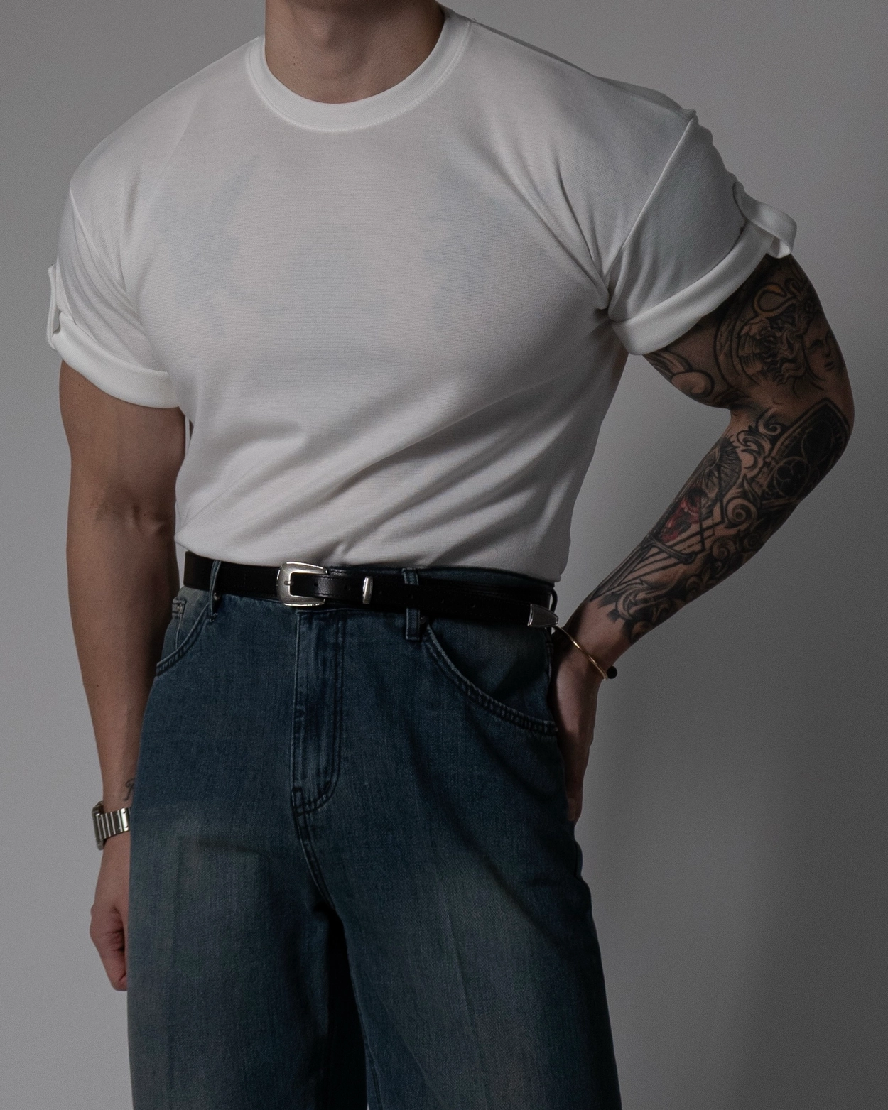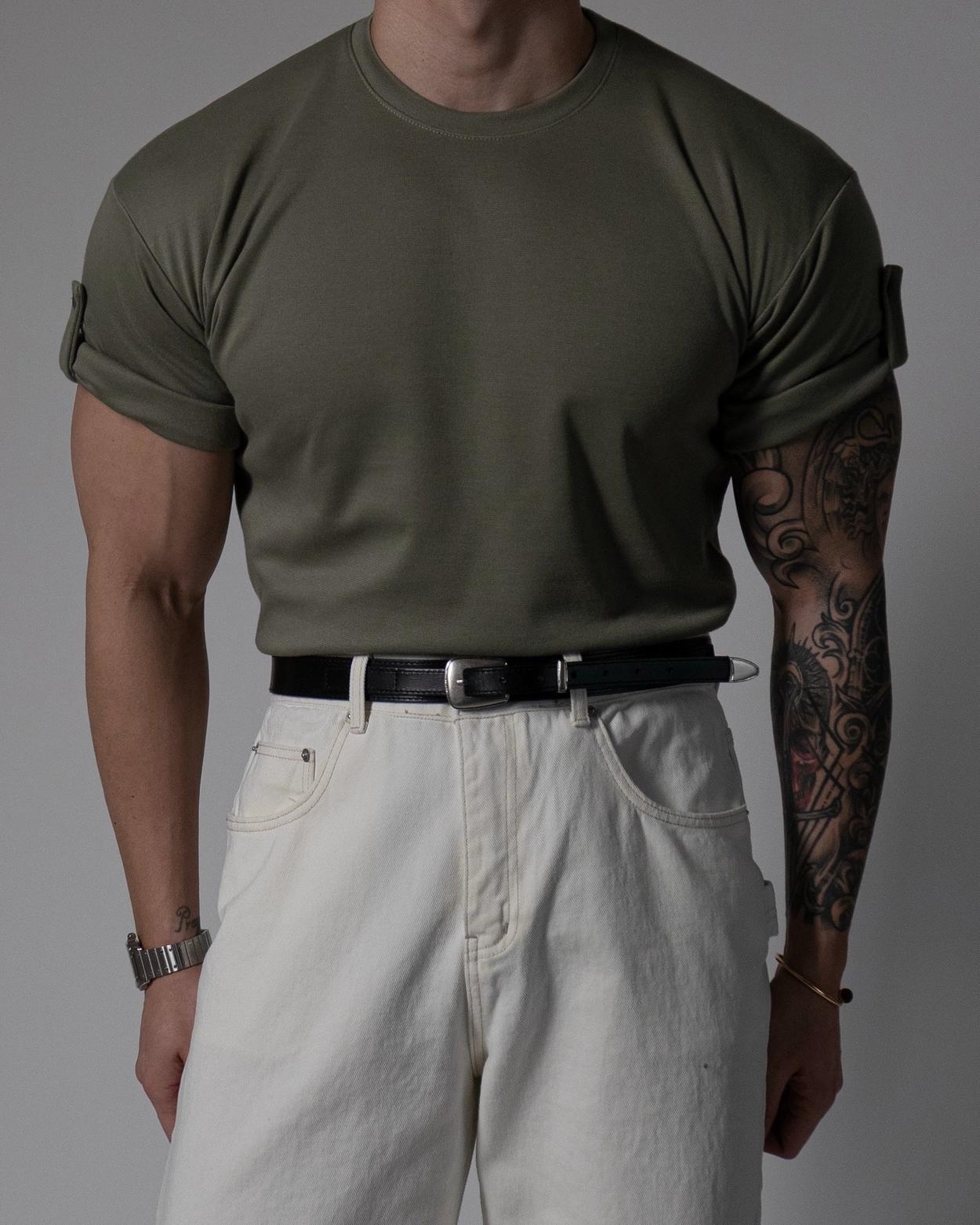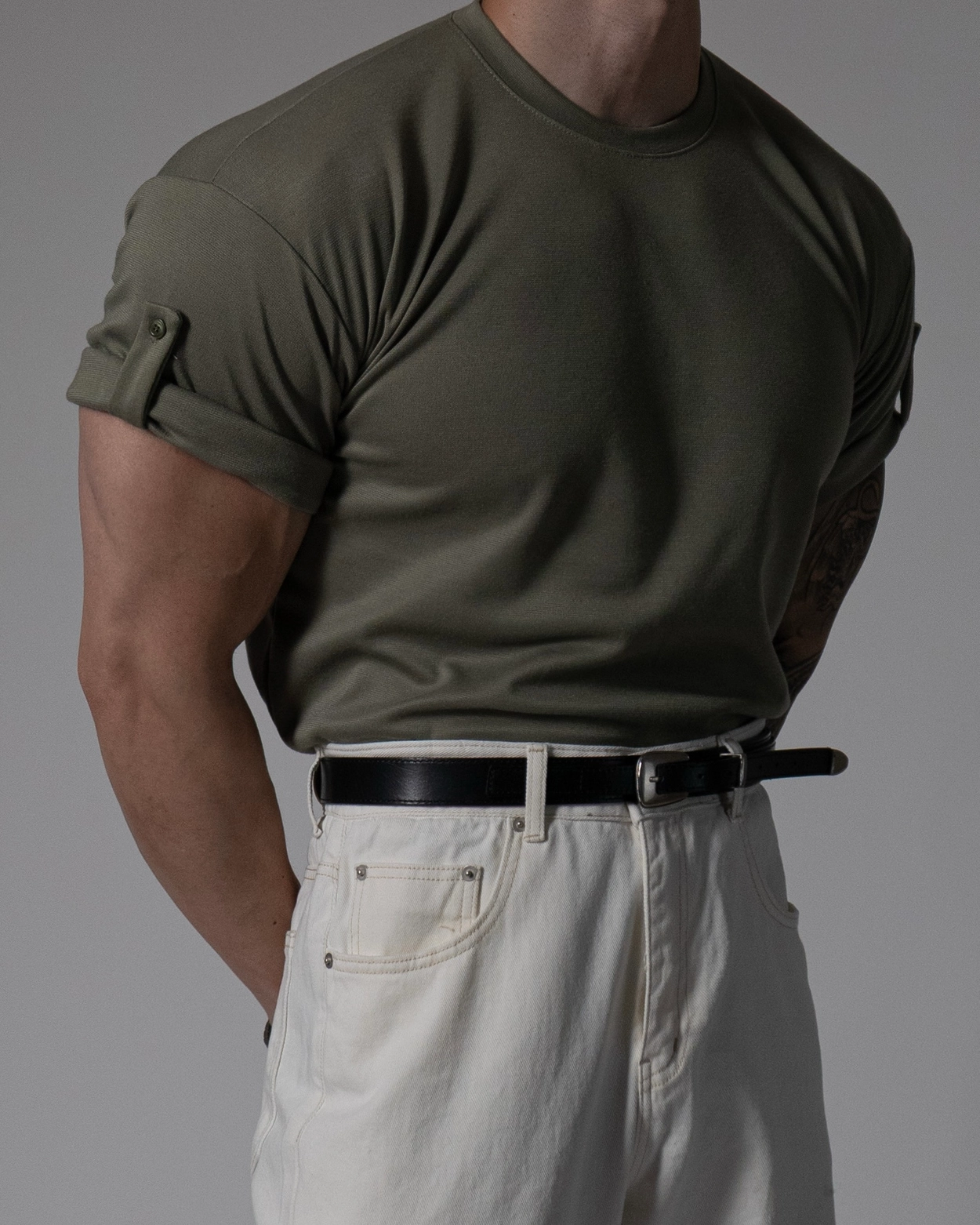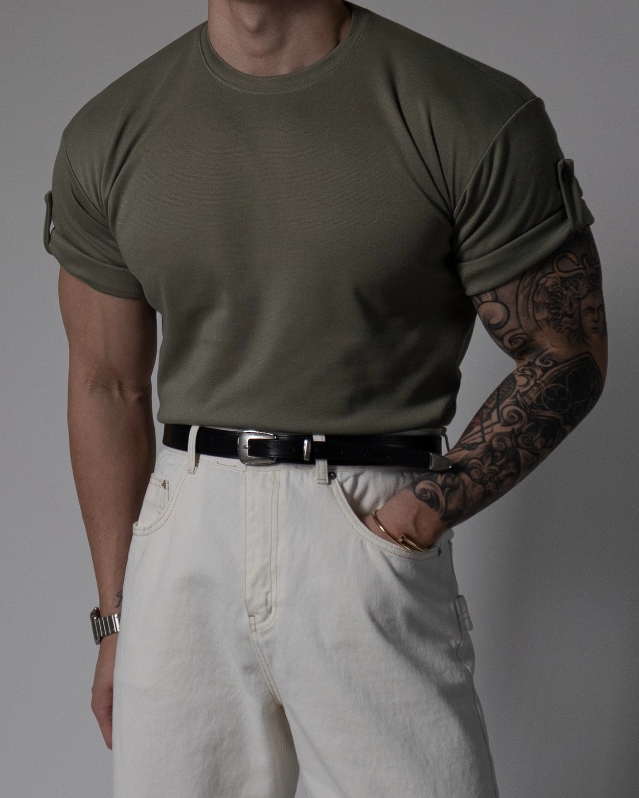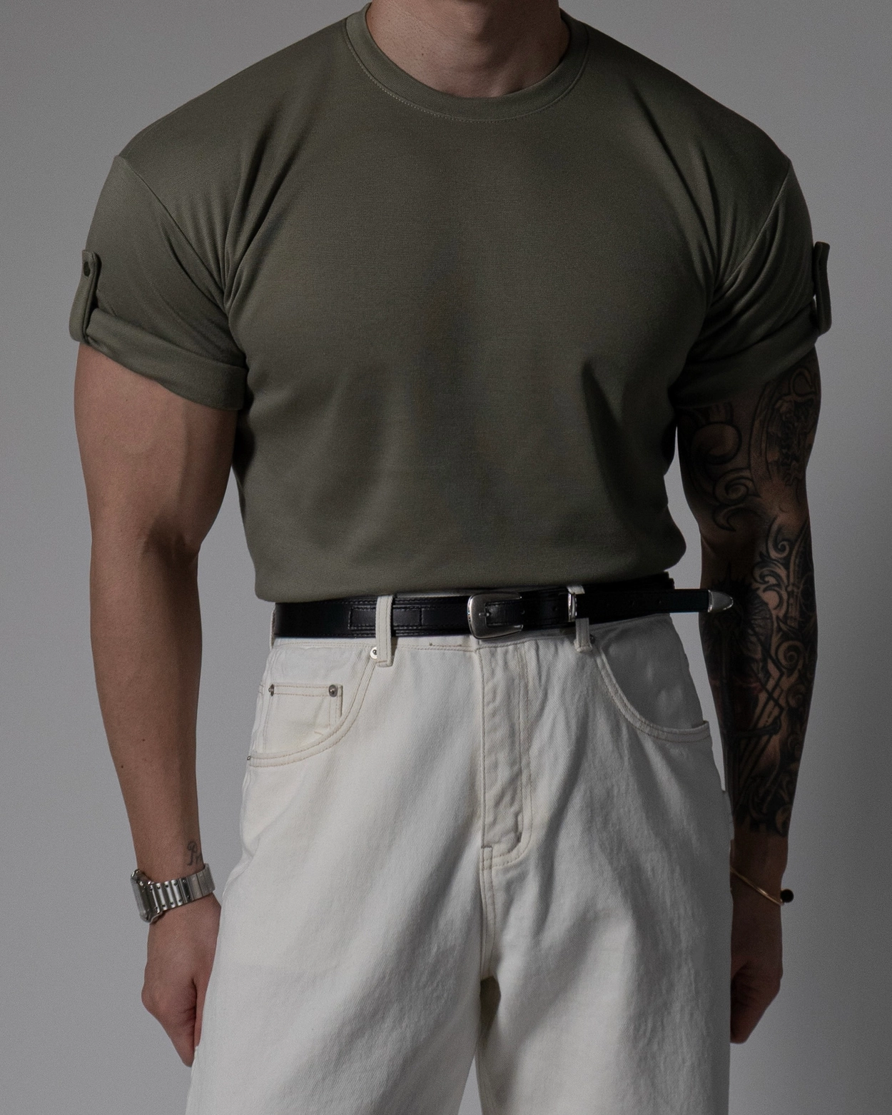 - 獨特設計的 T 卹,帶有捲起袖子的細節