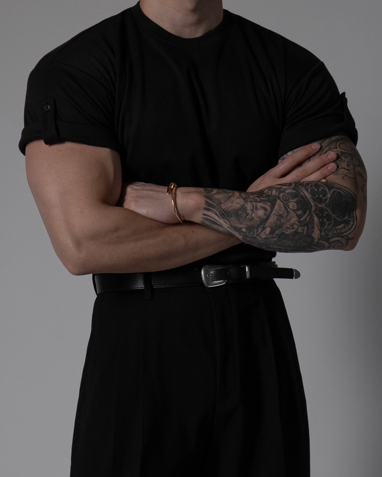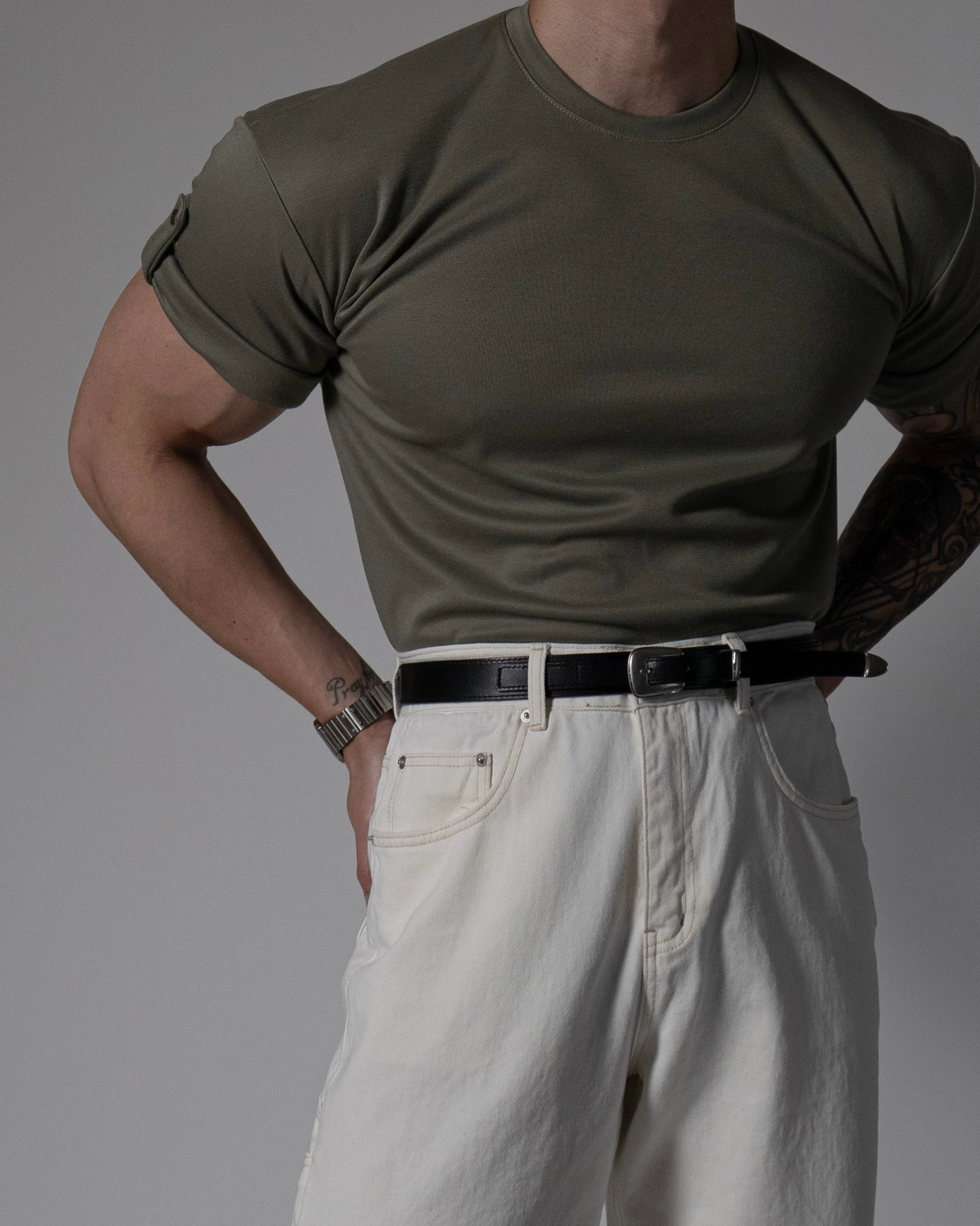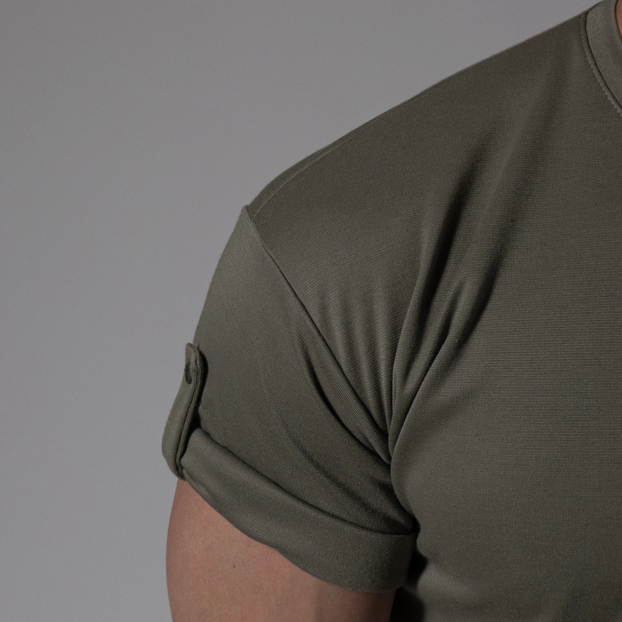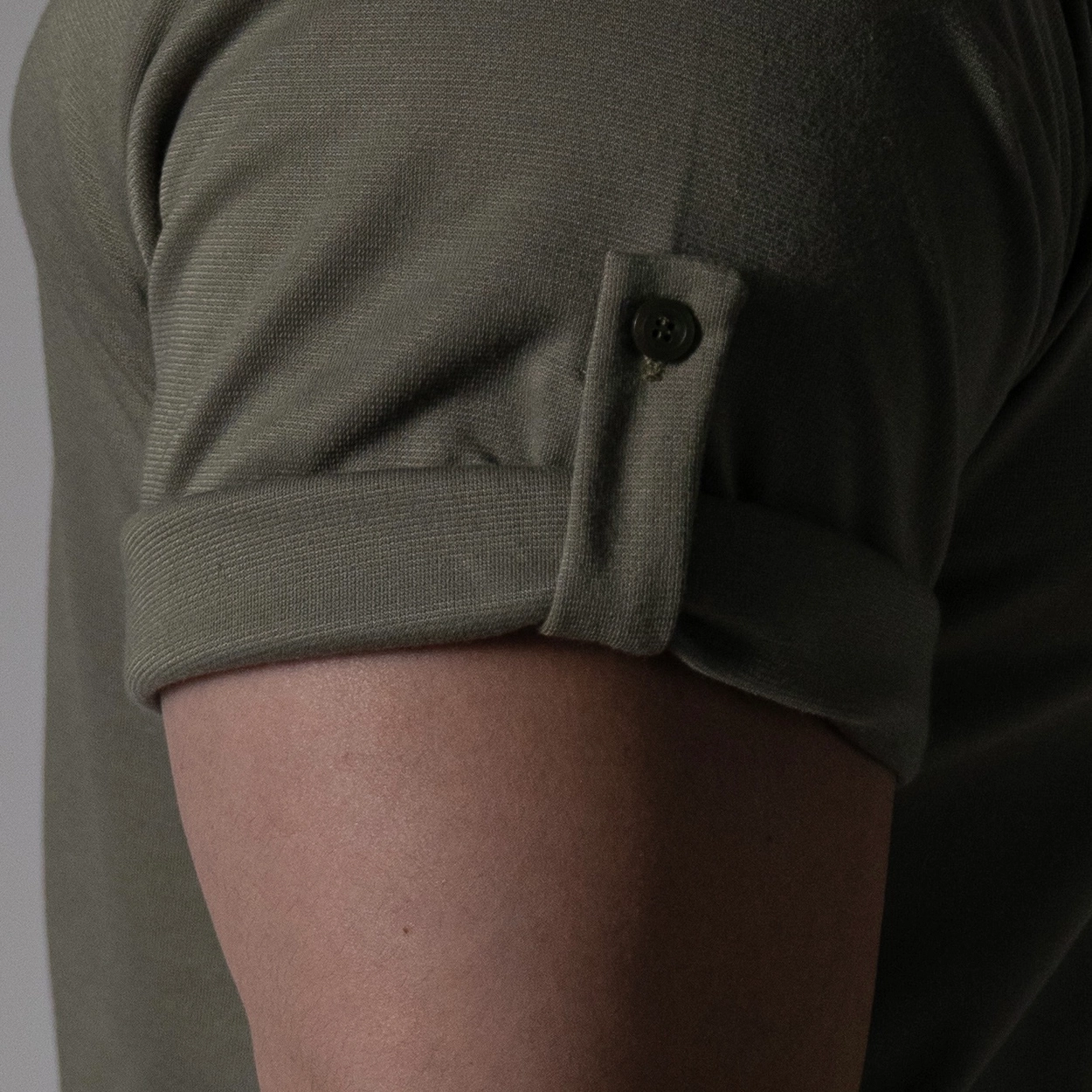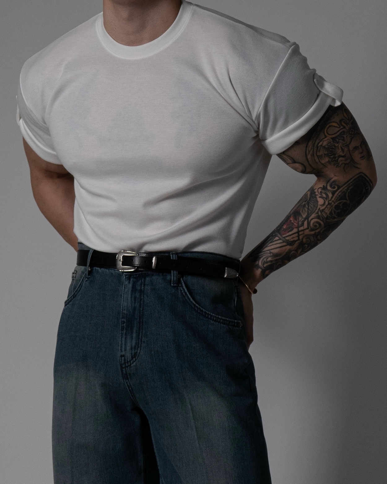 - 獨特設計的 T 卹,帶有捲起袖子的細節