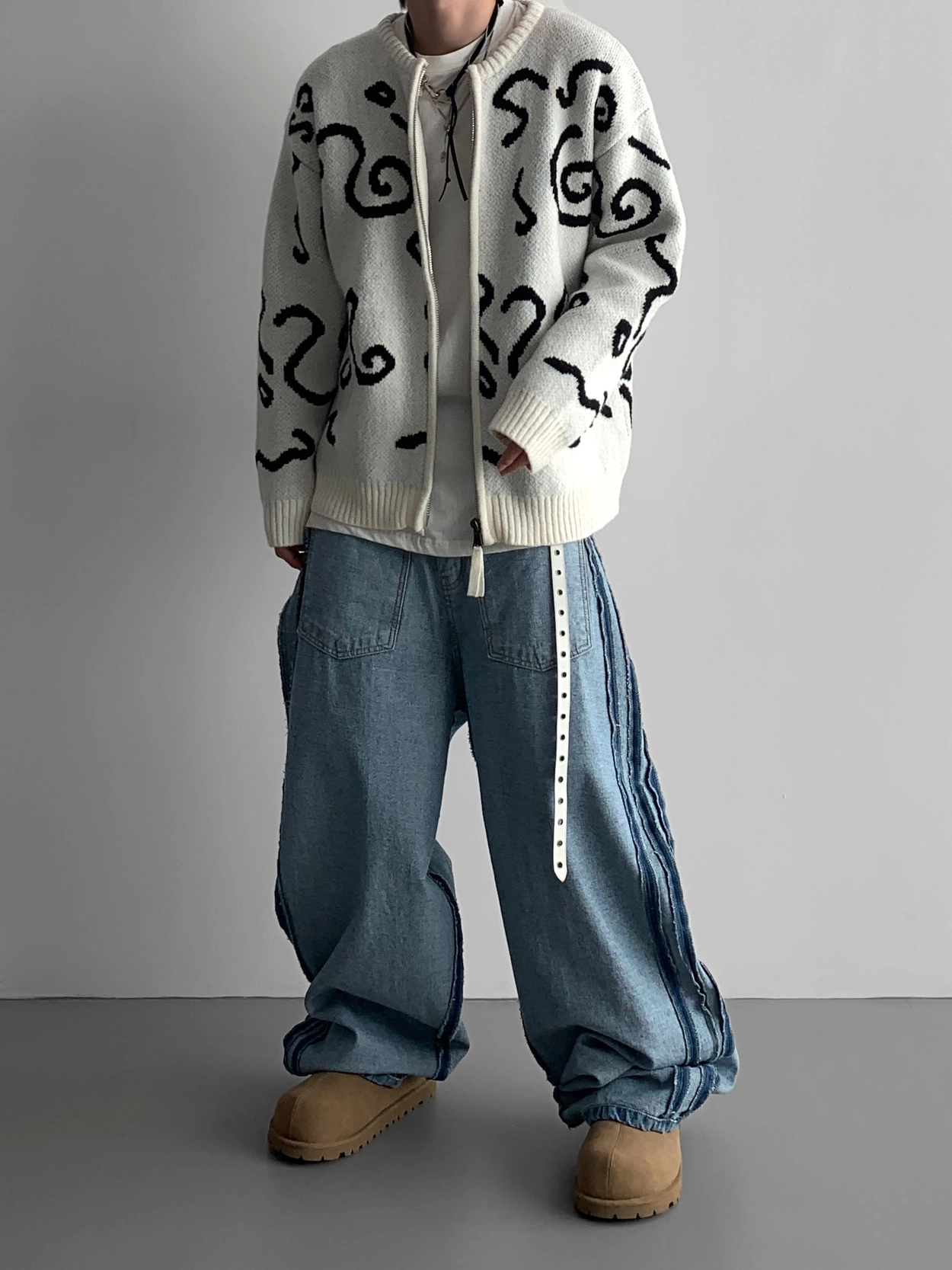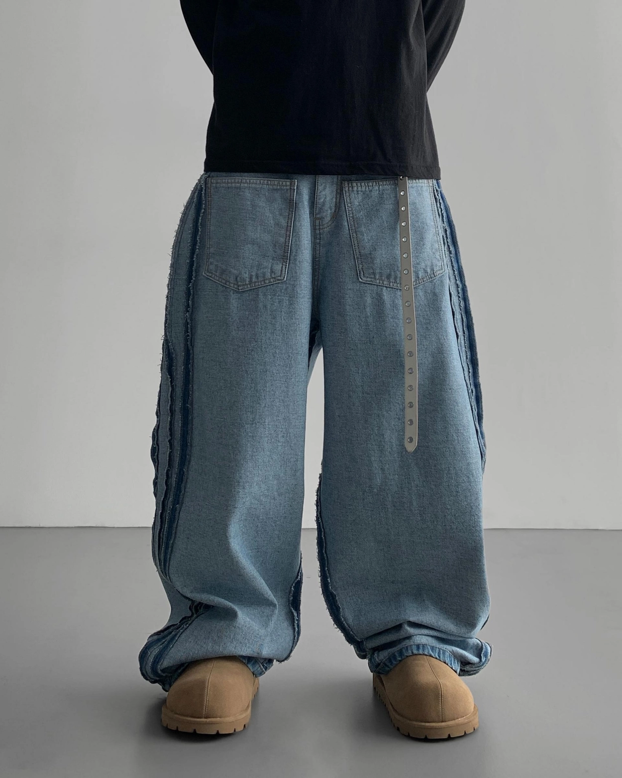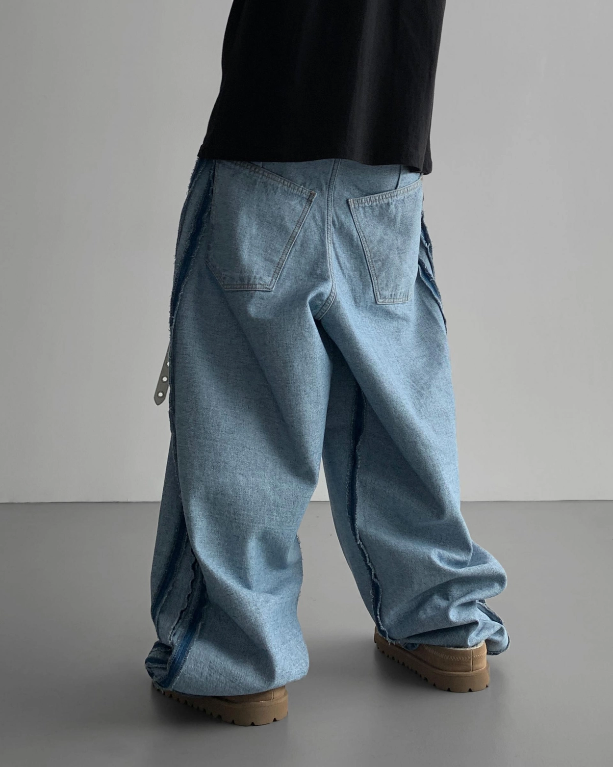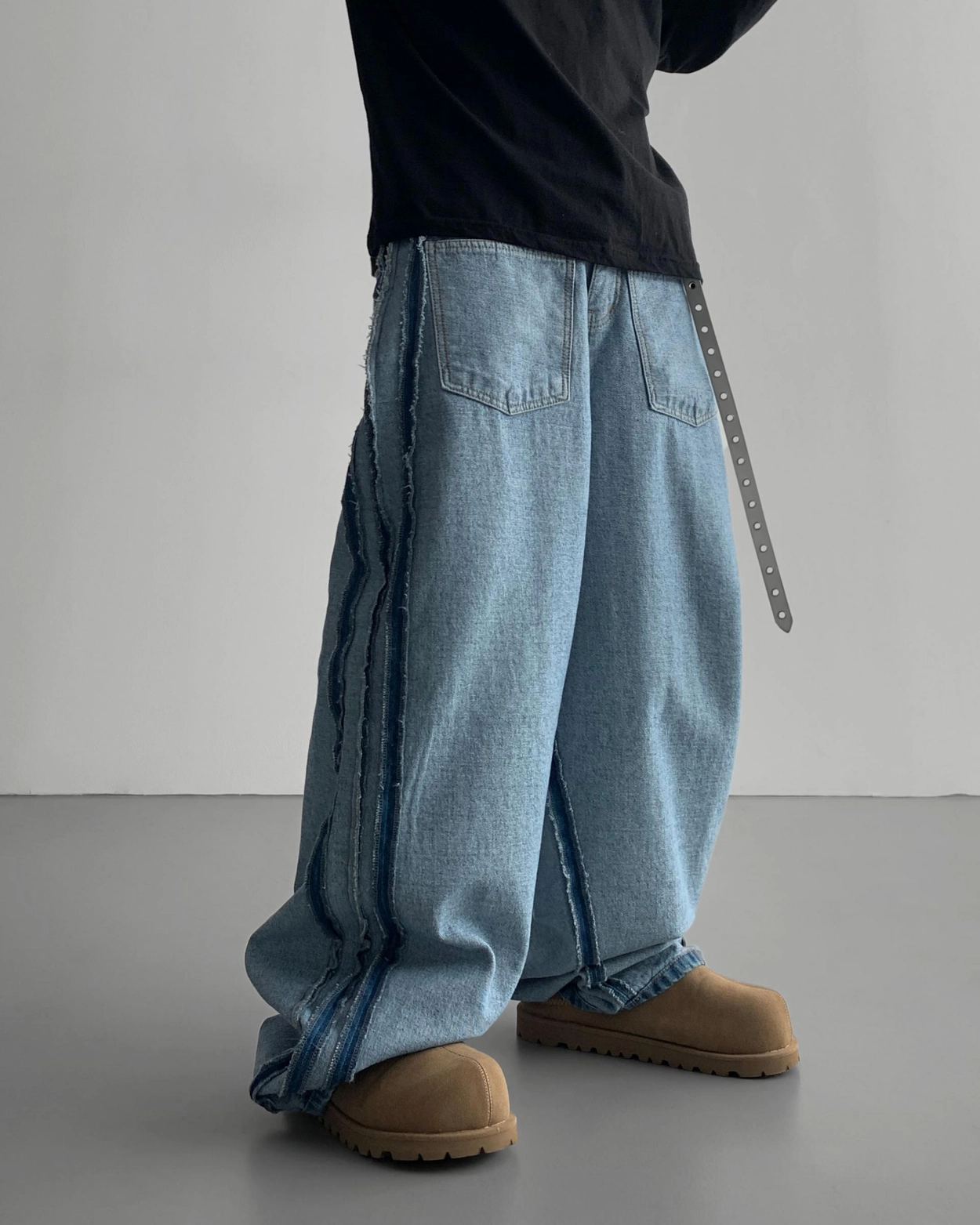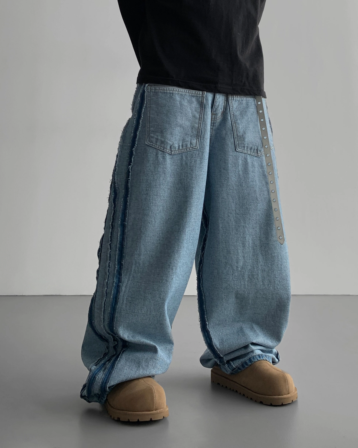 寬鬆的寬氣球輪廓搭配反向口袋設計強調性感,