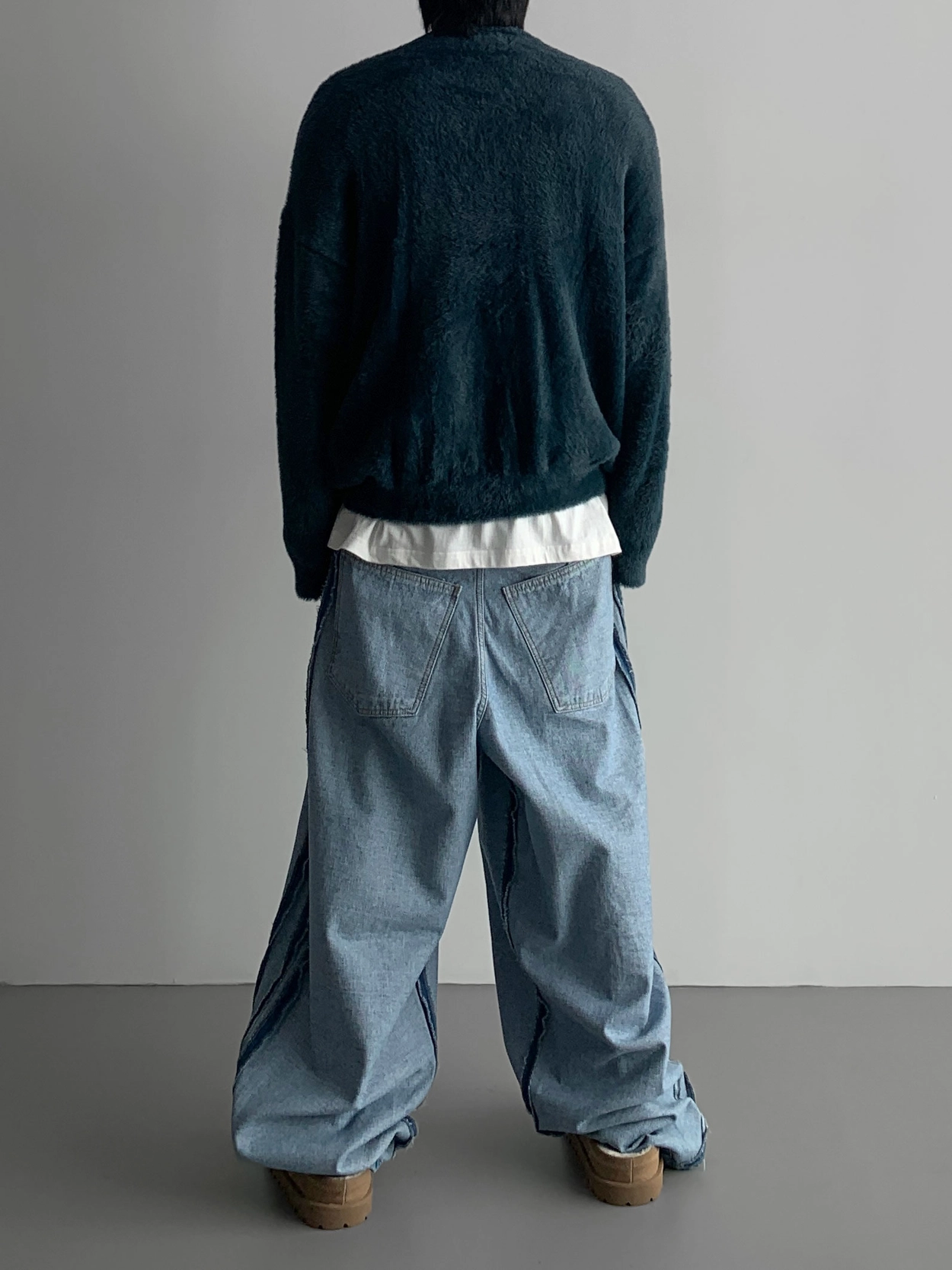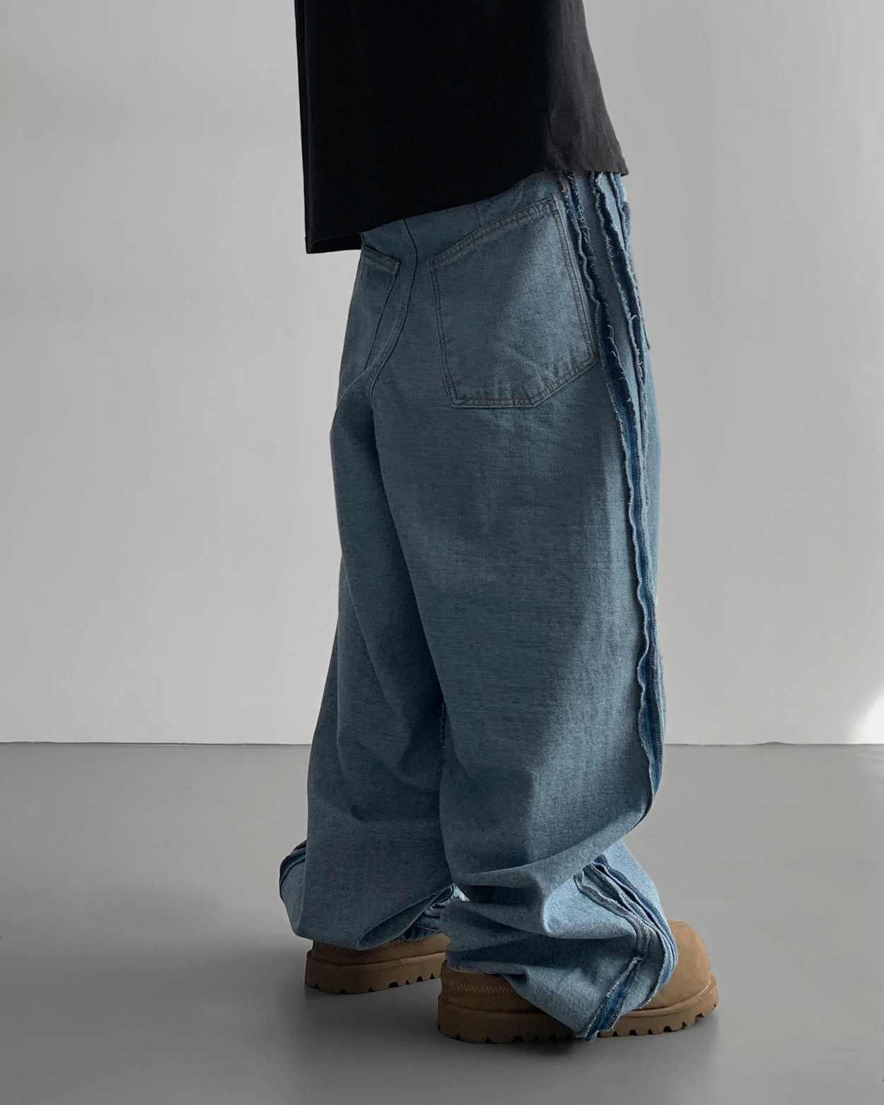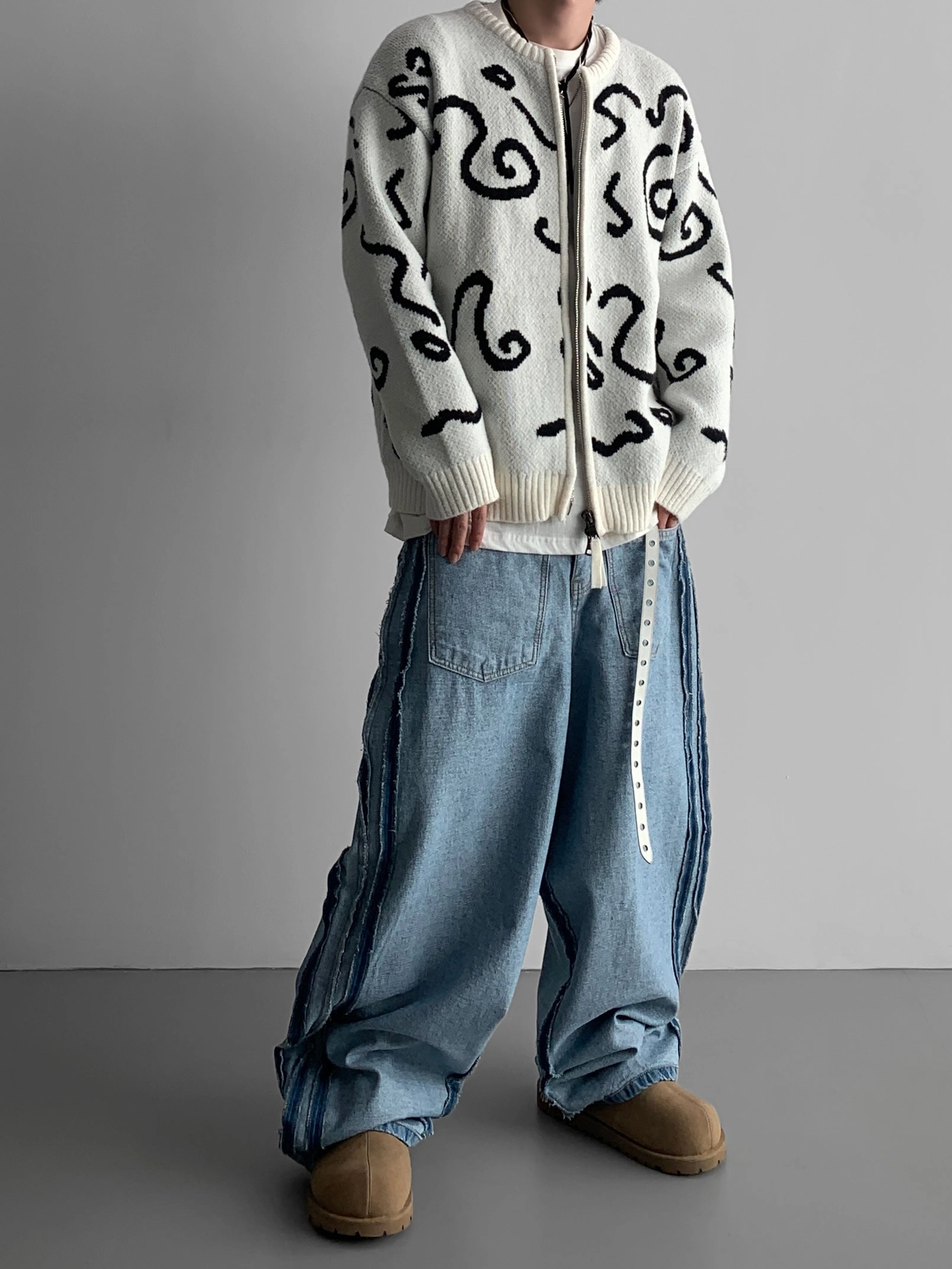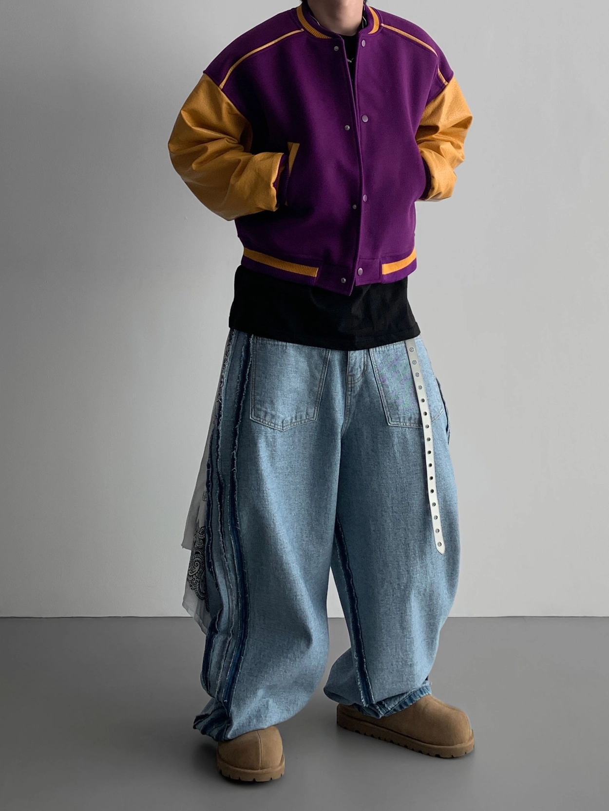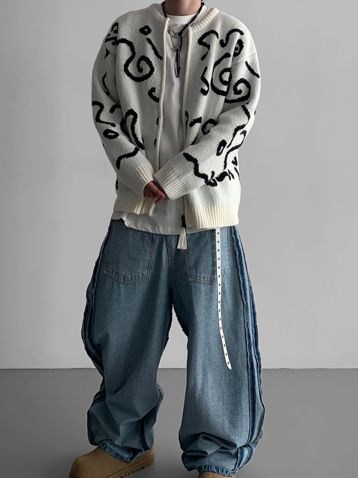 寬鬆的寬氣球輪廓搭配反向口袋設計強調性感,