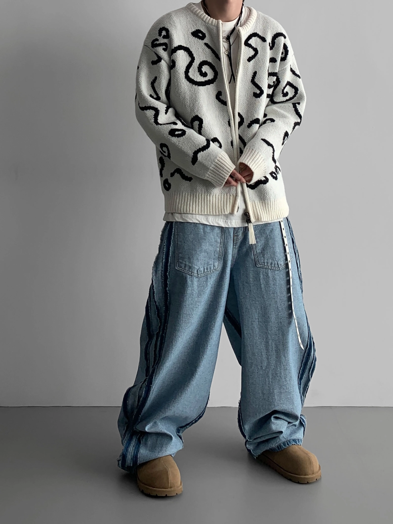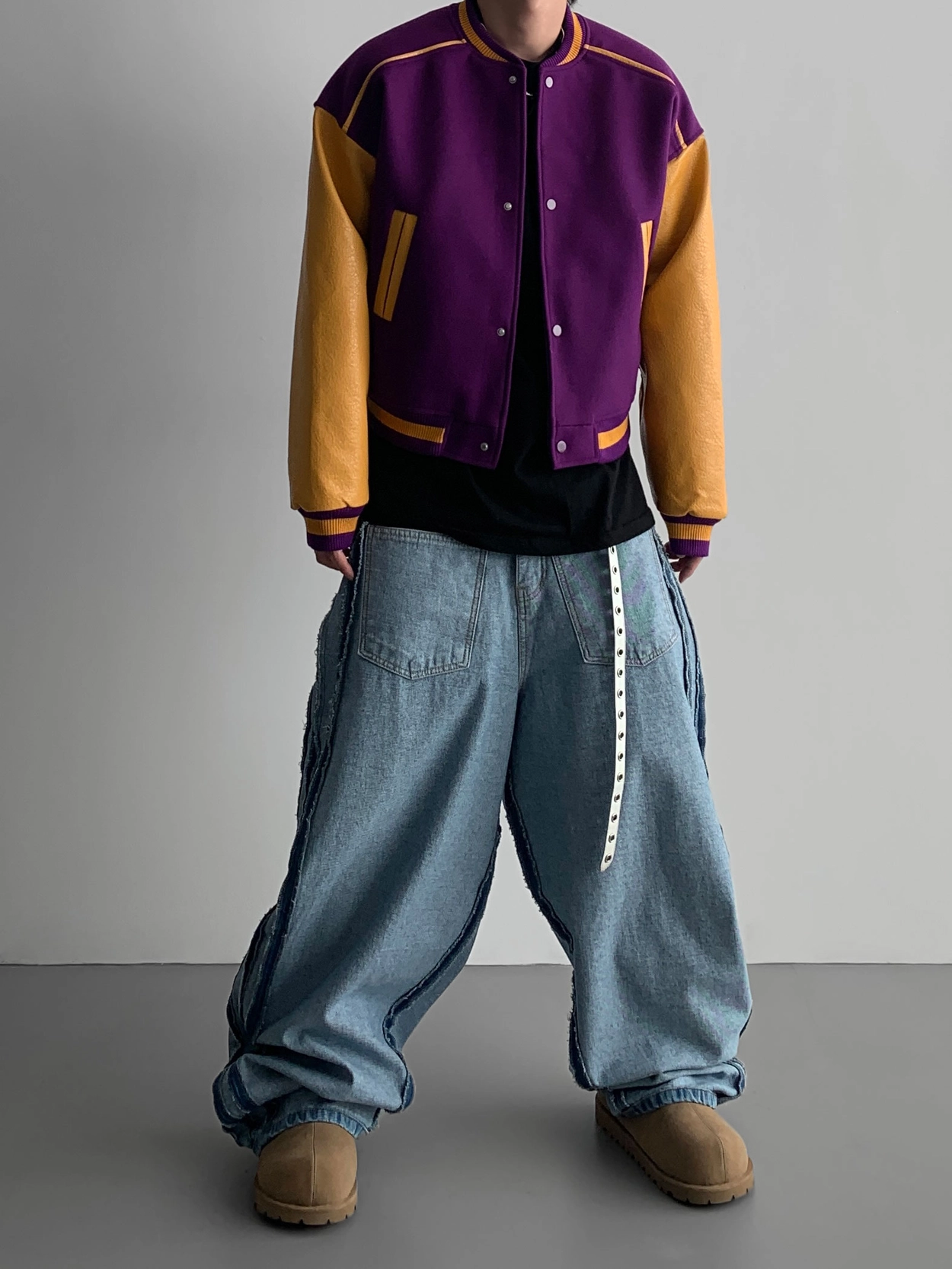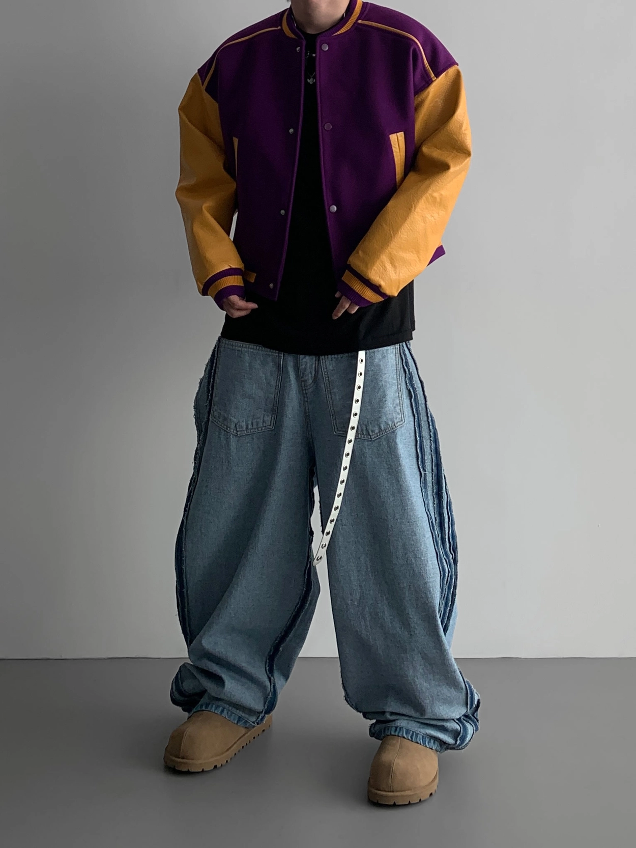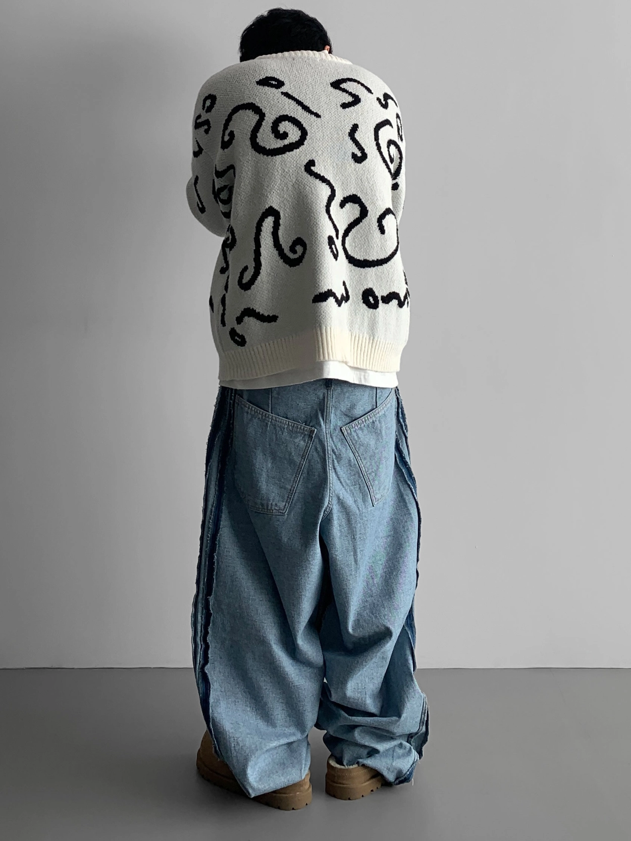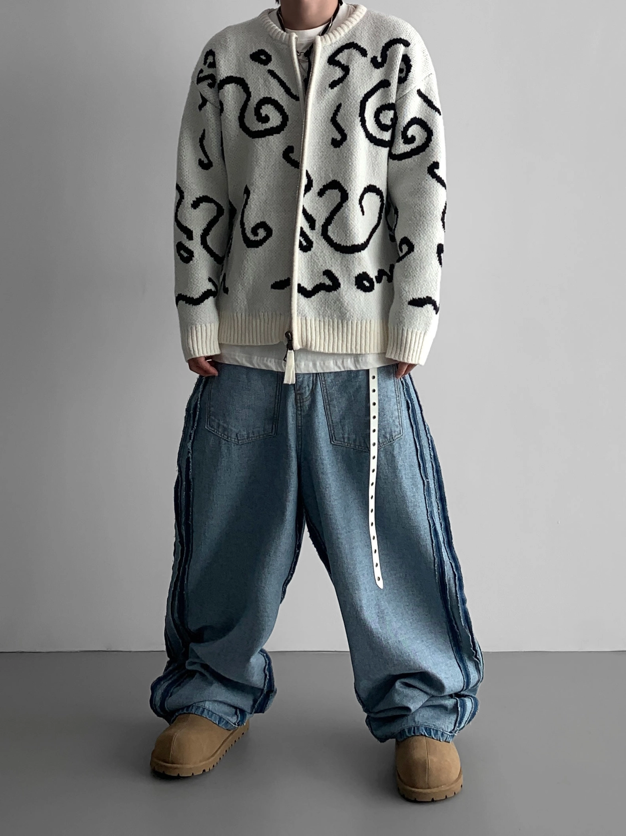 寬鬆的寬氣球輪廓搭配反向口袋設計強調性感,