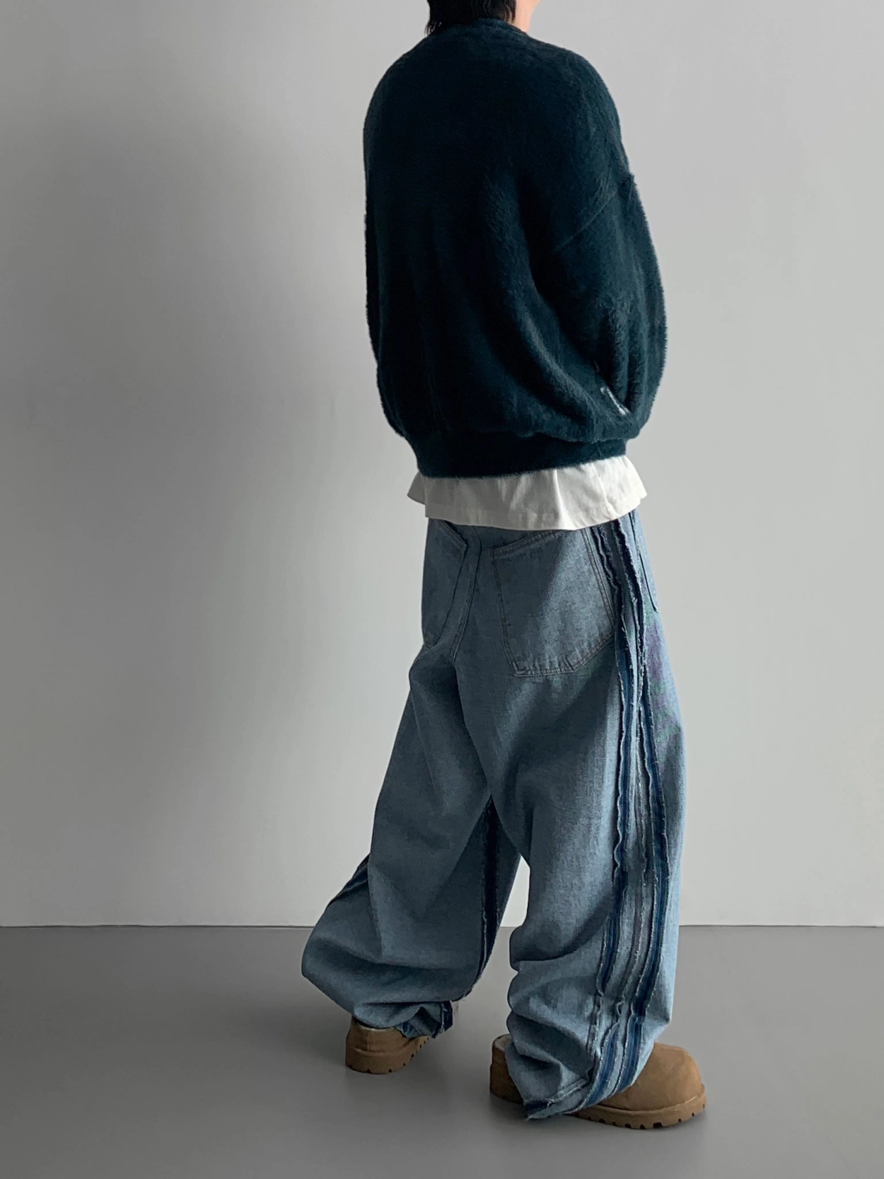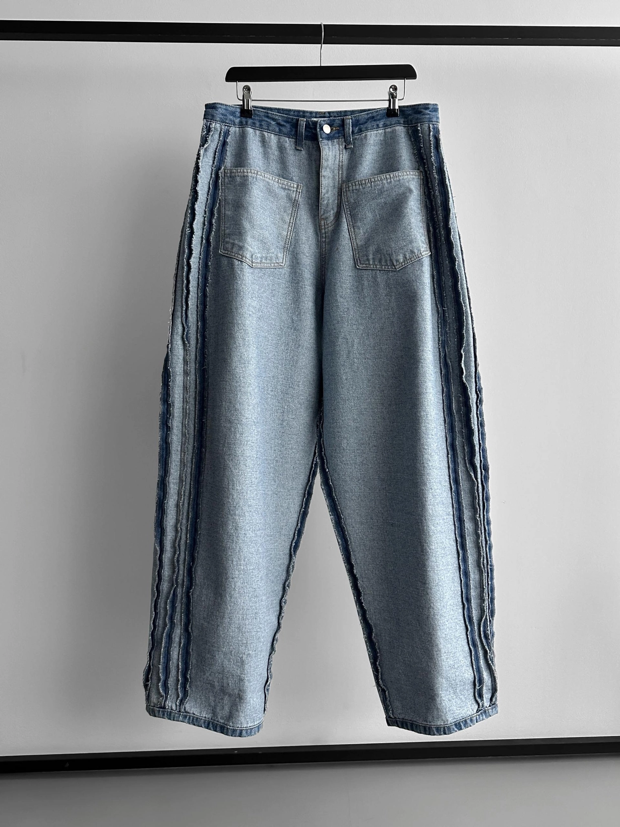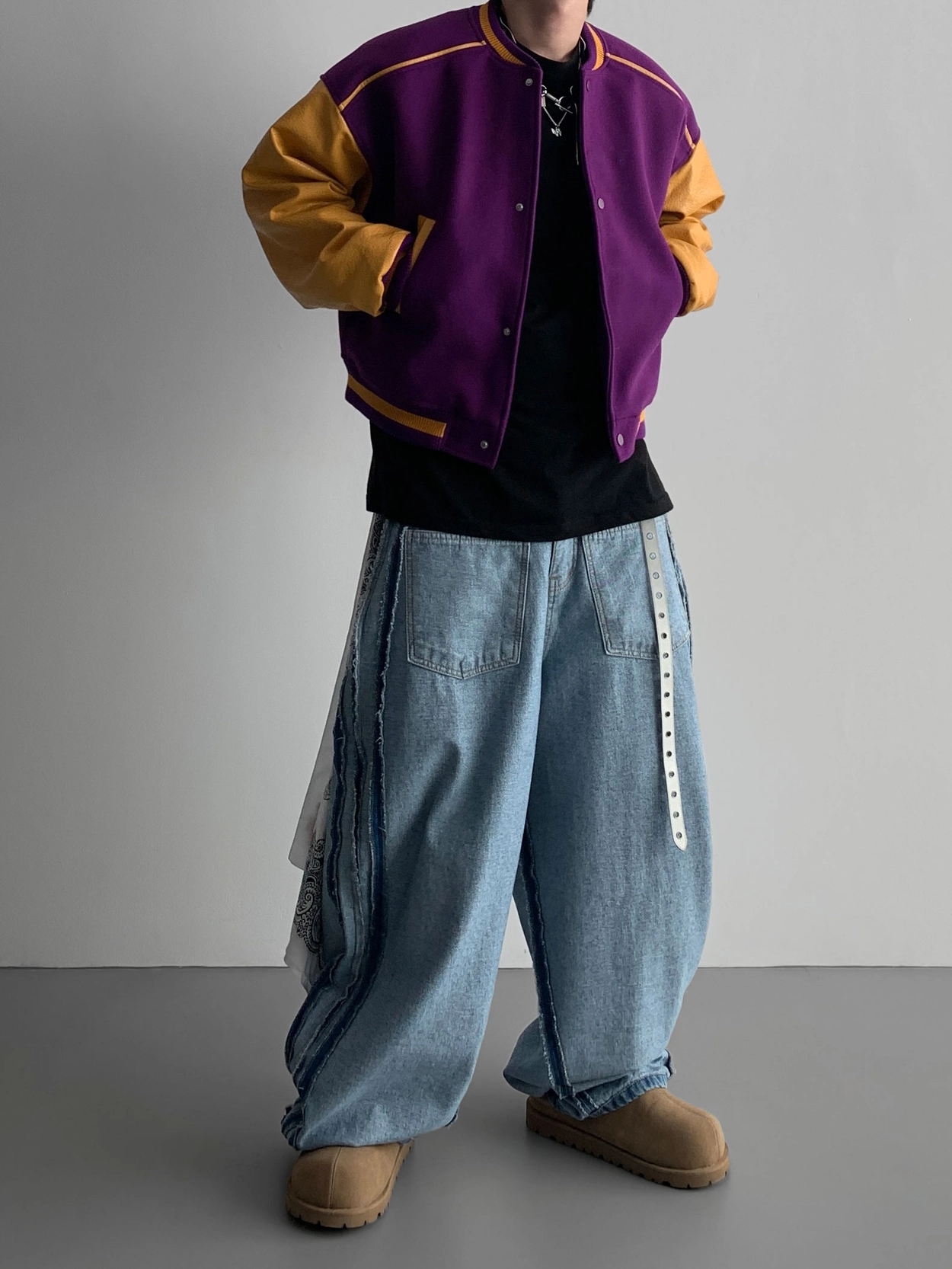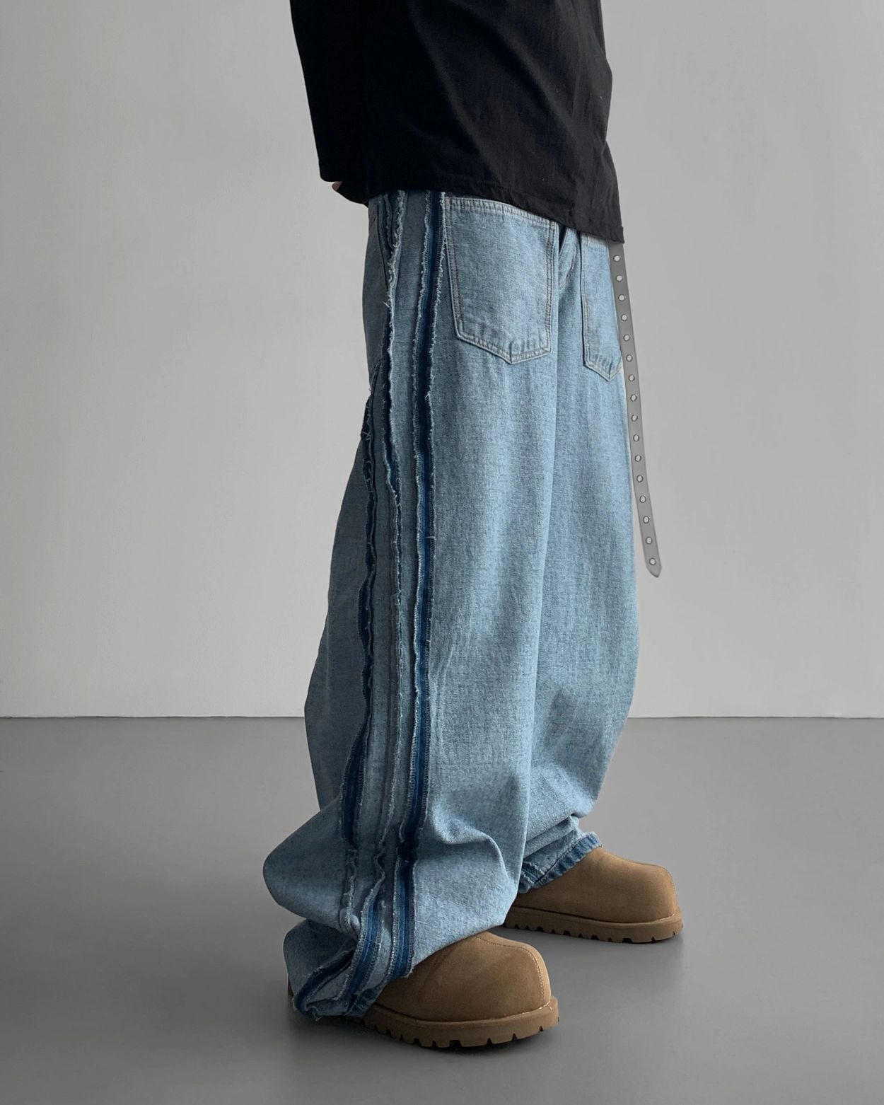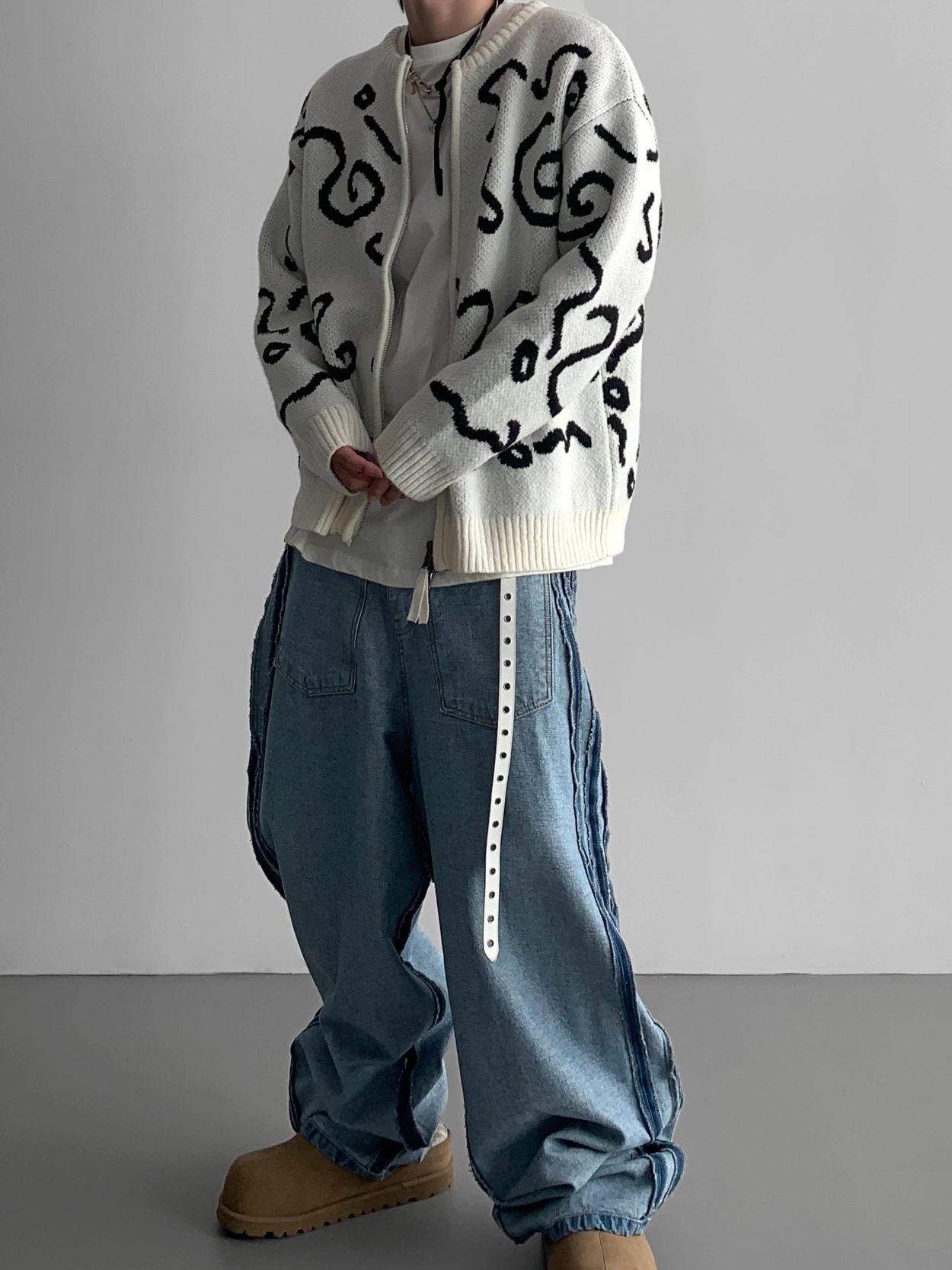 寬鬆的寬氣球輪廓搭配反向口袋設計強調性感,