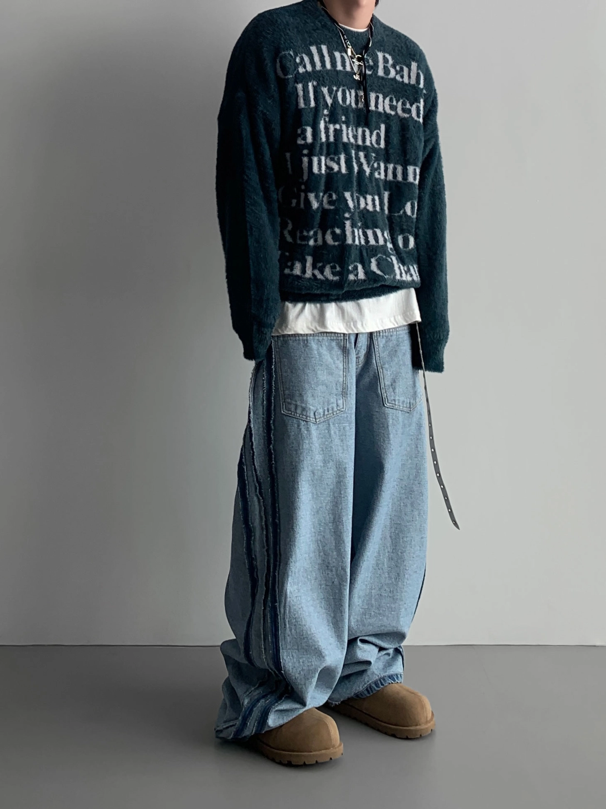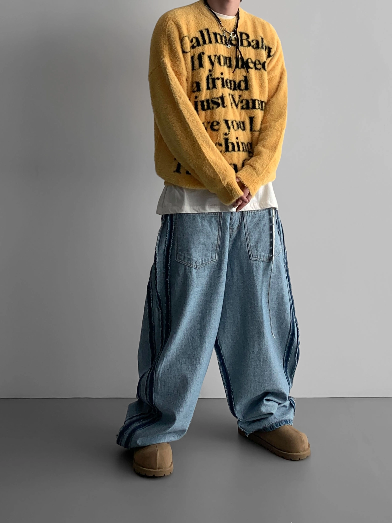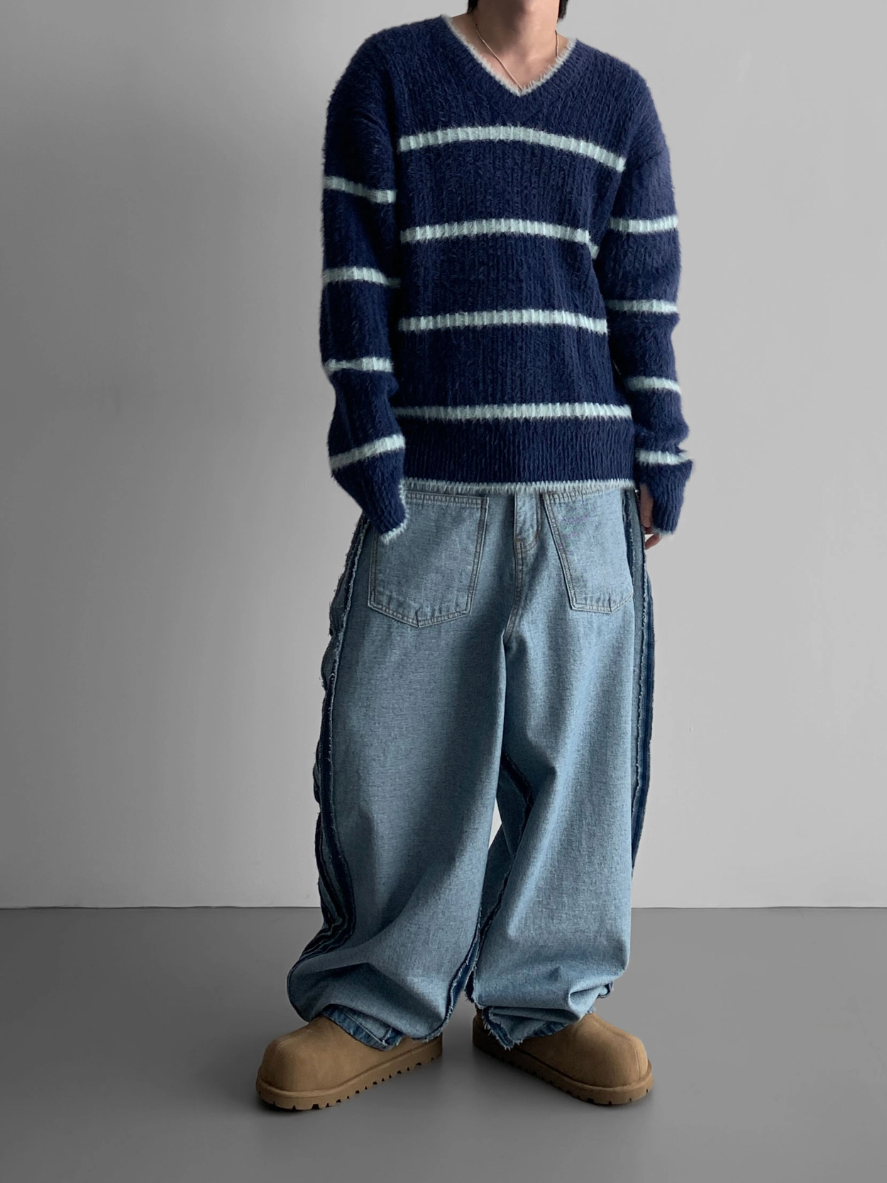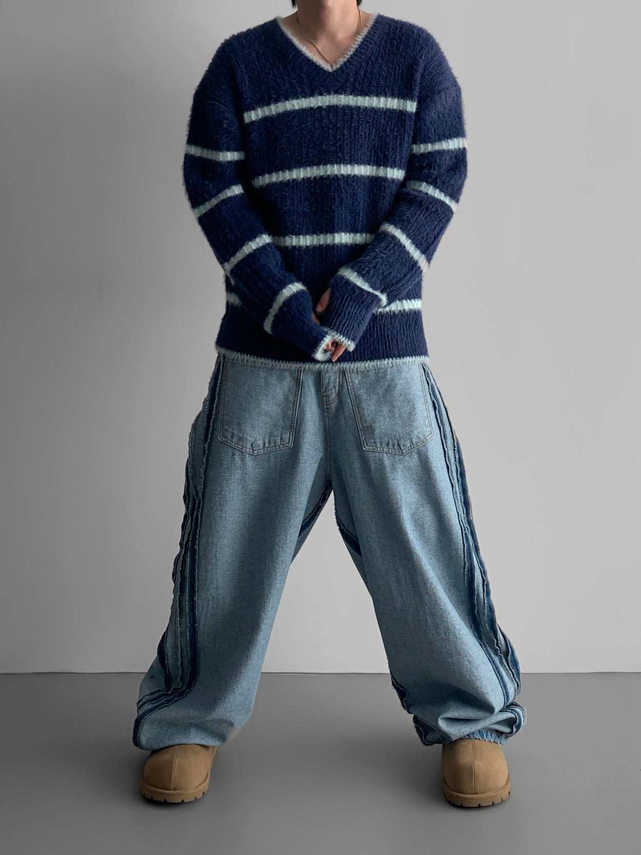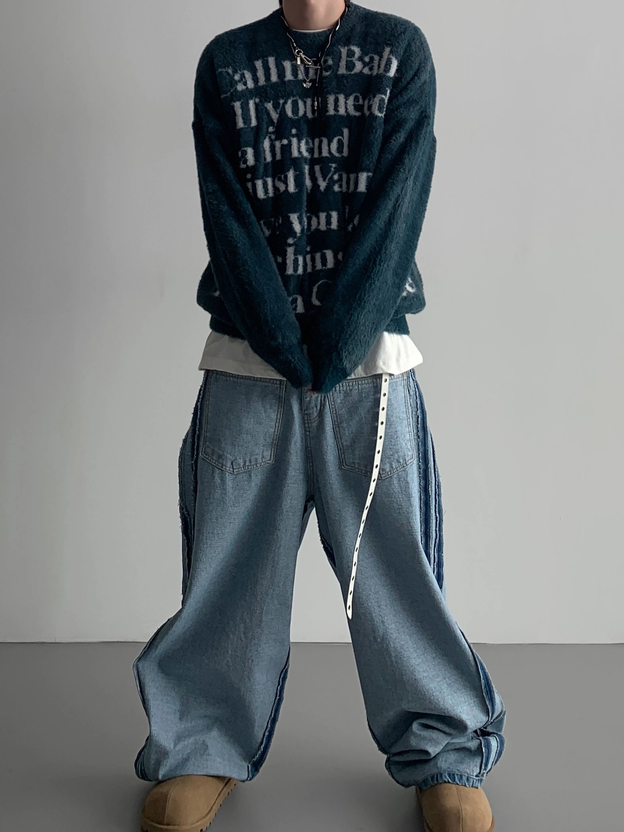 寬鬆的寬氣球輪廓搭配反向口袋設計強調性感,