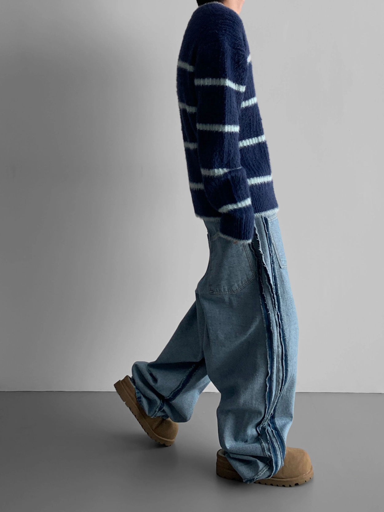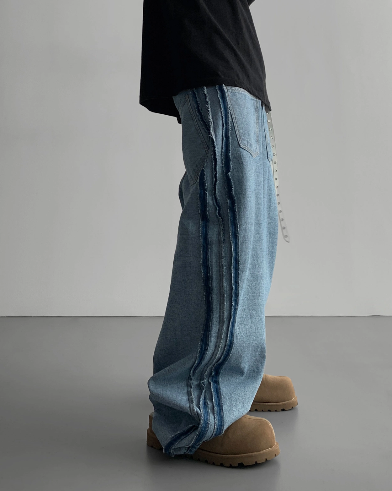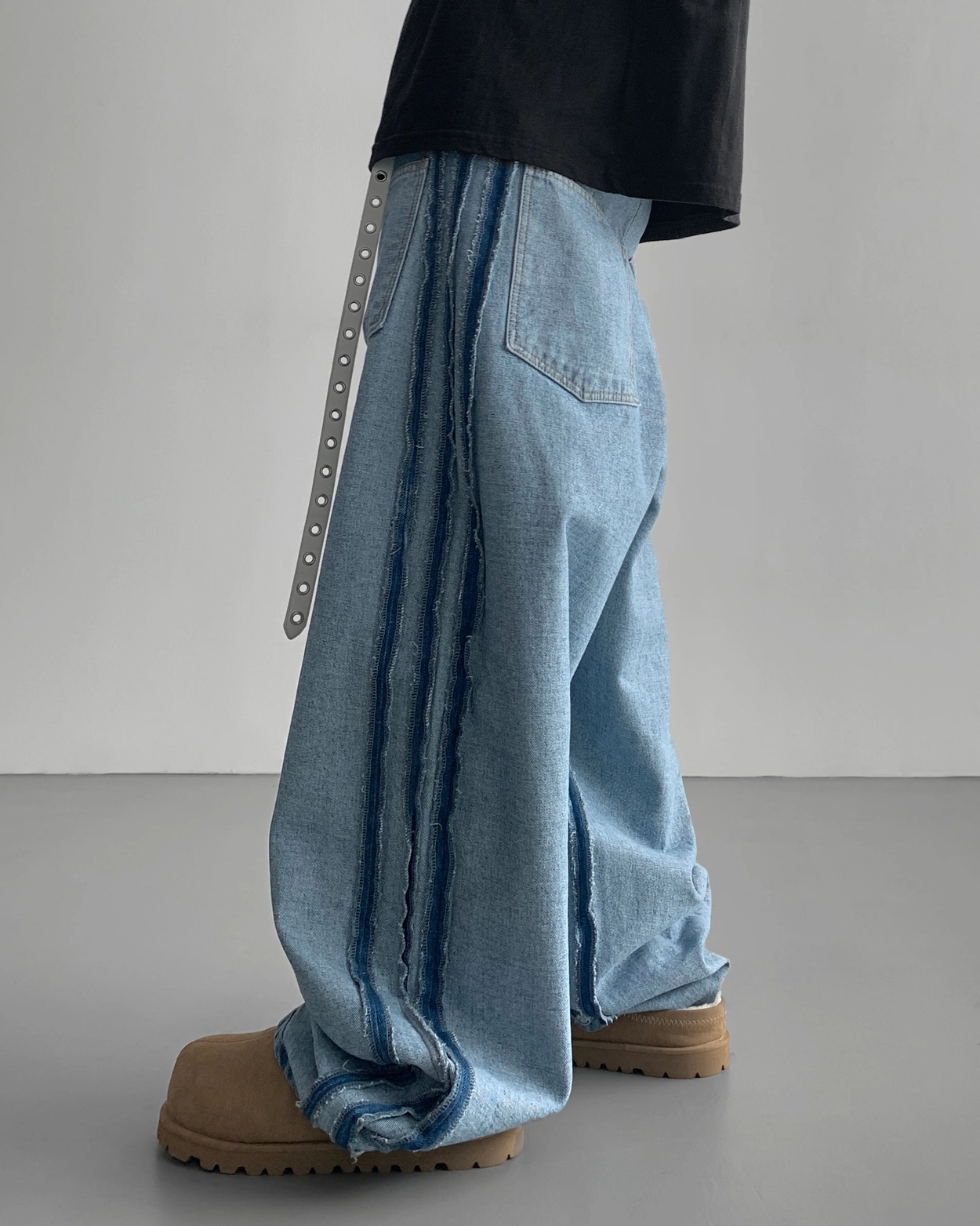 側軌線條強調復古情調,讓你只穿褲子就能完成 時尚造型。