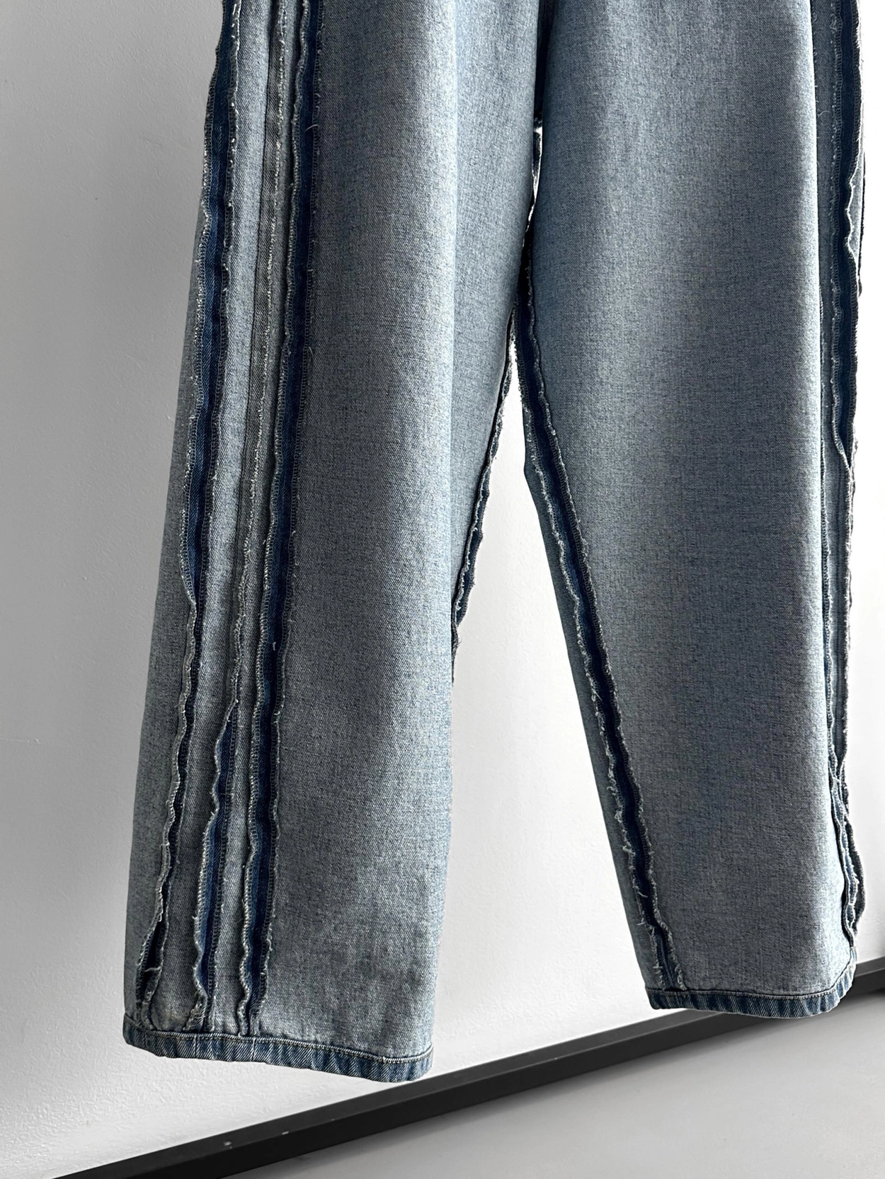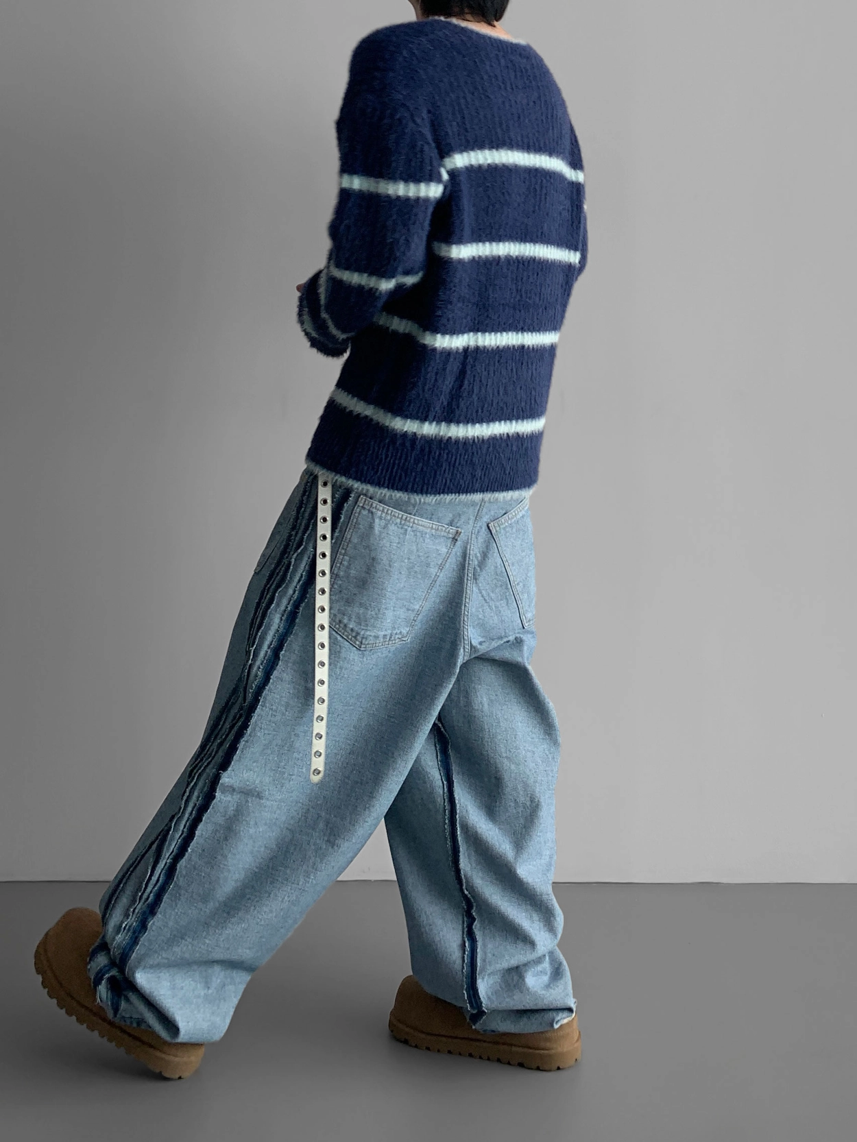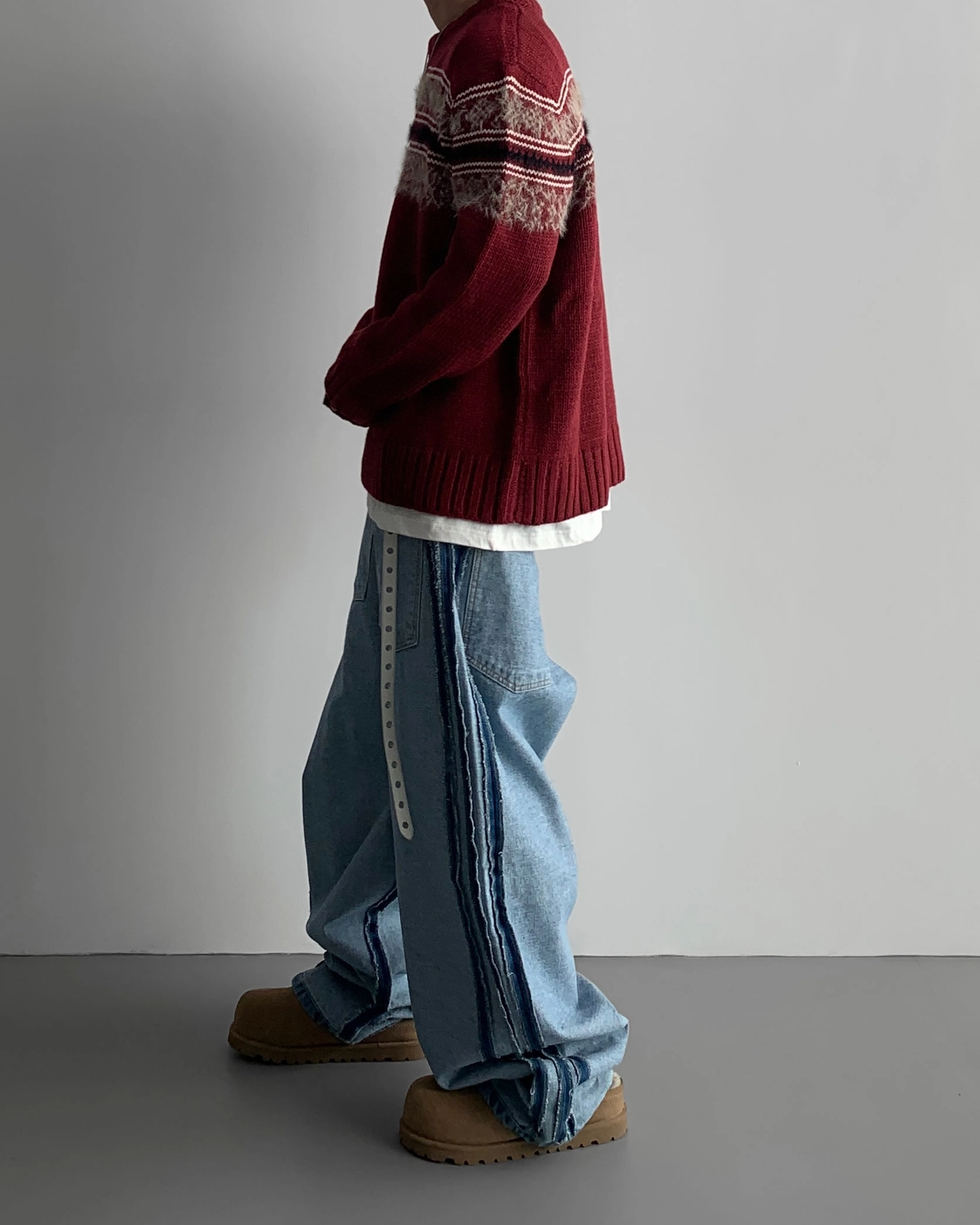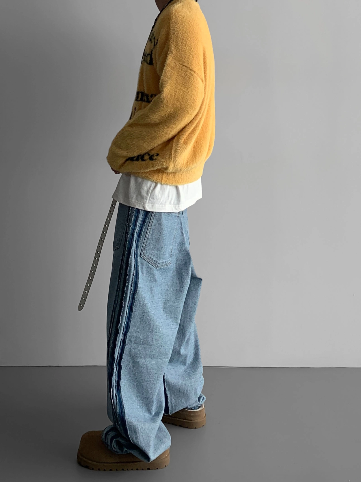 側軌線條強調復古情調,讓你只穿褲子就能完成 時尚造型。
