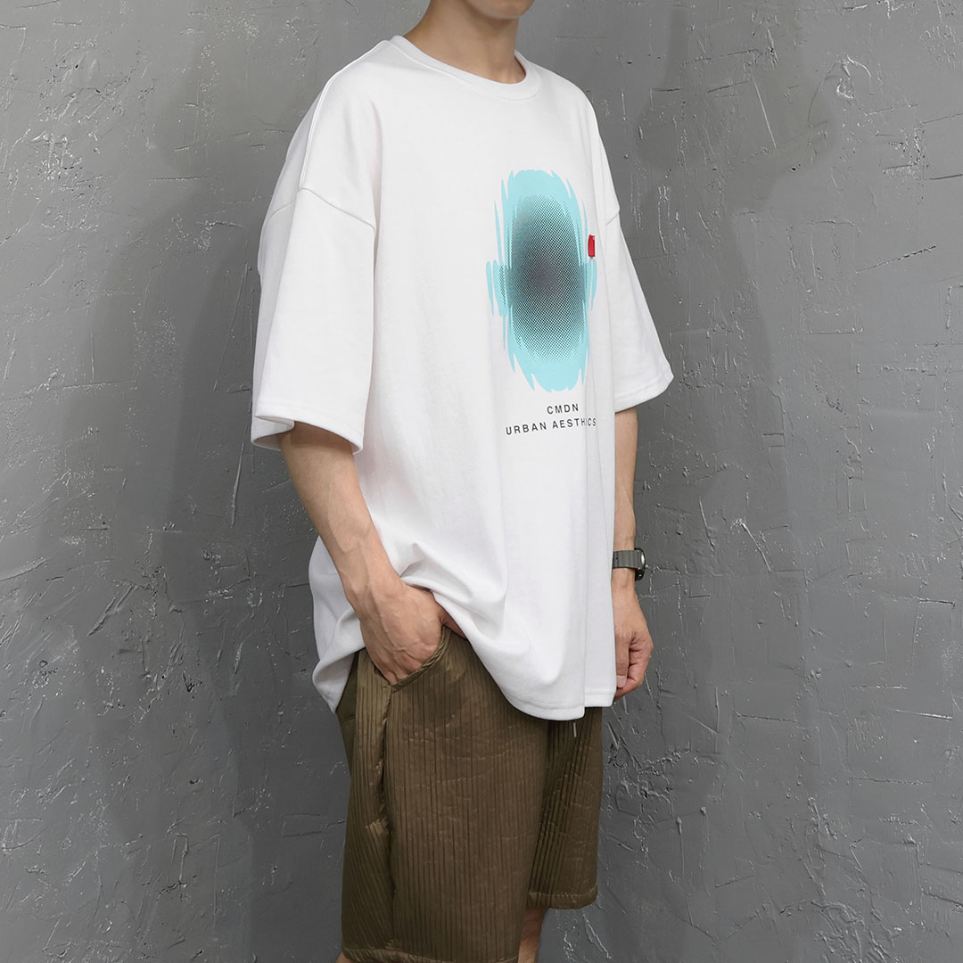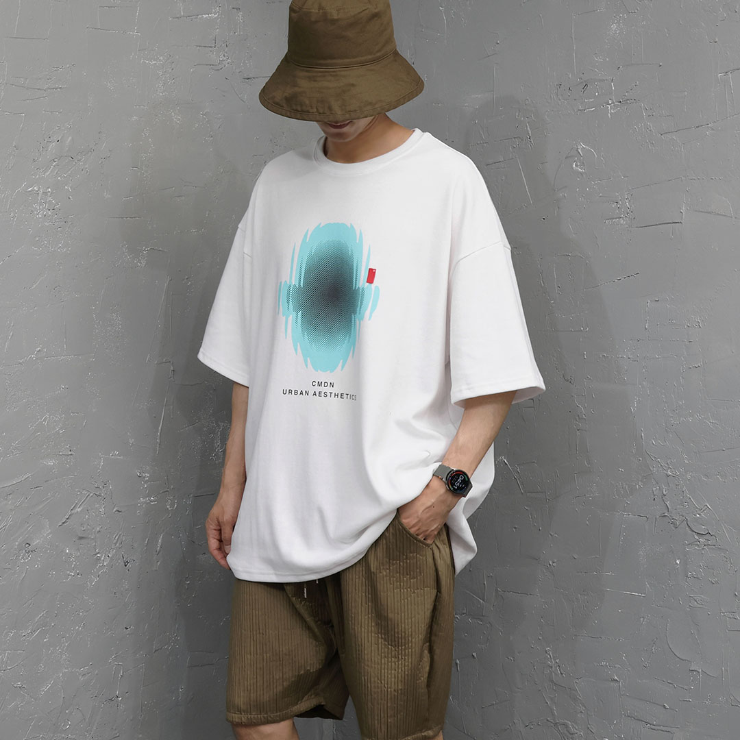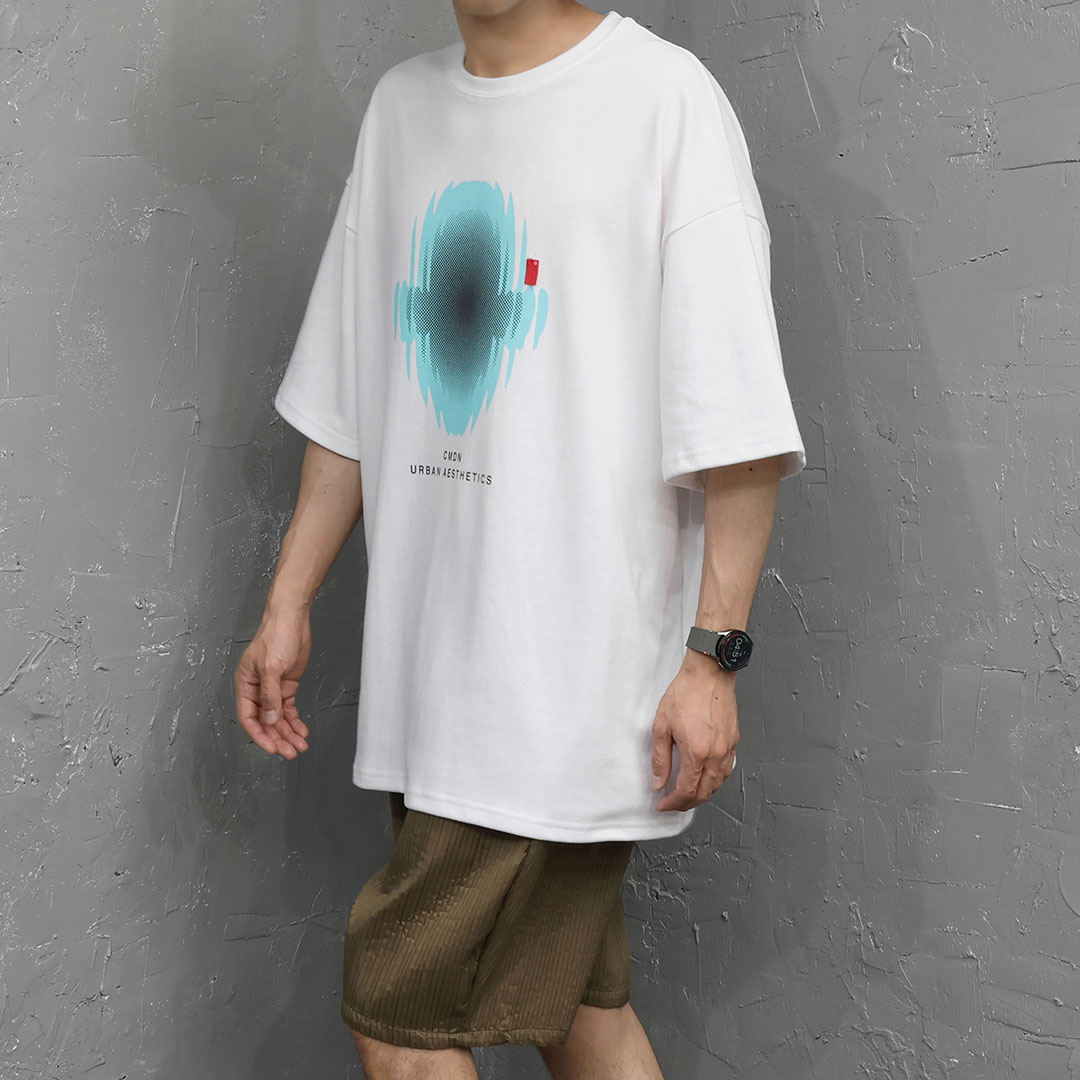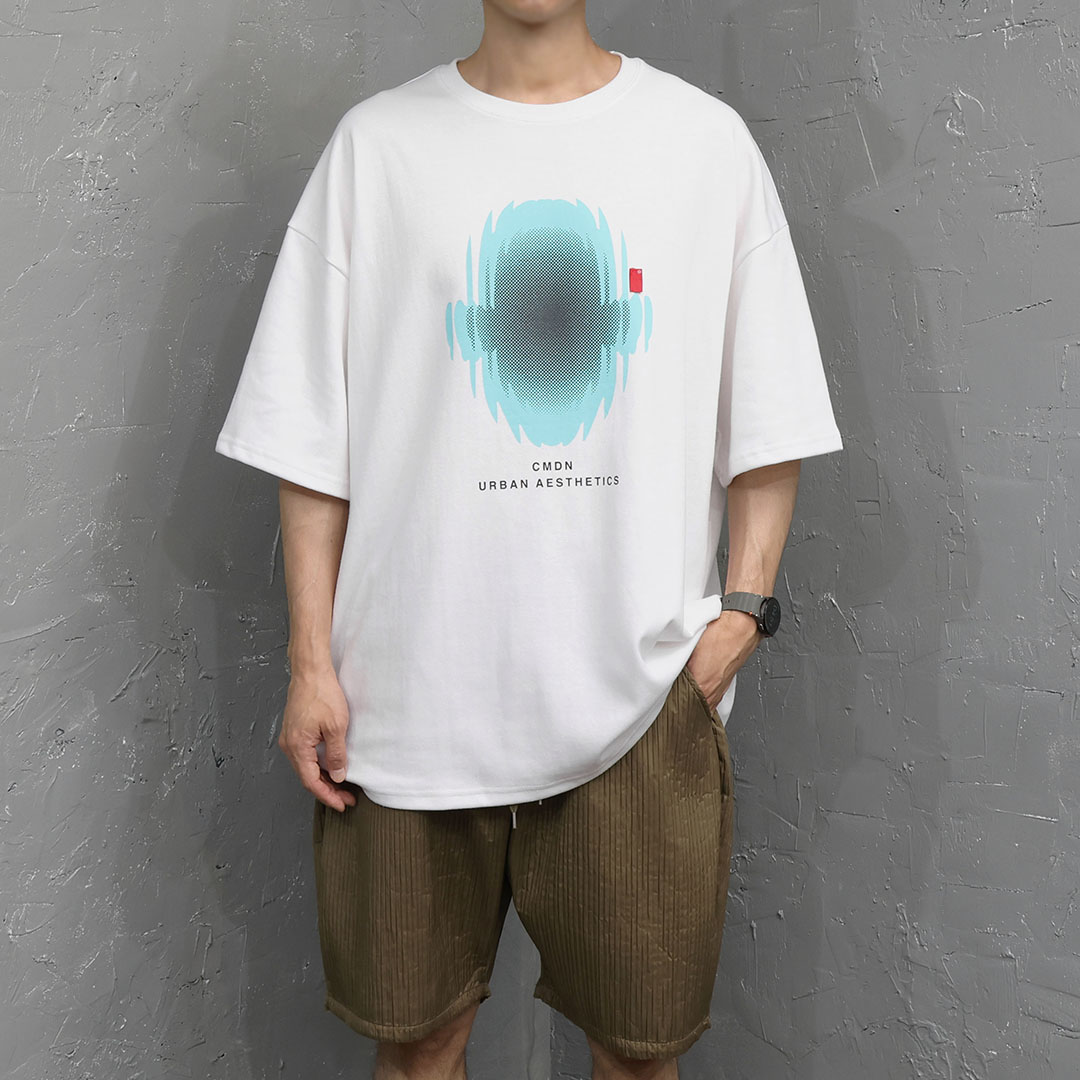 這件商品透過未來主義的插圖印花營造出一種超越簡單 T 恤的氛圍。