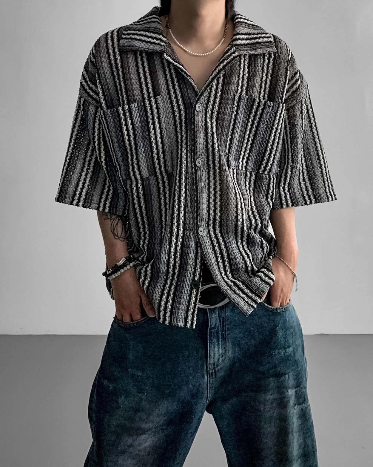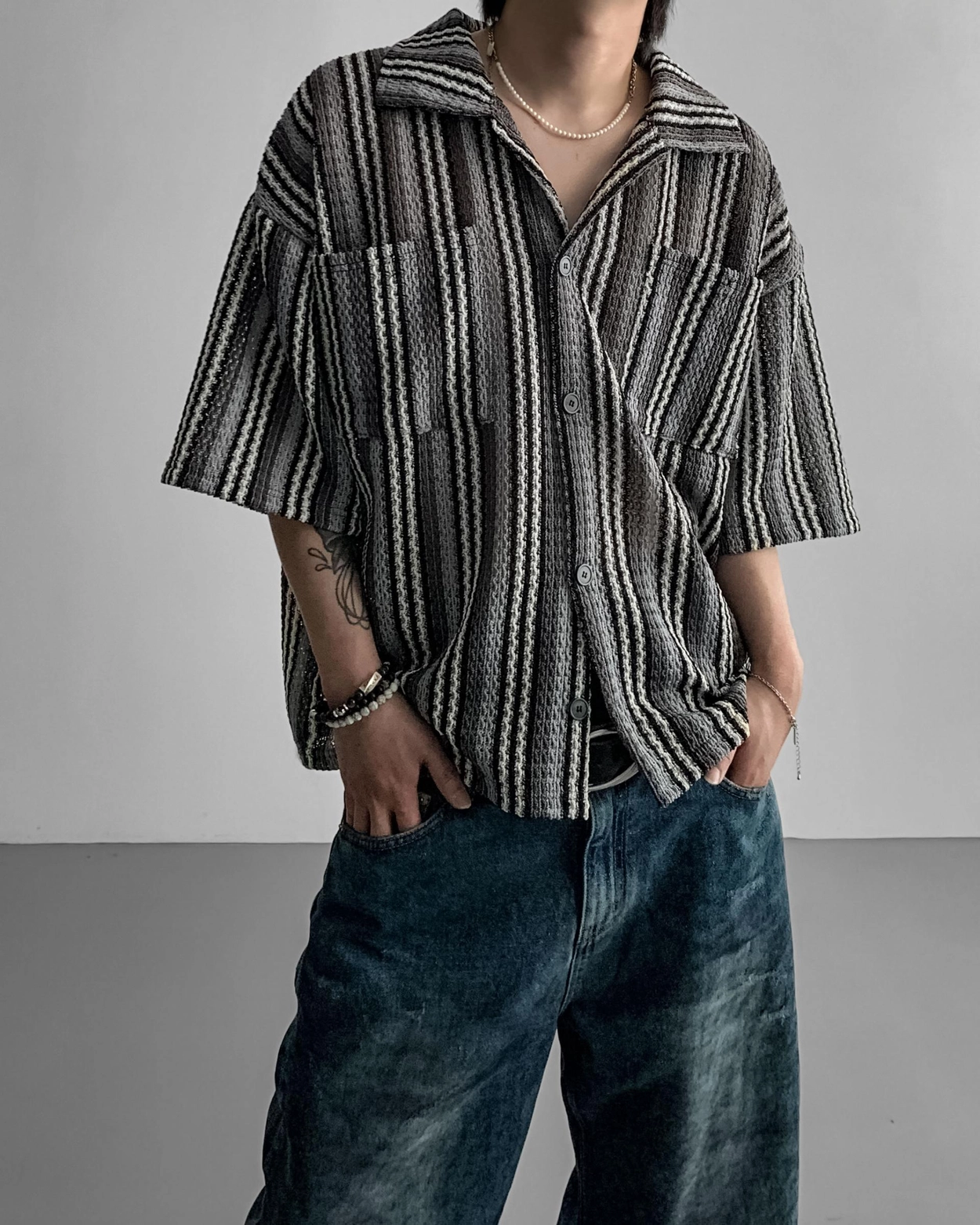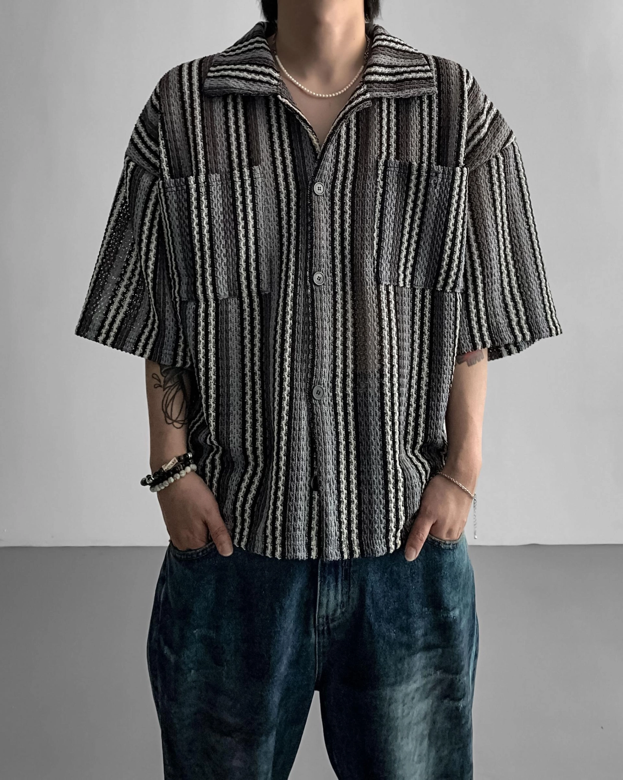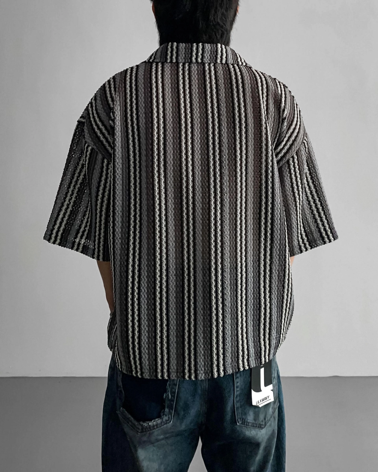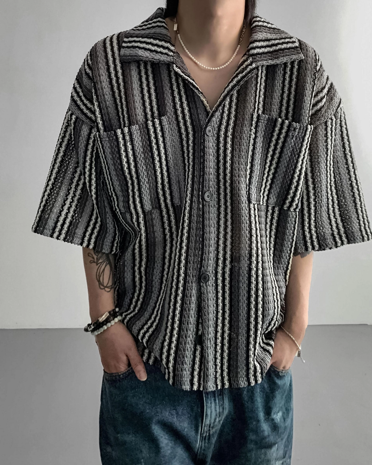 - 這是一件由棉質布料製成的條紋襯衫,穿著舒適,本身就可以成為焦點。