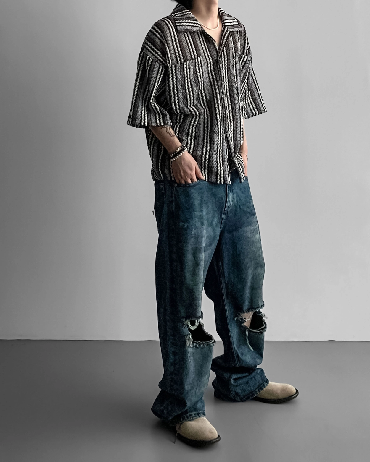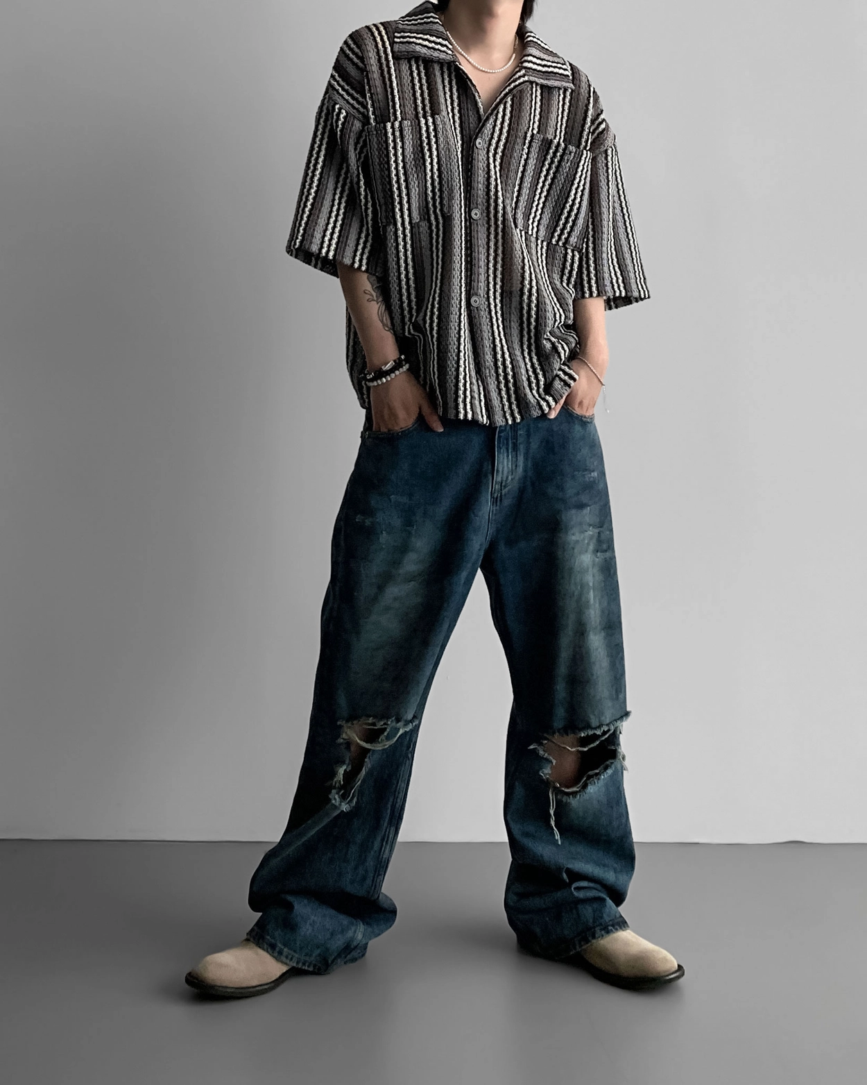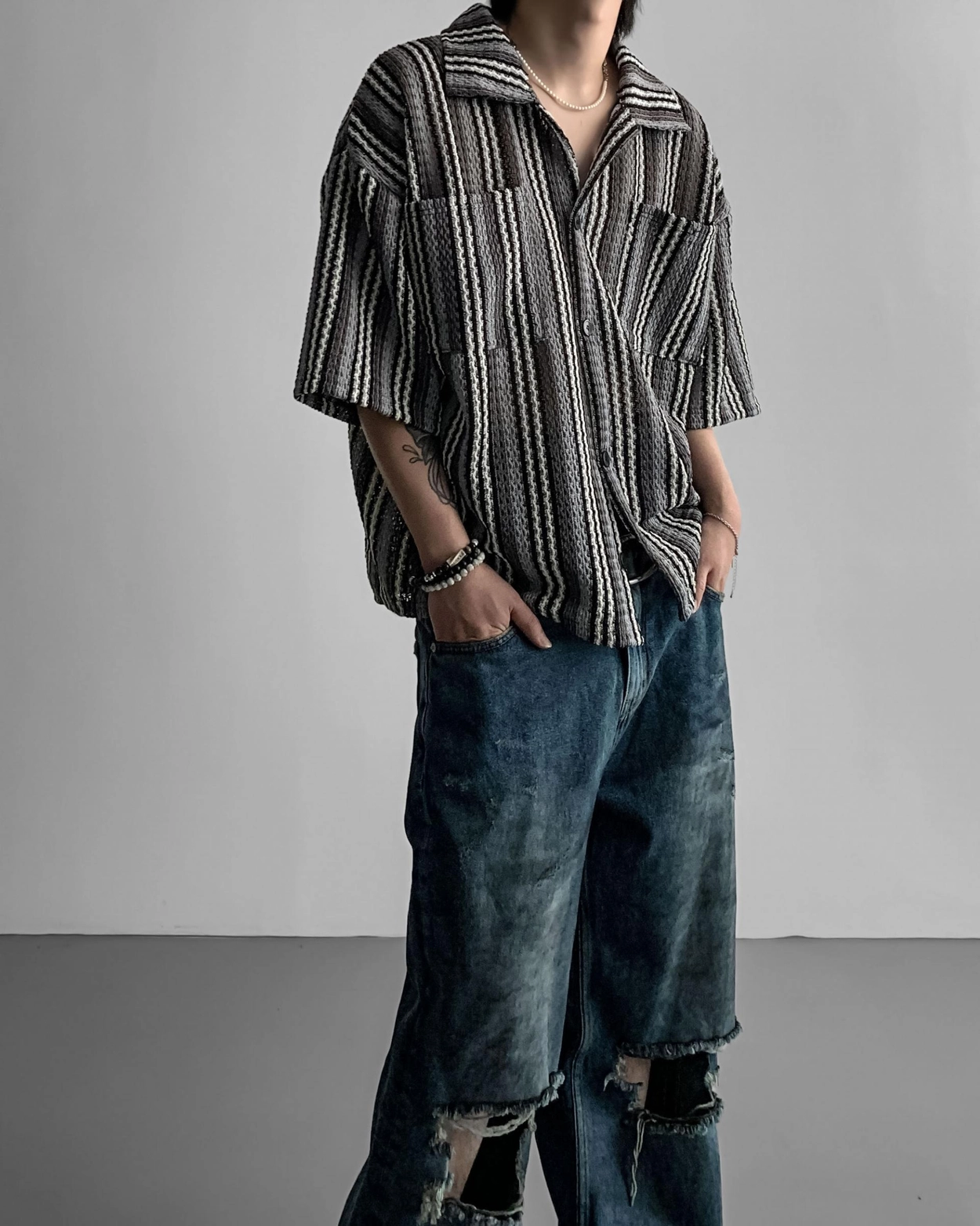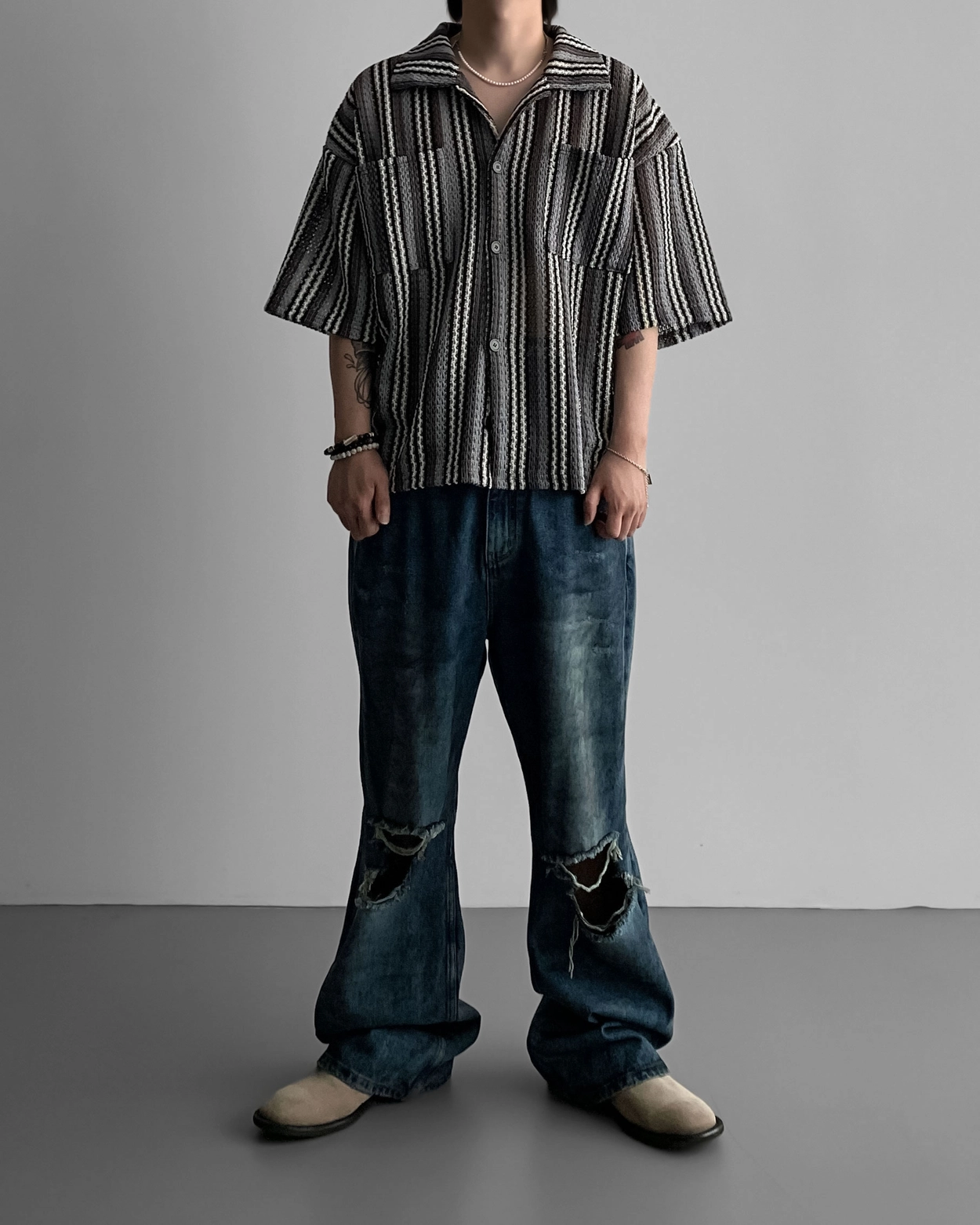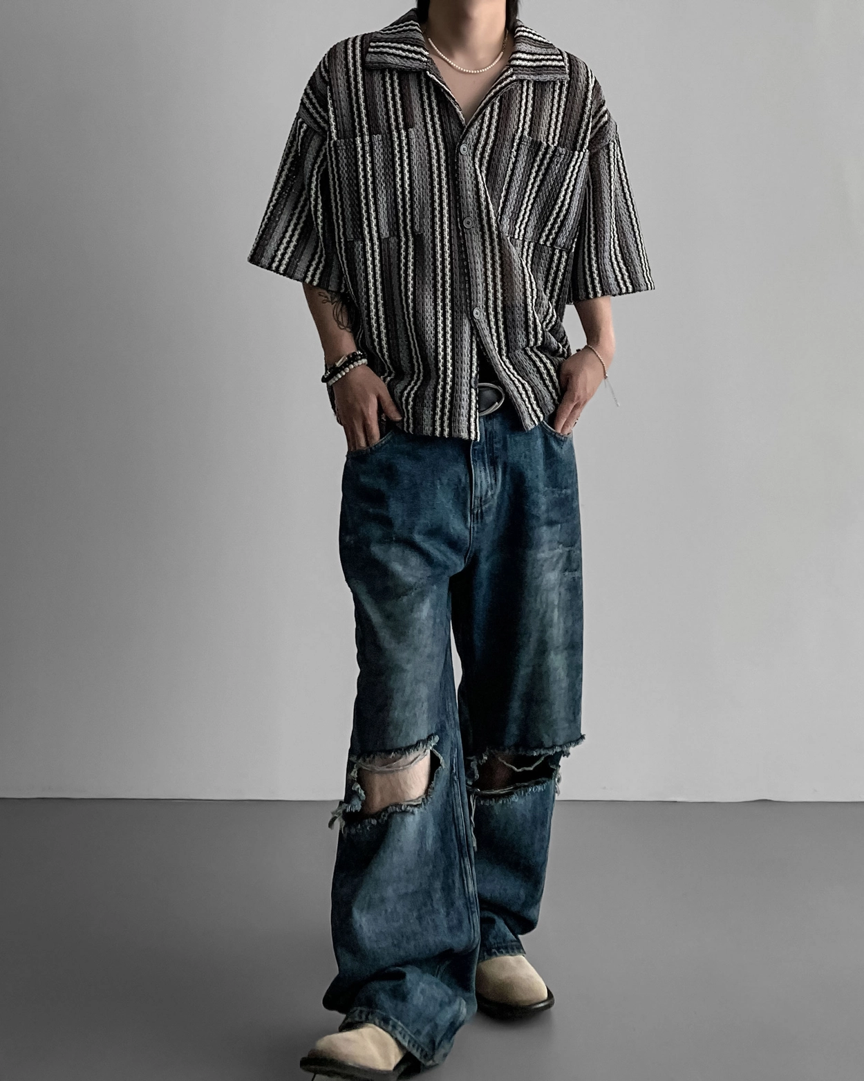 - 這是一件由棉質布料製成的條紋襯衫,穿著舒適,本身就可以成為焦點。