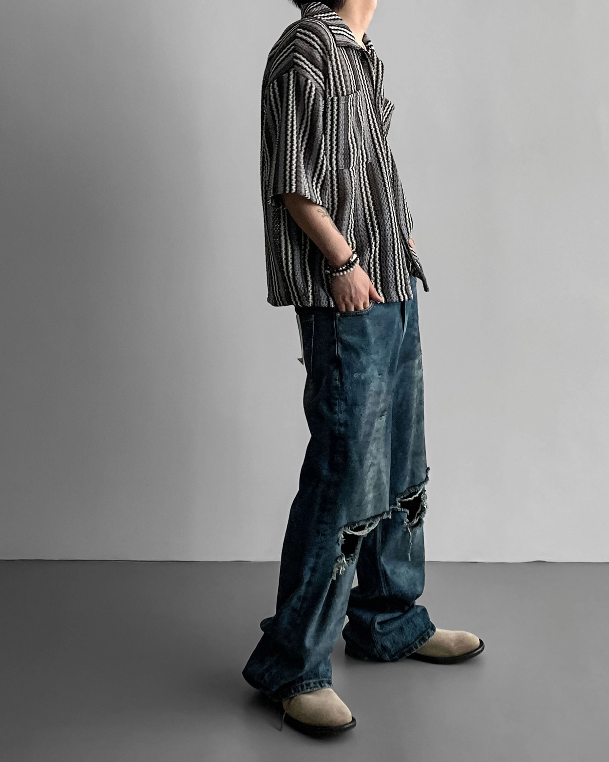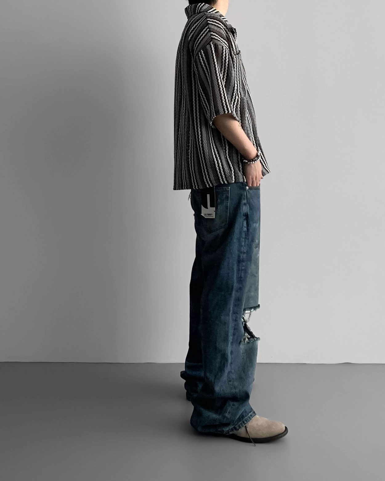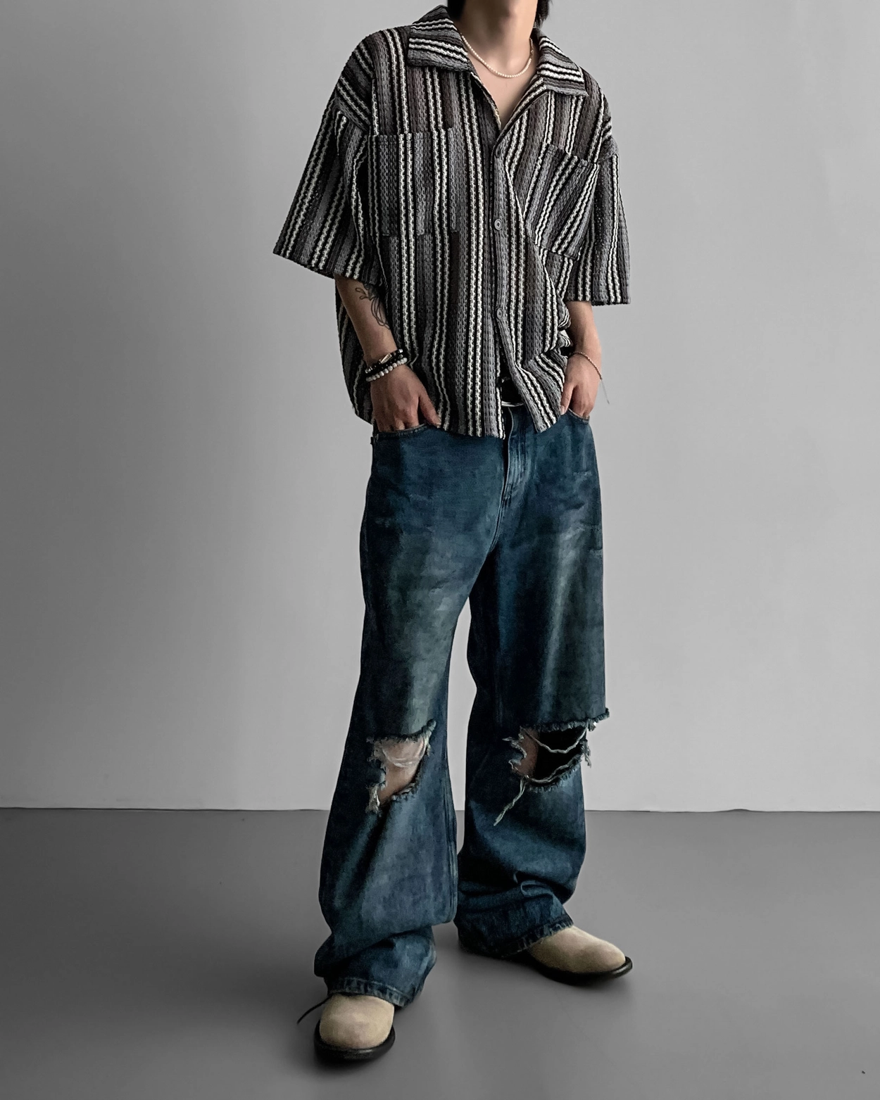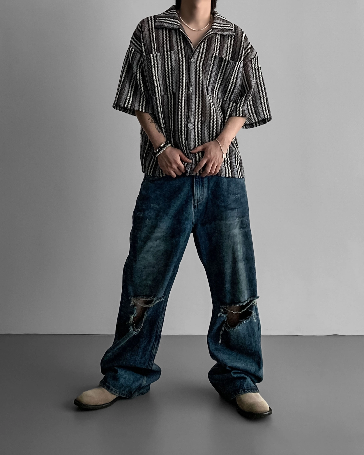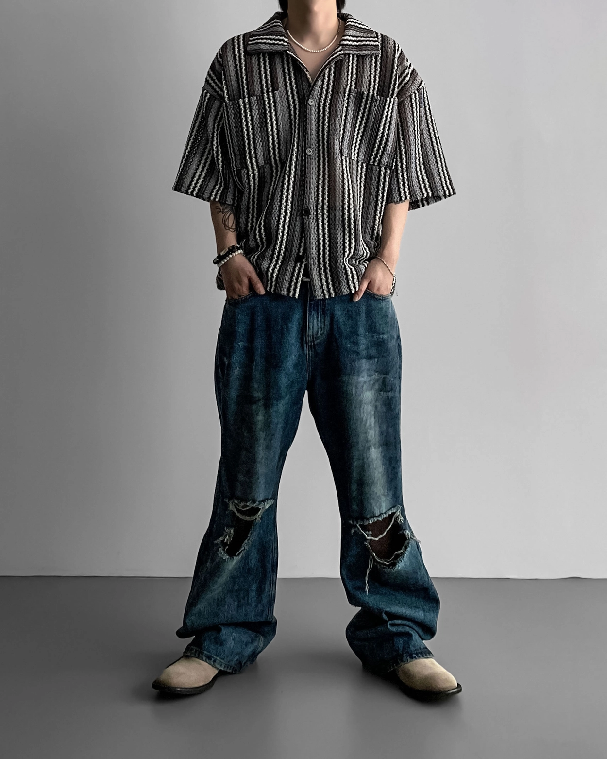 - 這是一件由棉質布料製成的條紋襯衫,穿著舒適,本身就可以成為焦點。