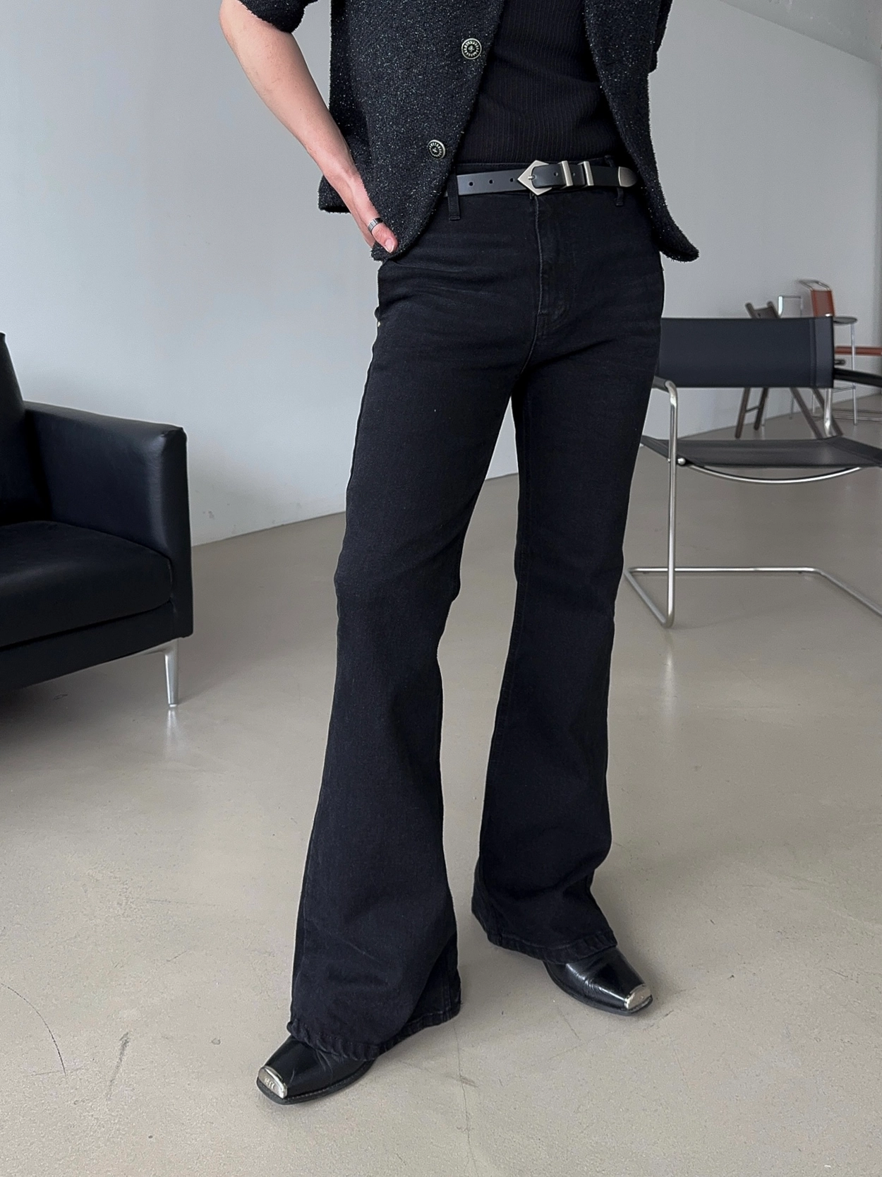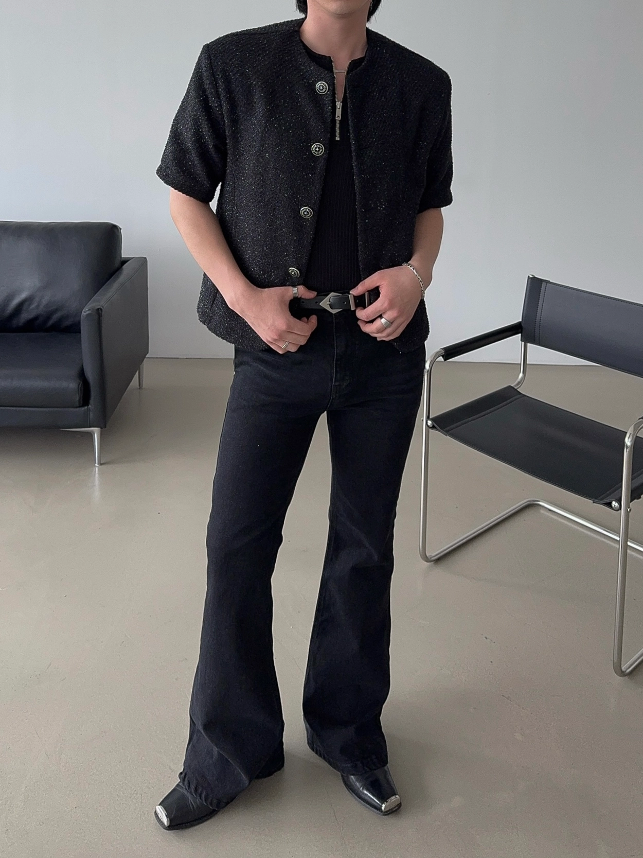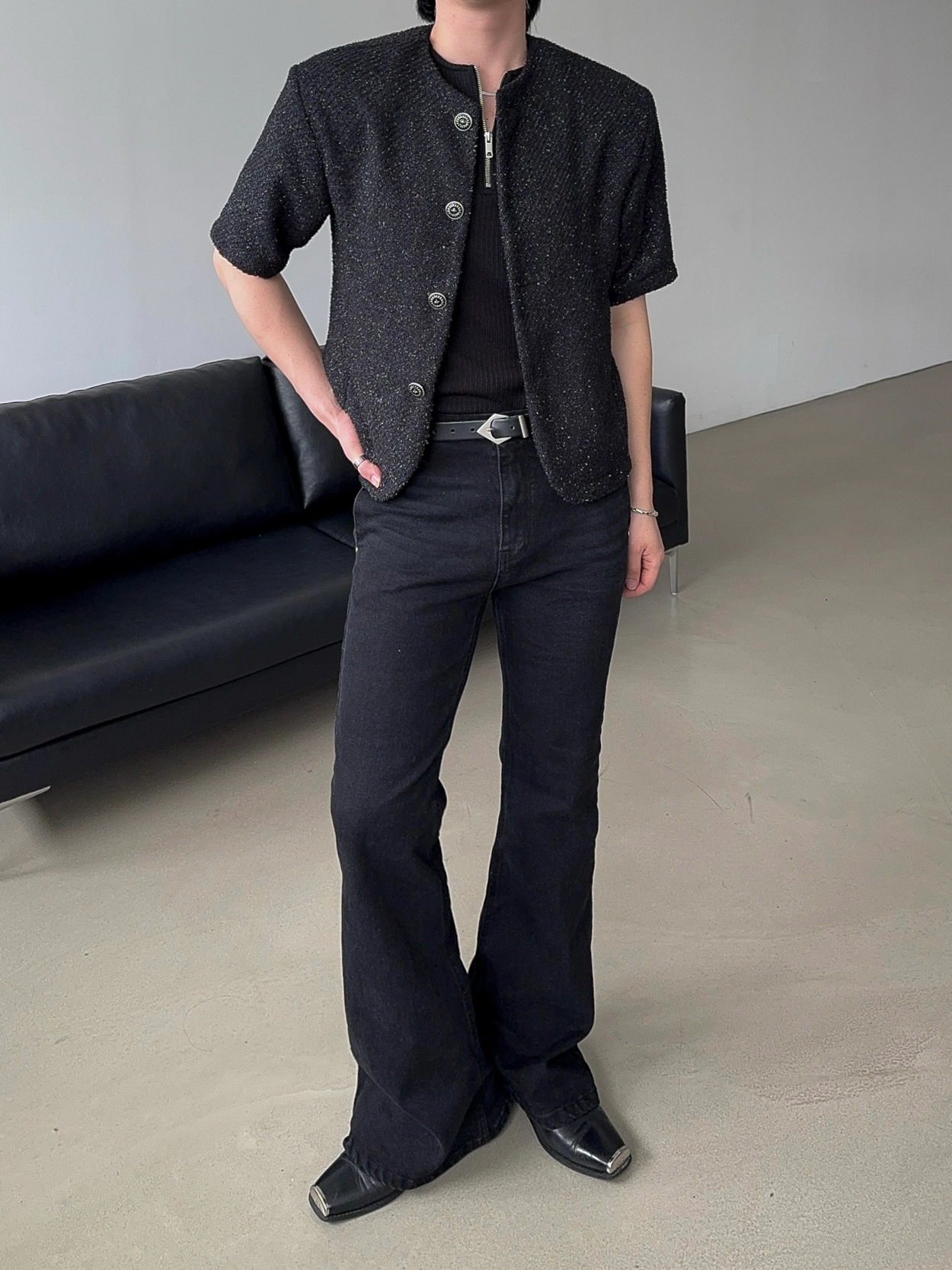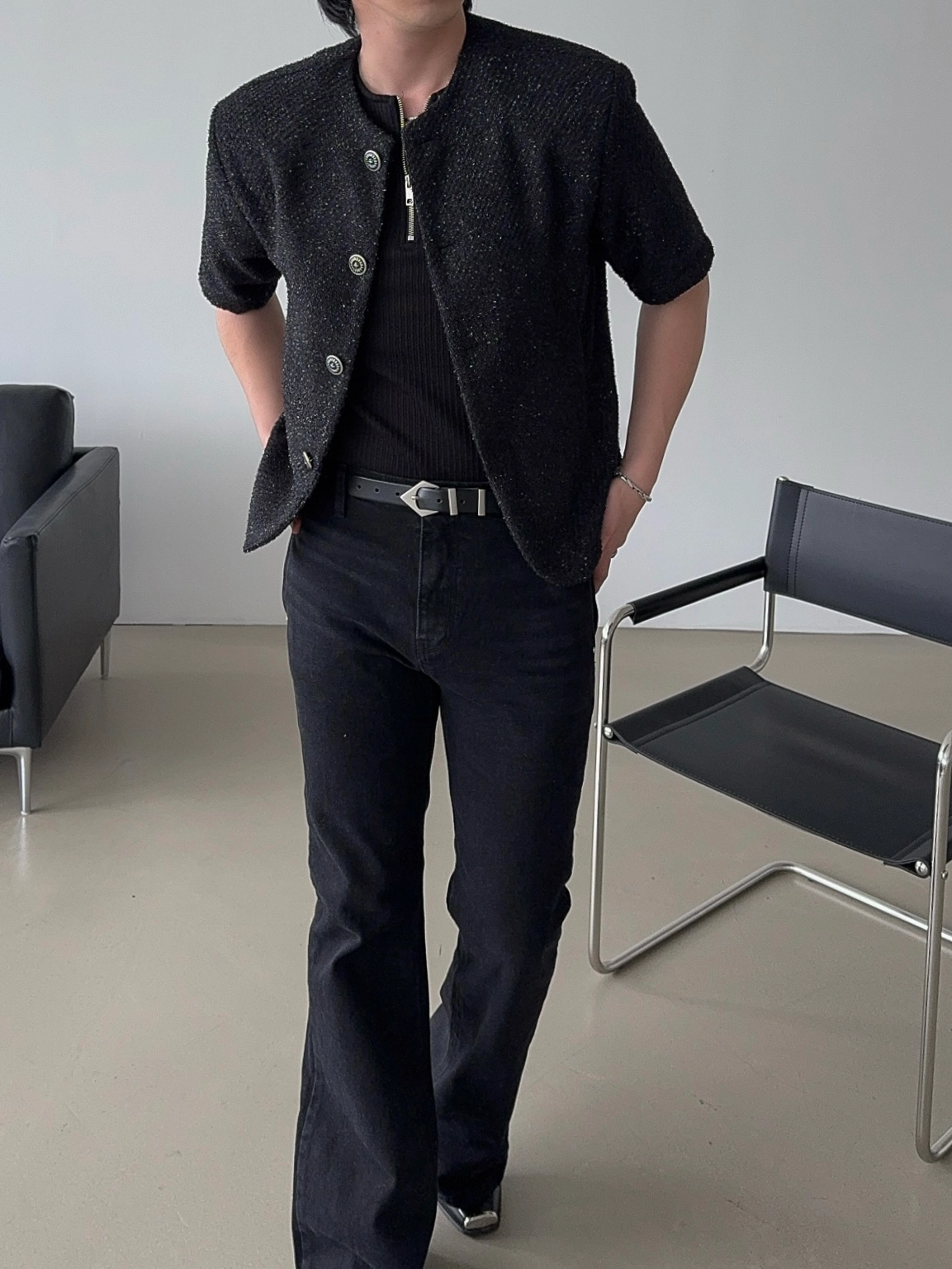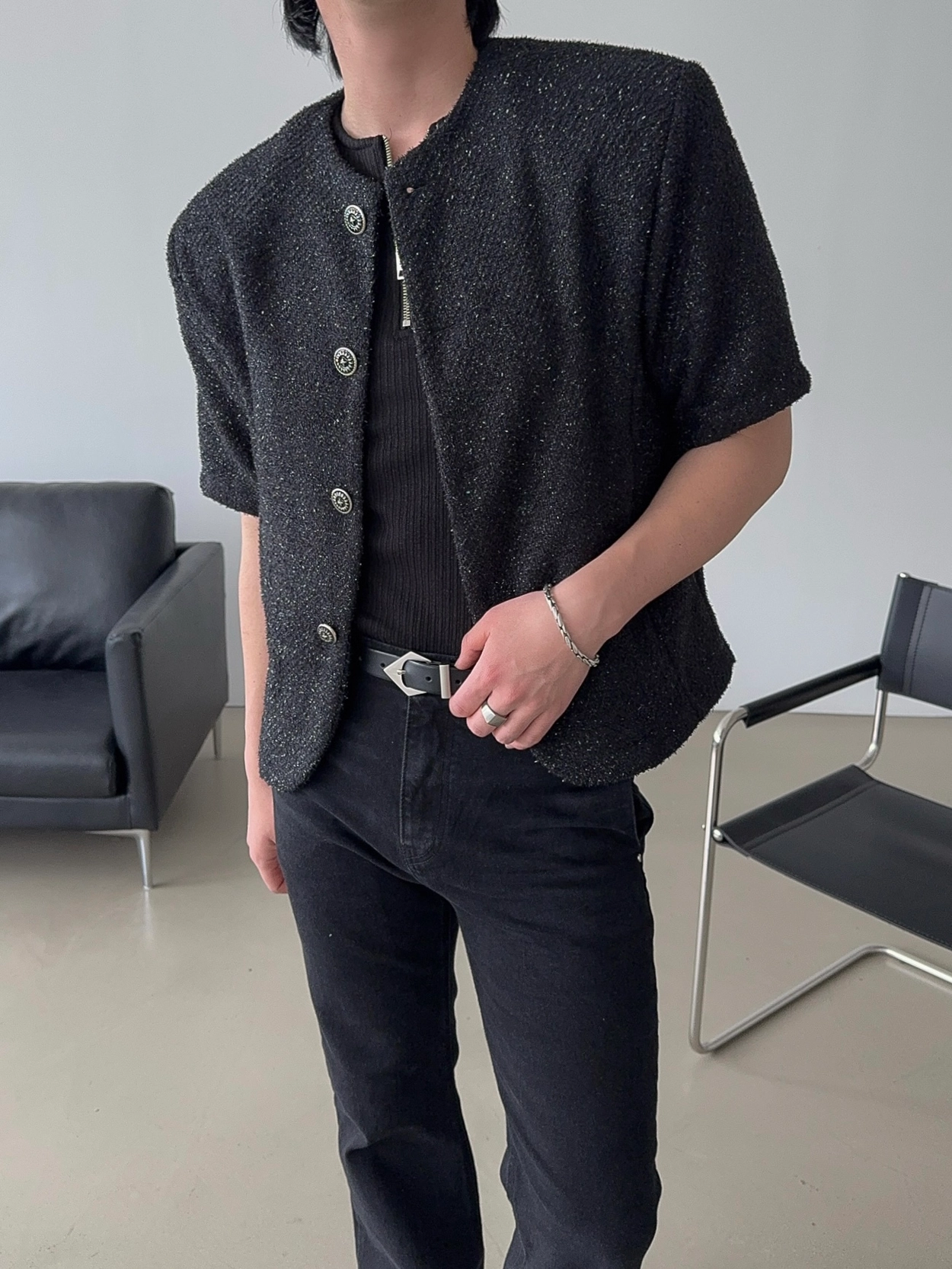 - 產品採用黑色粗花呢材質製成,具有微妙的珍珠質感