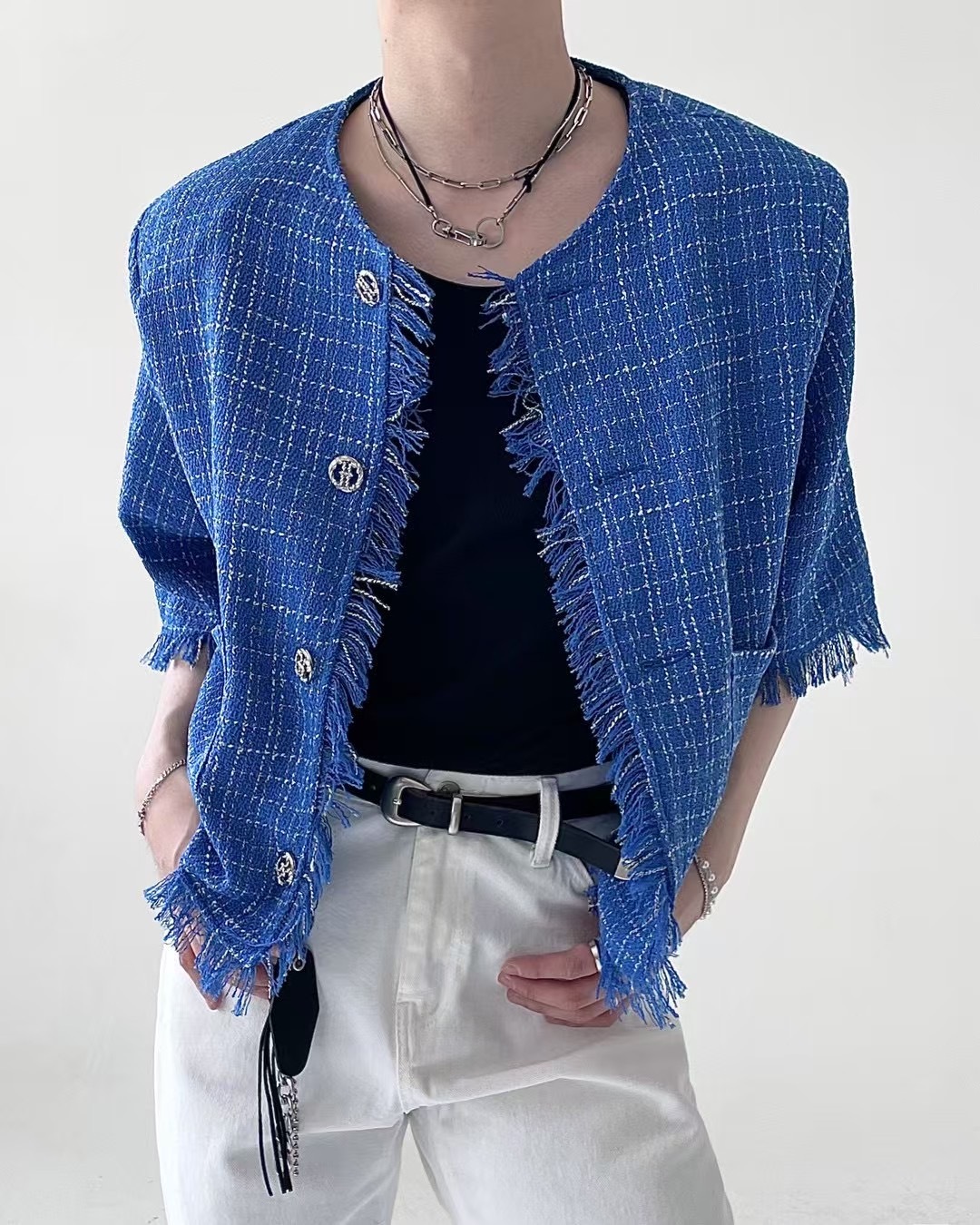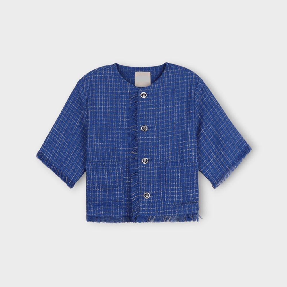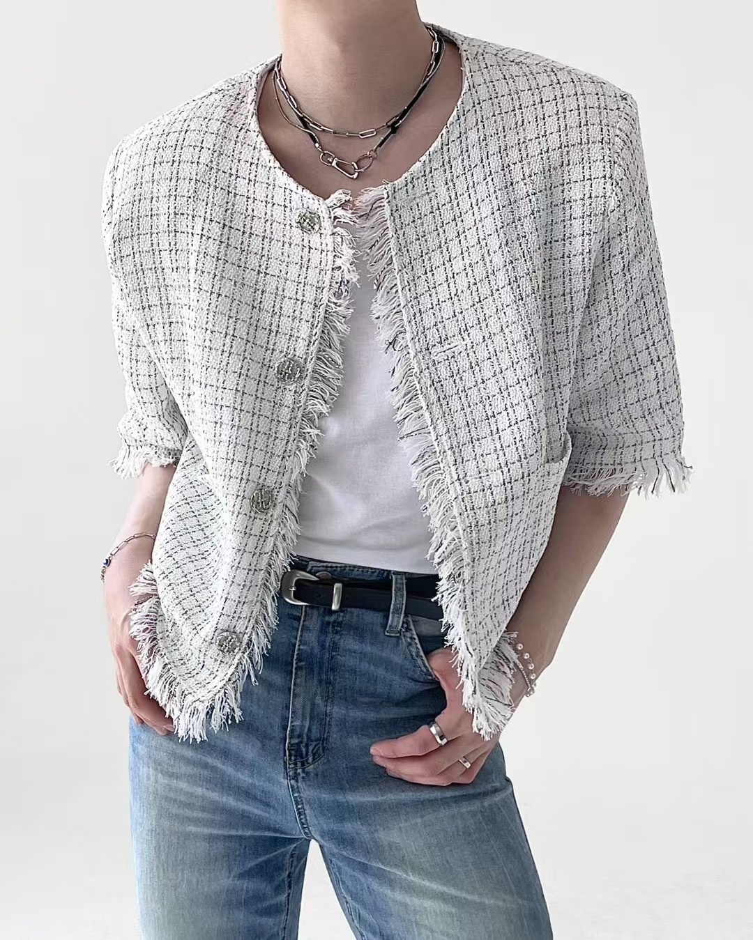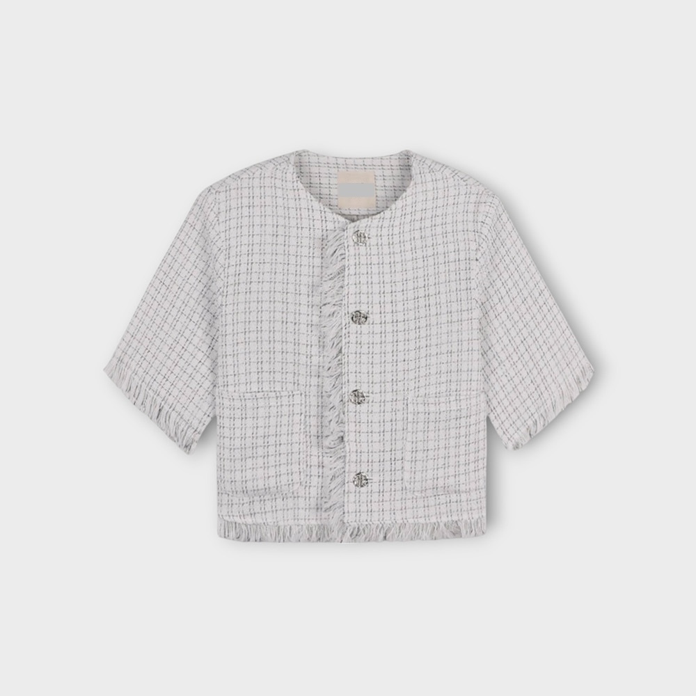 1. 一件粗花呢短袖夾克,採用性感的白色和藍色配色,並帶有精緻的格子圖案。