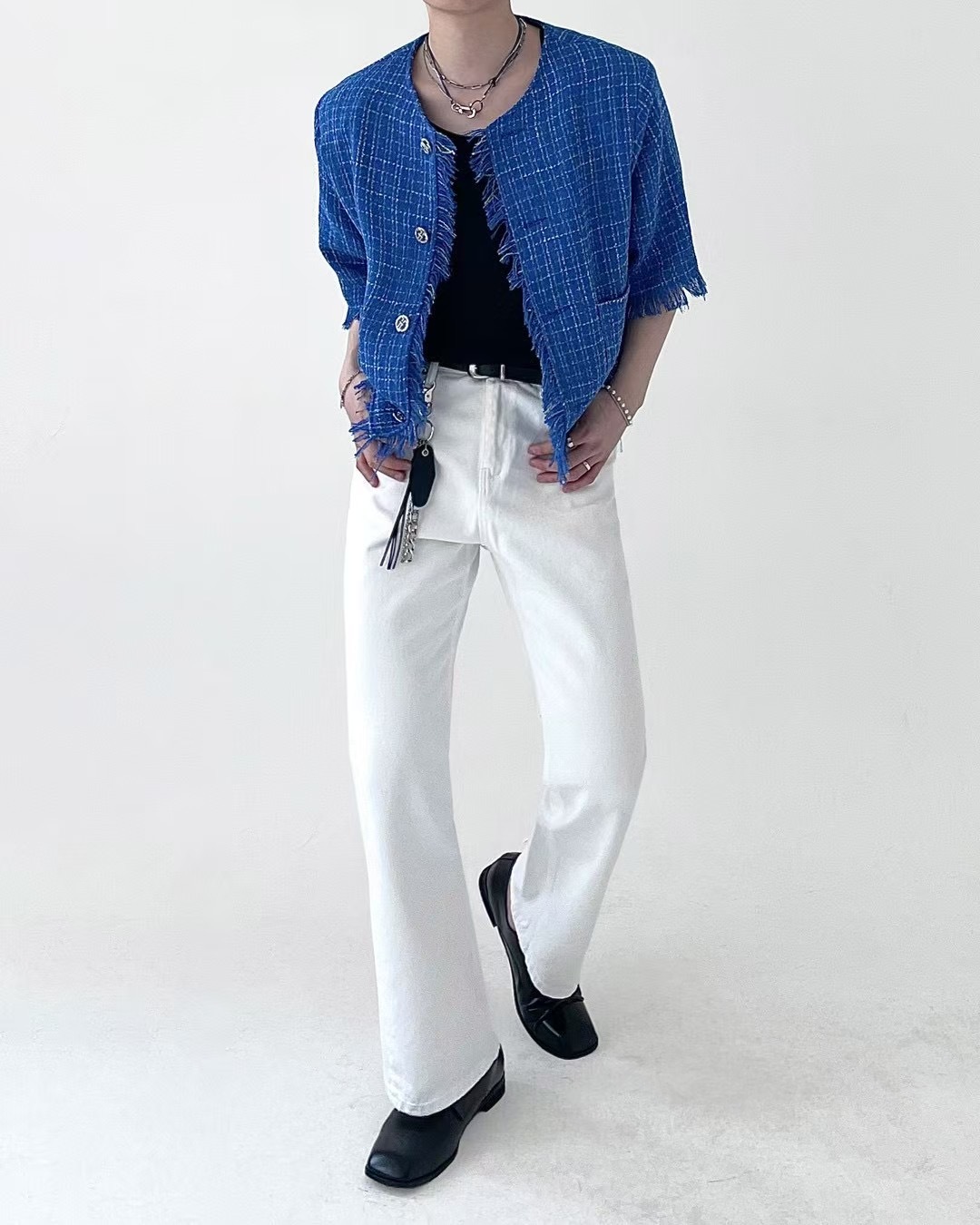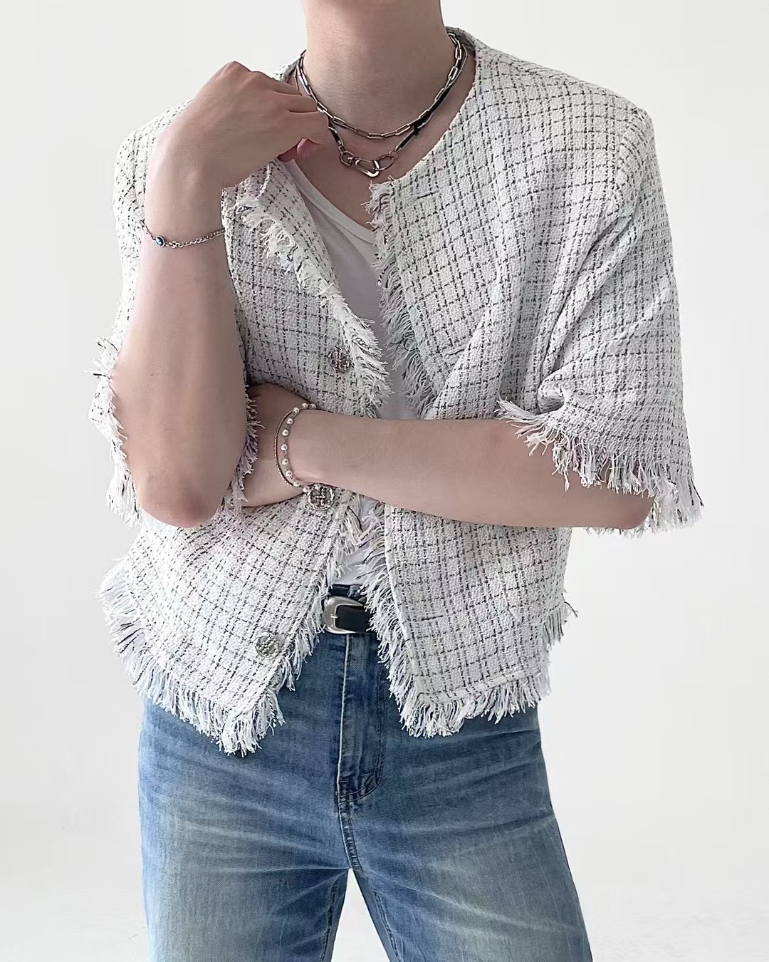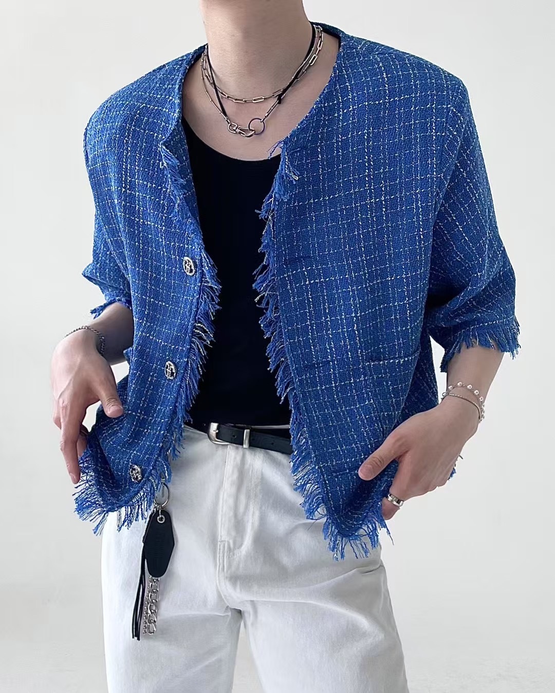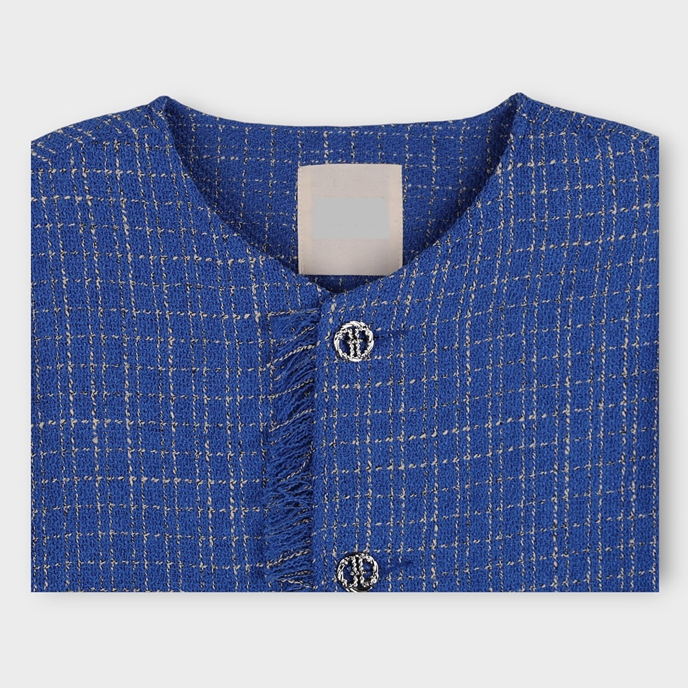 1. 一件粗花呢短袖夾克,採用性感的白色和藍色配色,並帶有精緻的格子圖案。