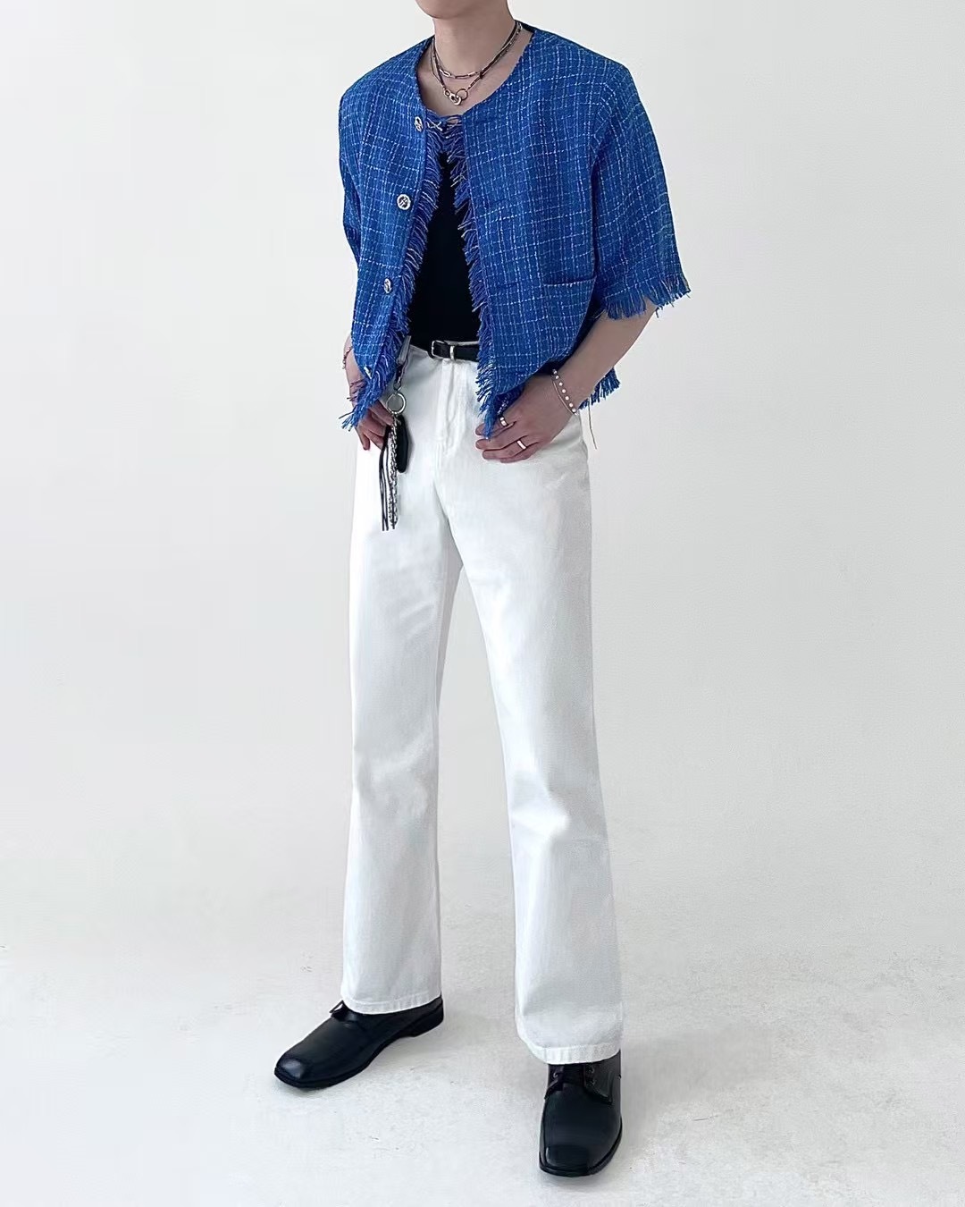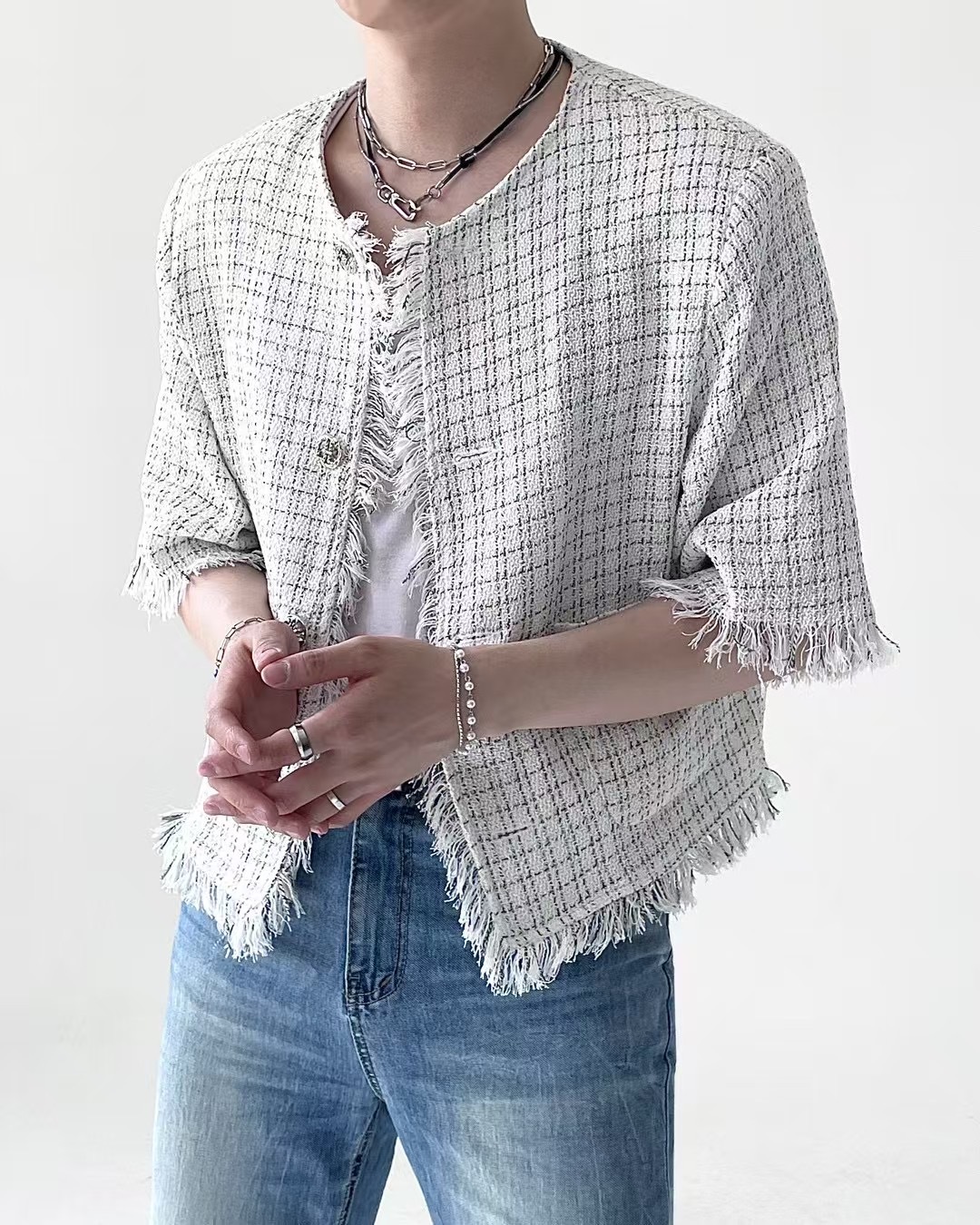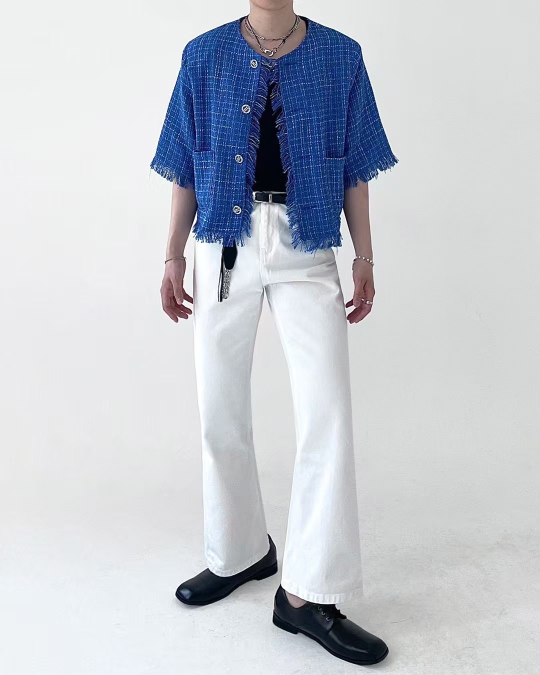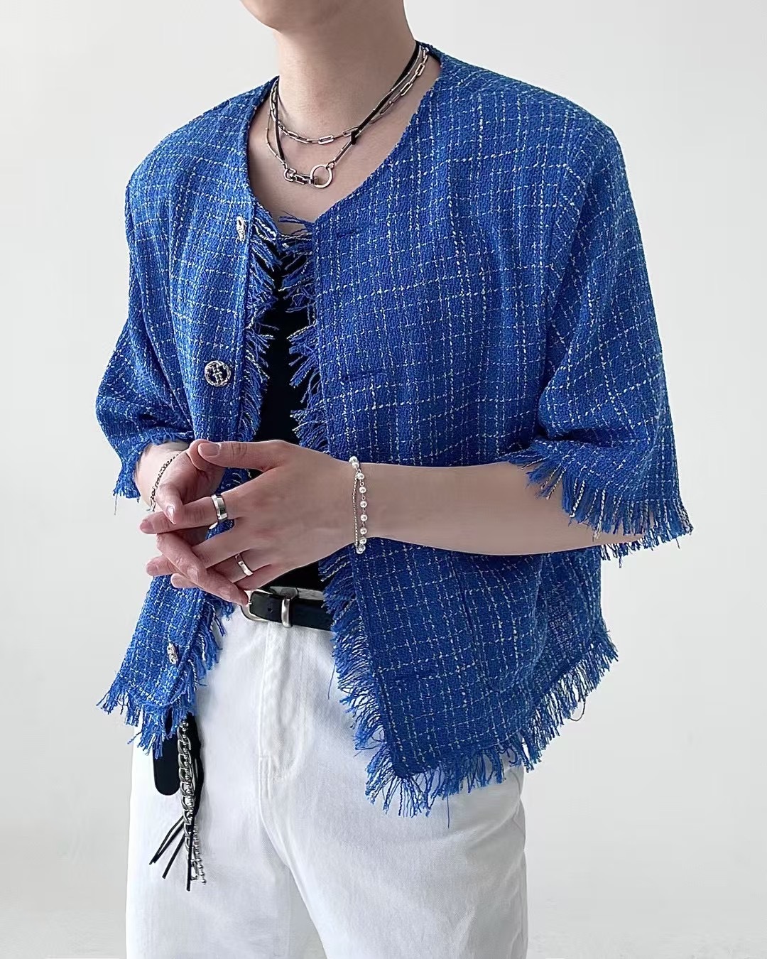 1. 一件粗花呢短袖夾克,採用性感的白色和藍色配色,並帶有精緻的格子圖案。