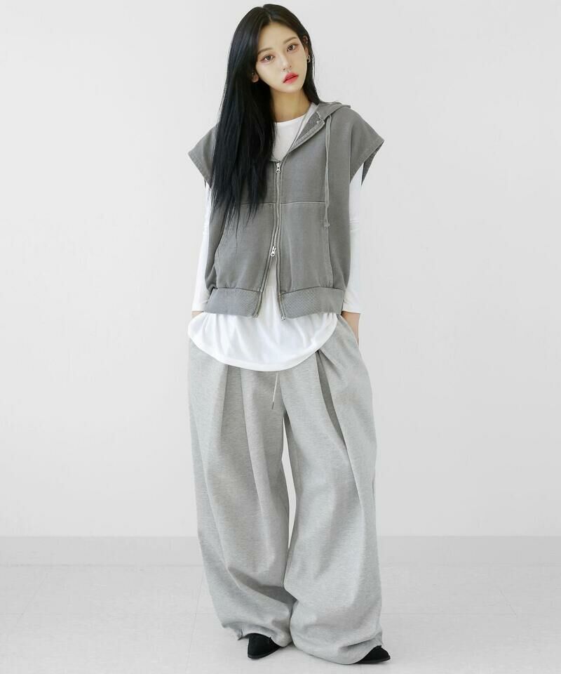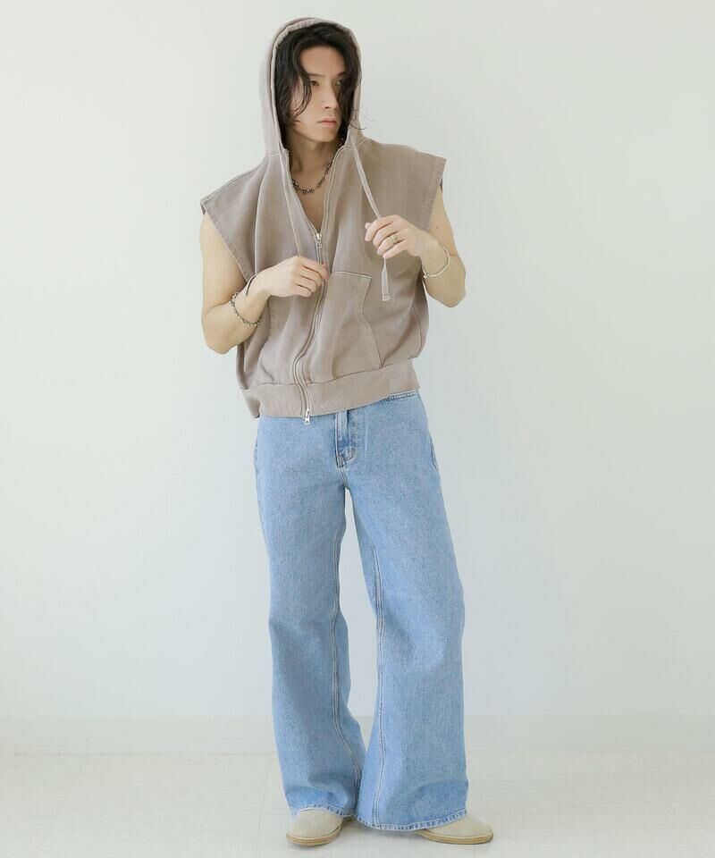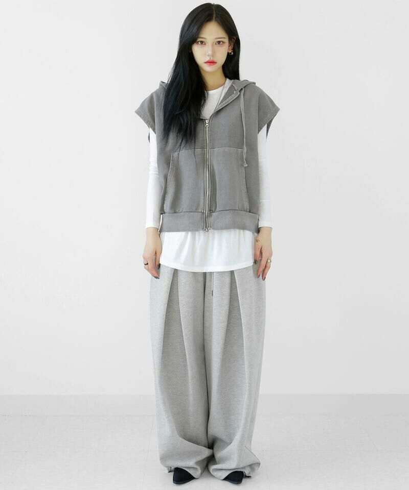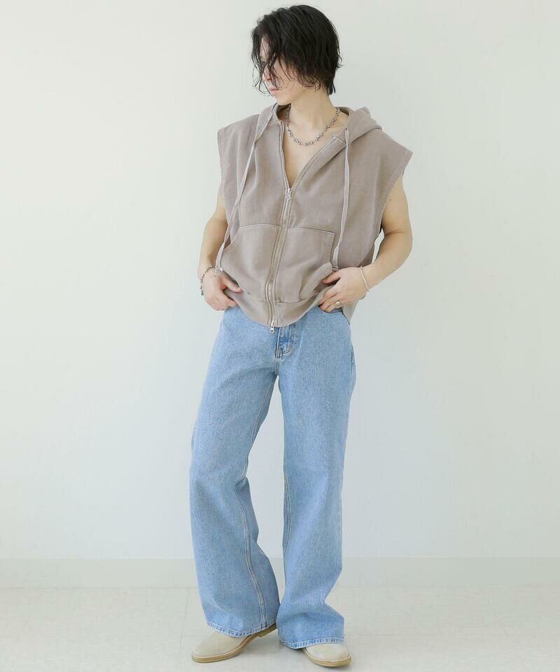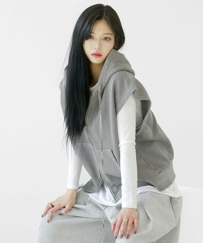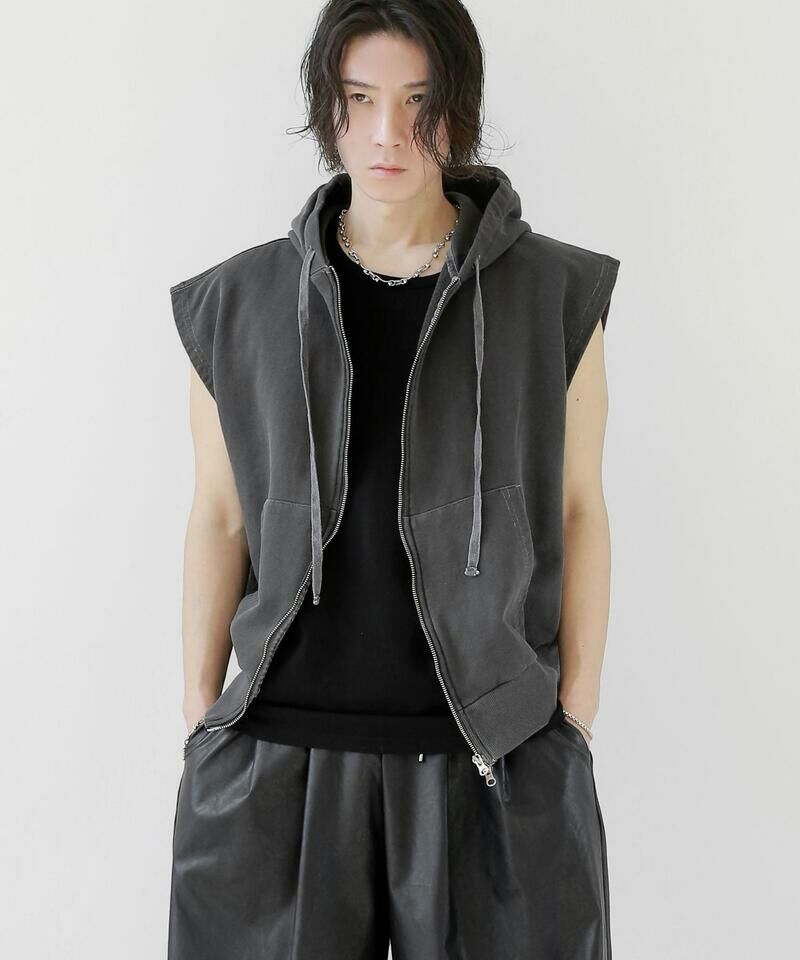 顏料洗滌連帽拉鍊背心。