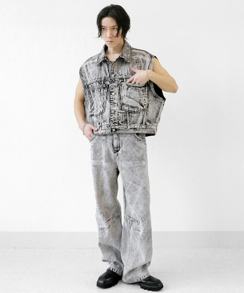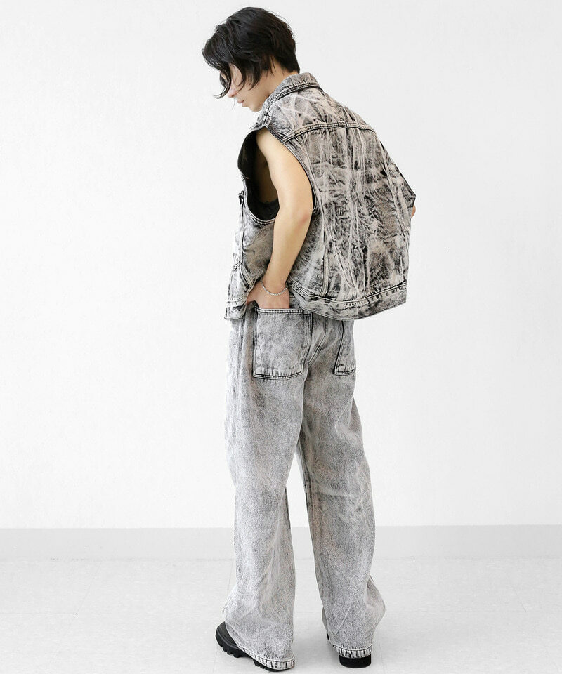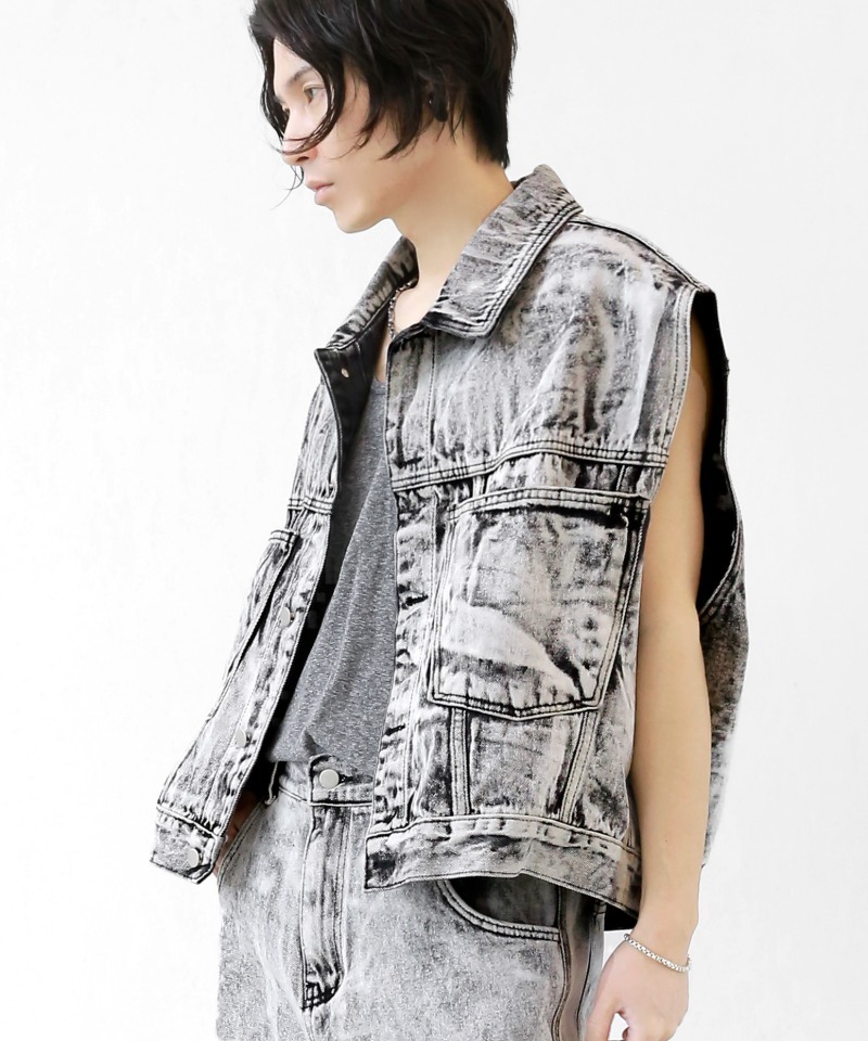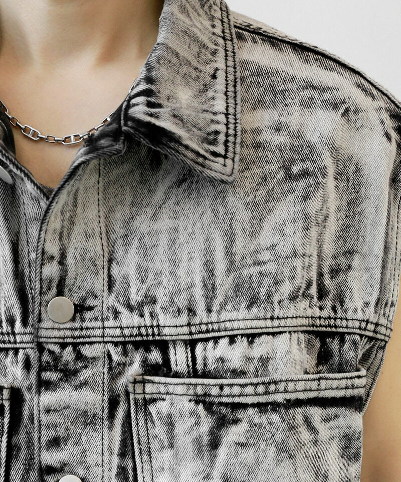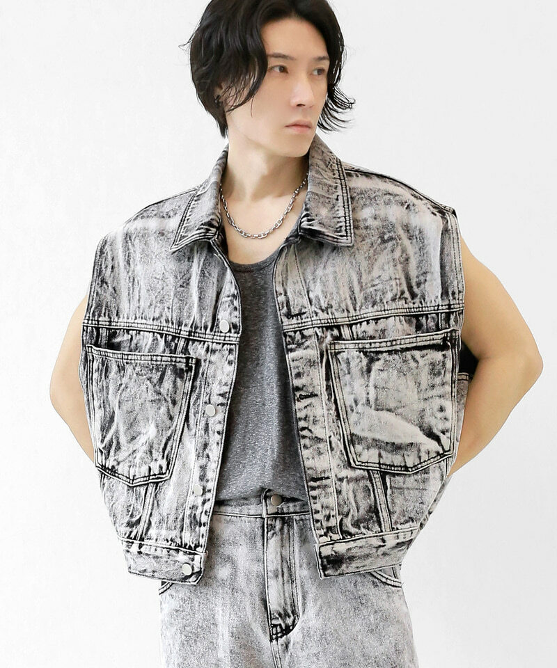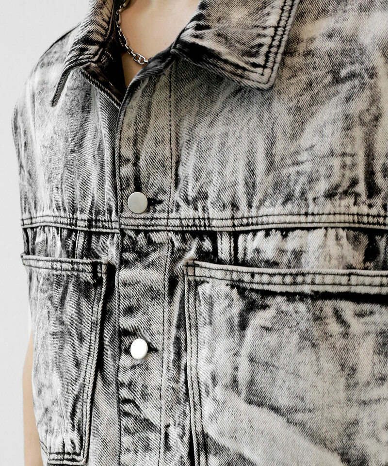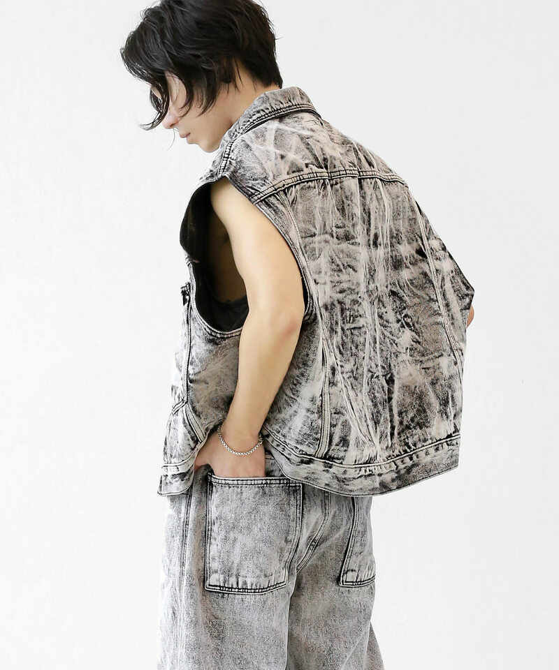 經過水洗牛仔背心,具有獨特的褪色外觀和復古感。