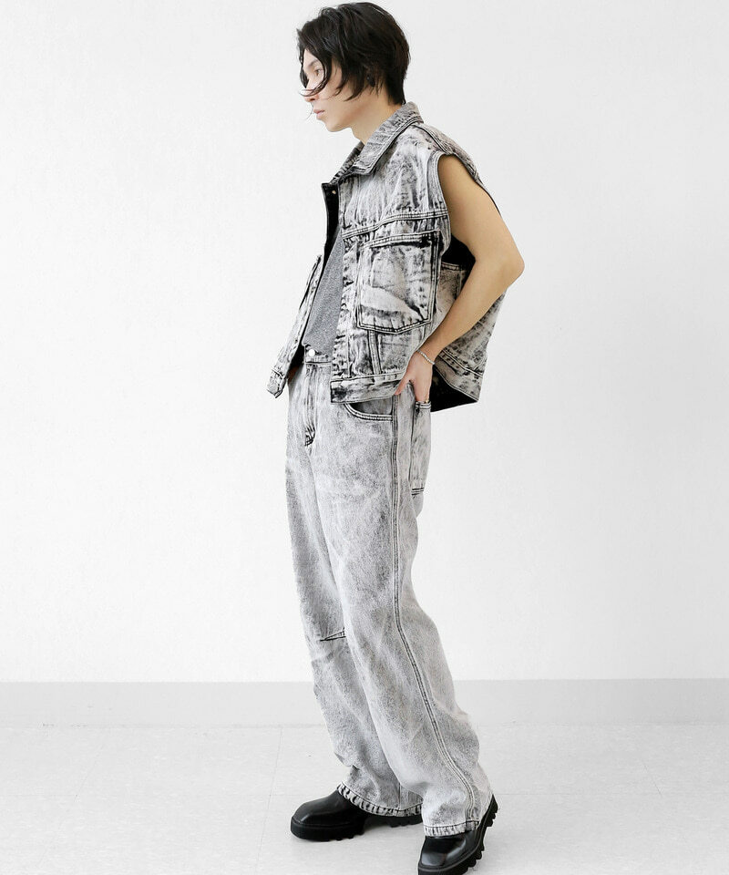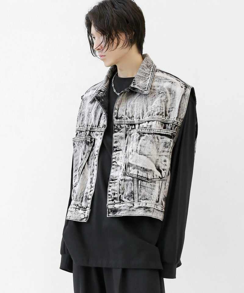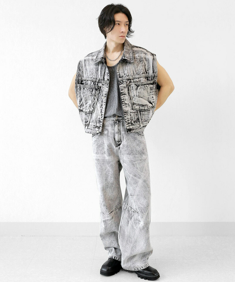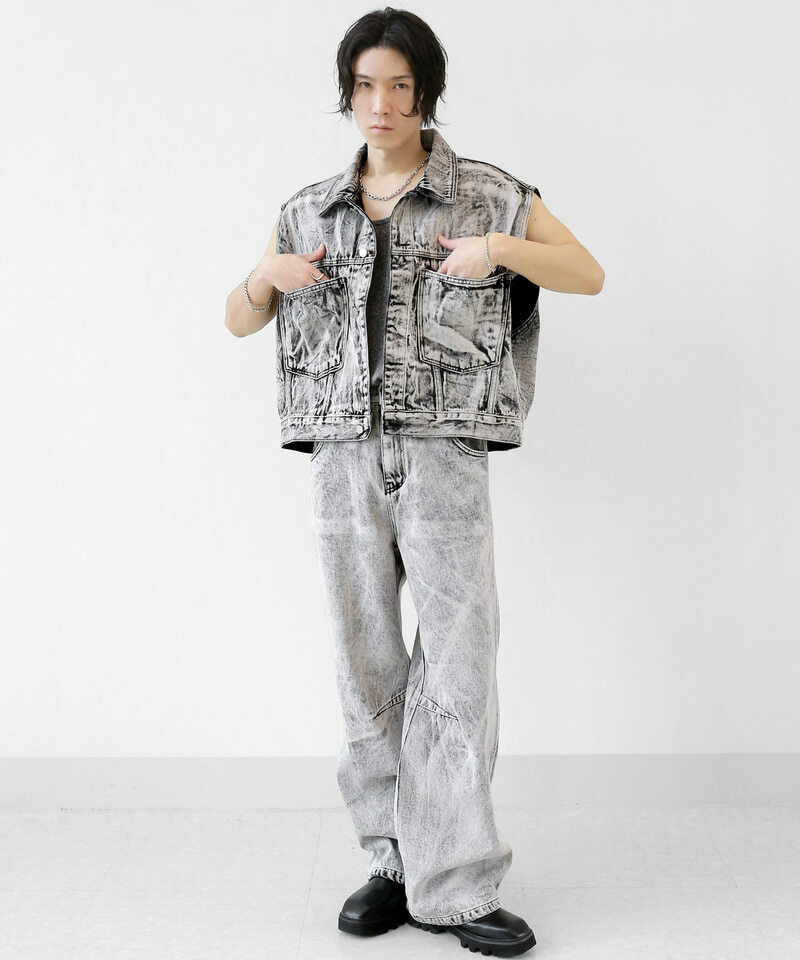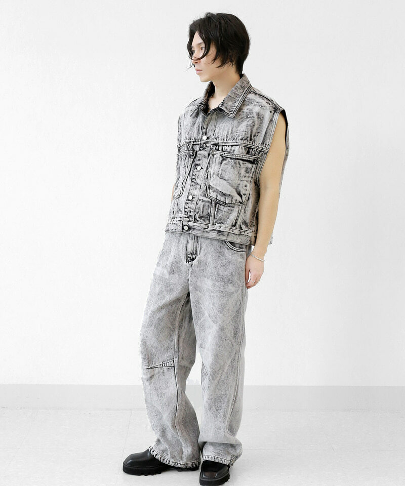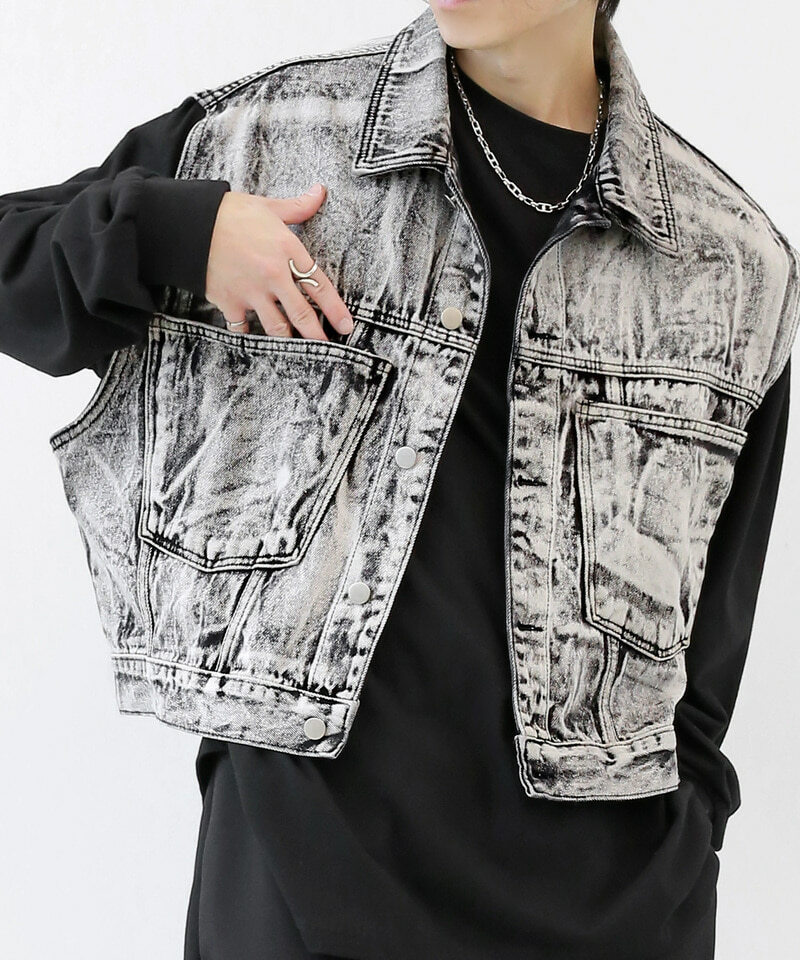 經過水洗牛仔背心,具有獨特的褪色外觀和復古感。