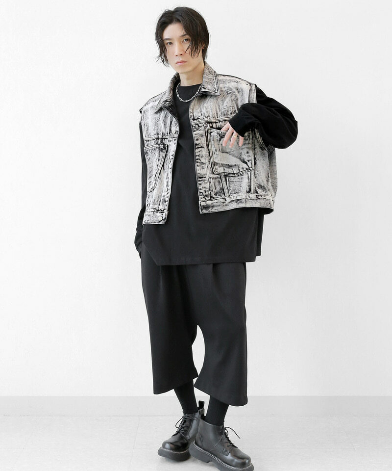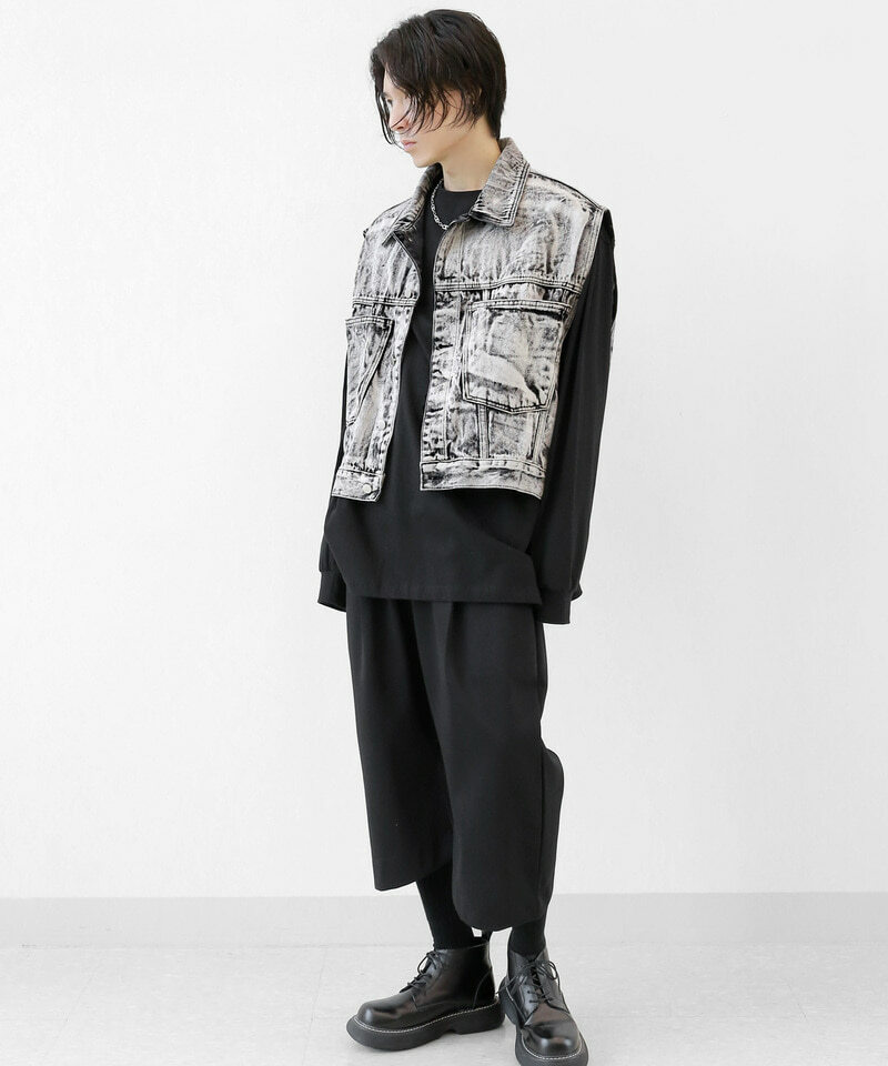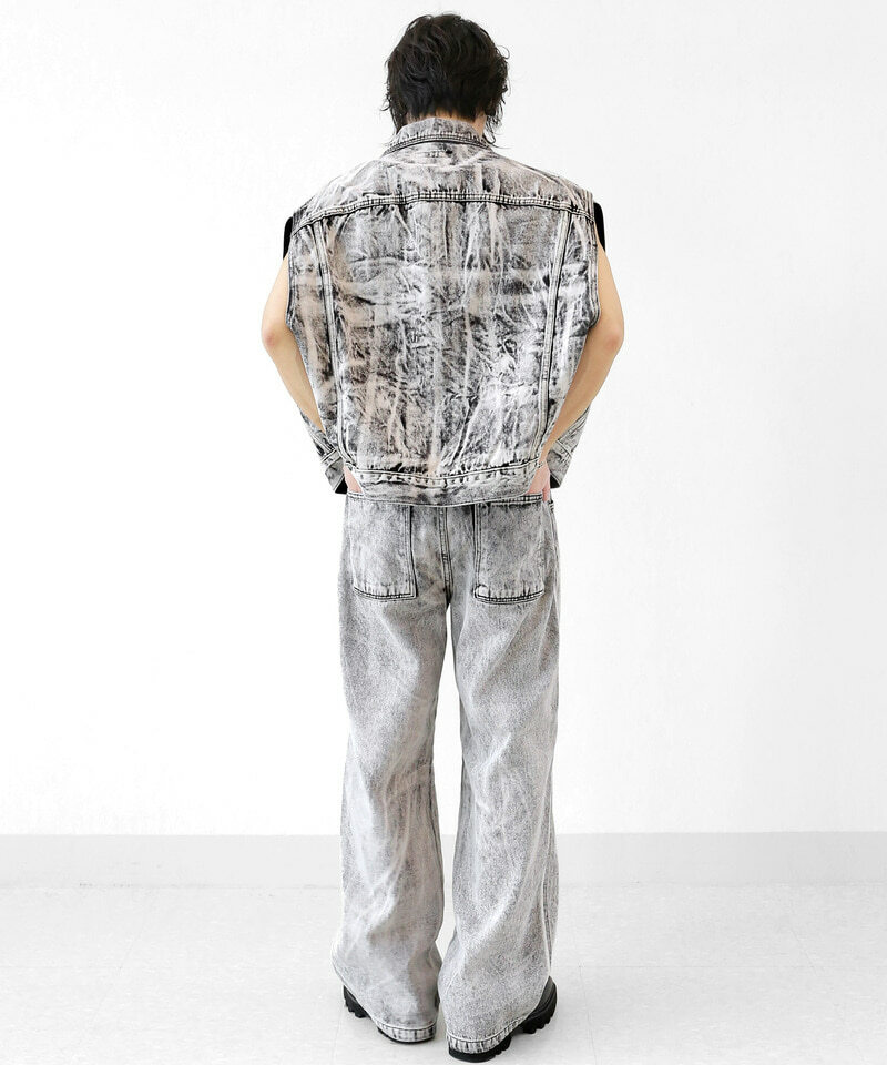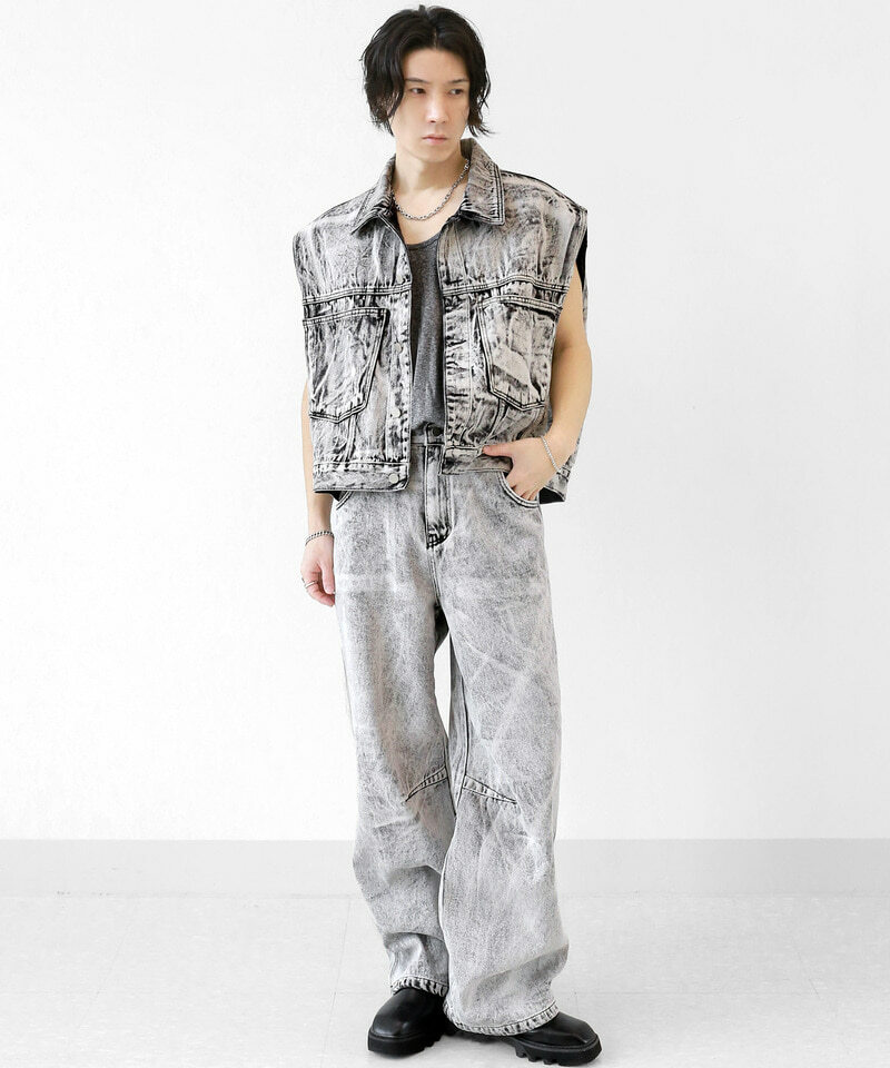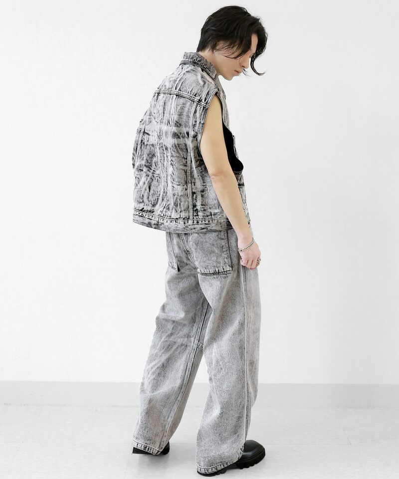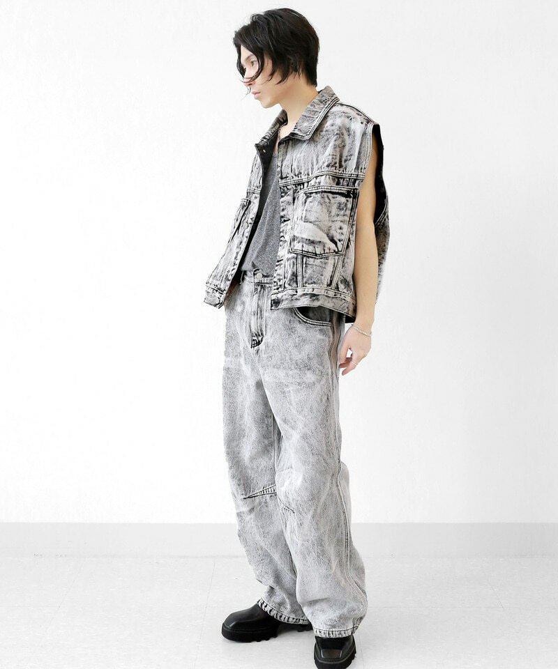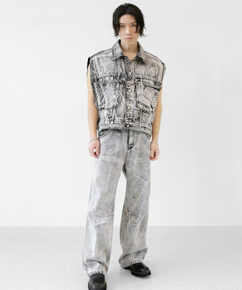 經過水洗牛仔背心,具有獨特的褪色外觀和復古感。