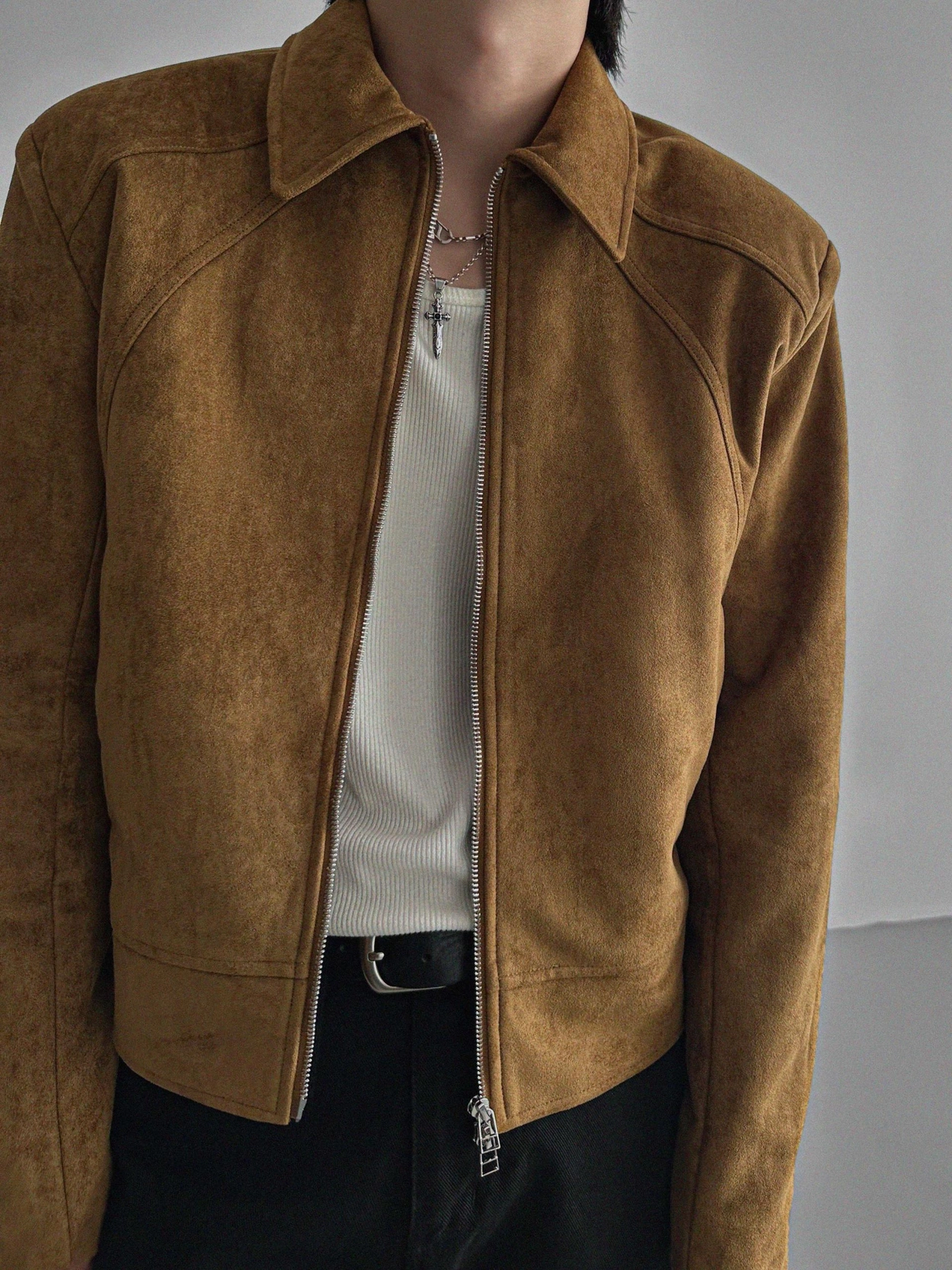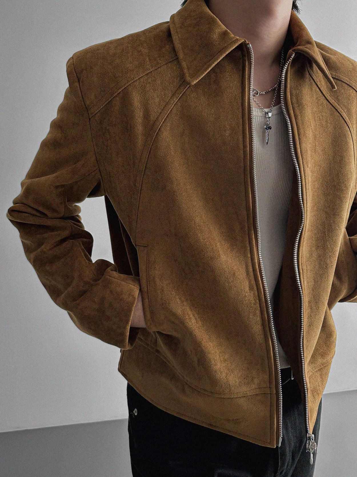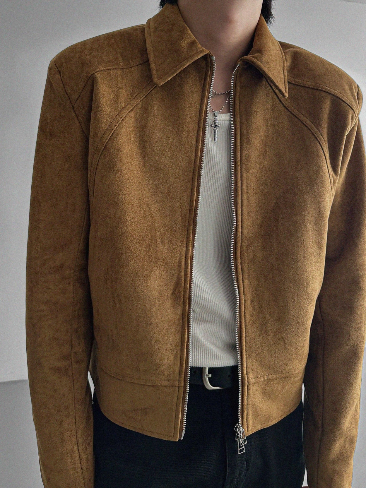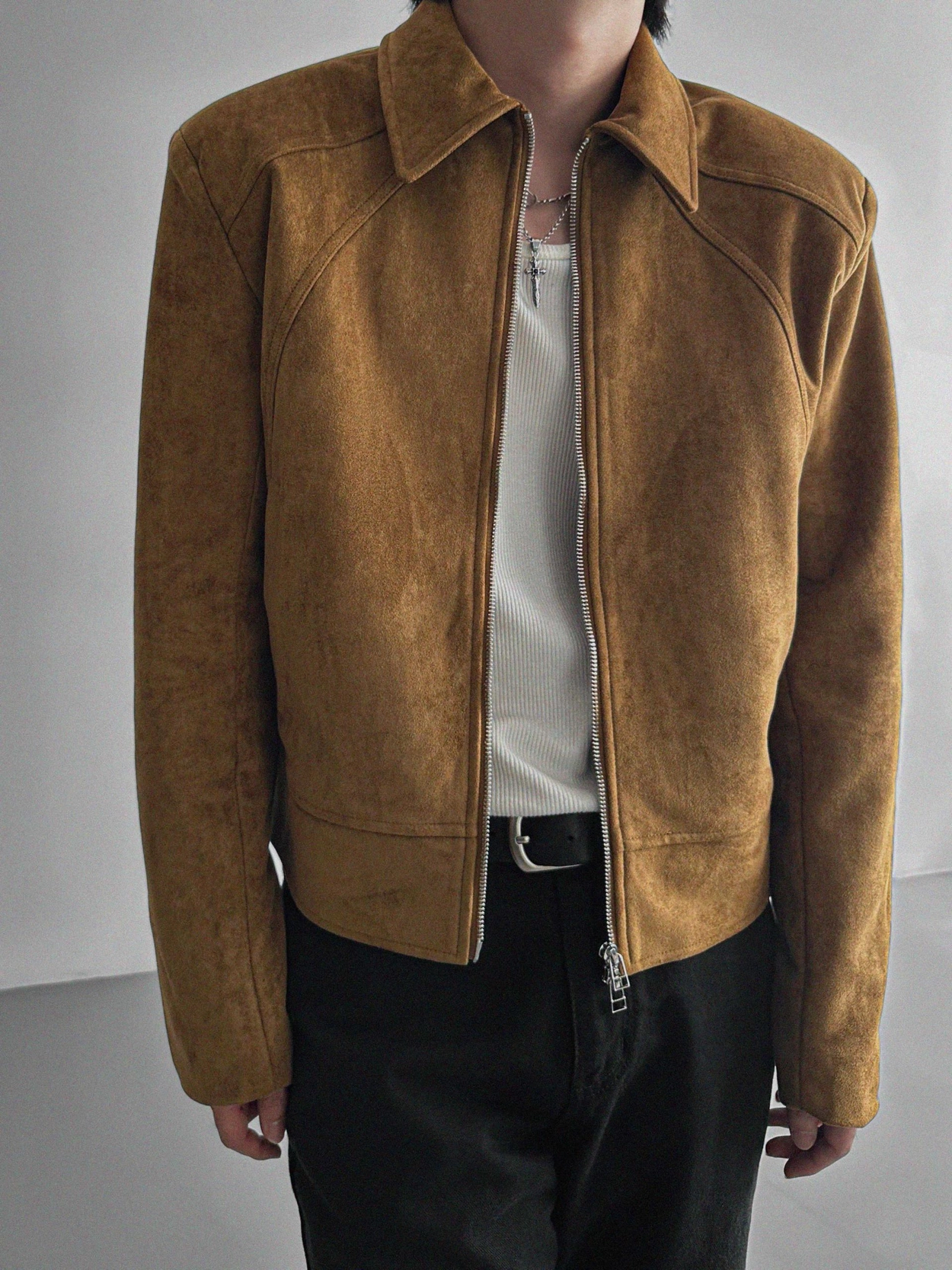 - 這款拉鍊夾克採用麂皮絨布料,營造奢華質感。