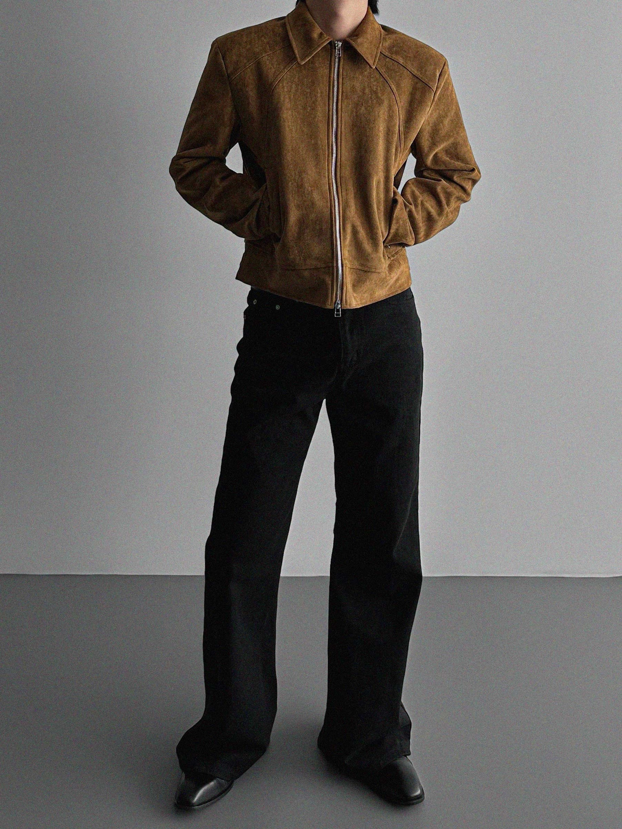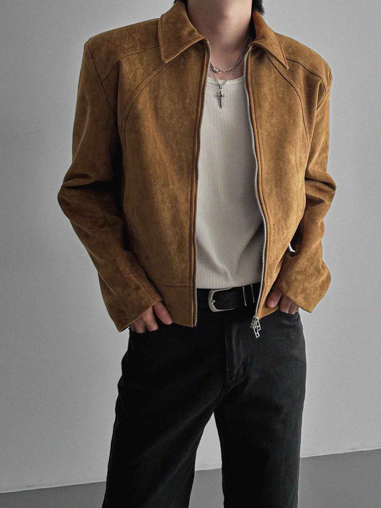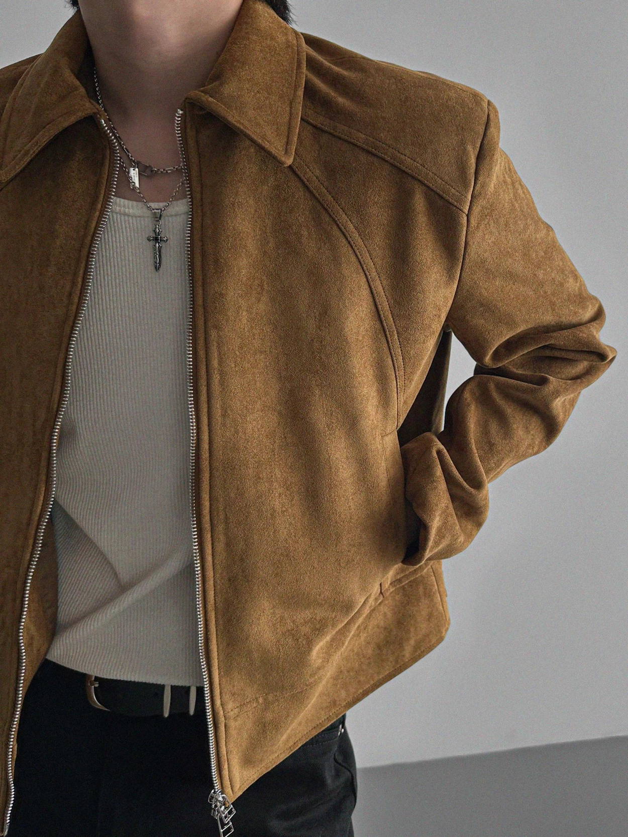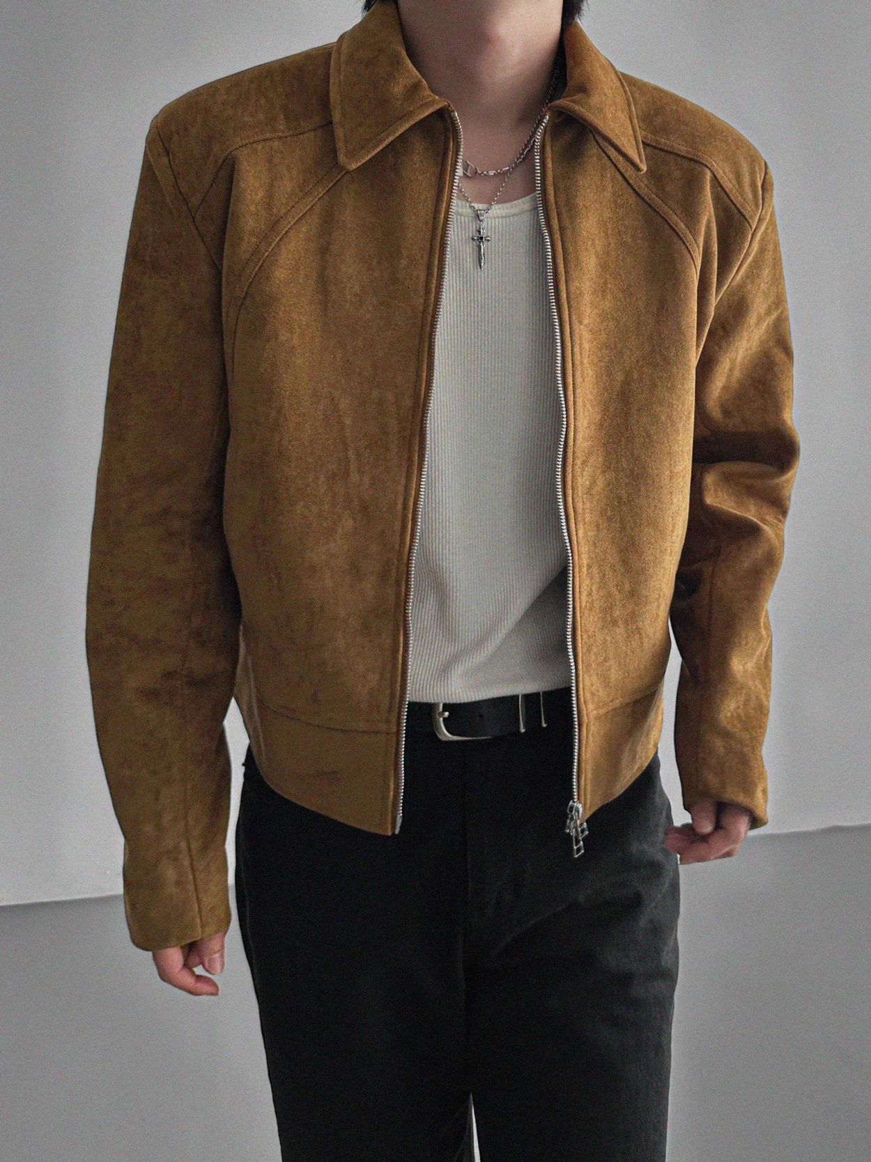 - 這款拉鍊夾克採用麂皮絨布料,營造奢華質感。