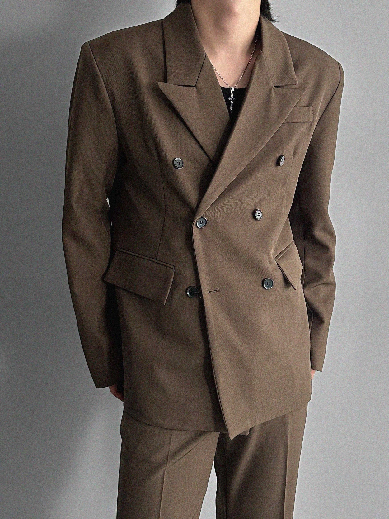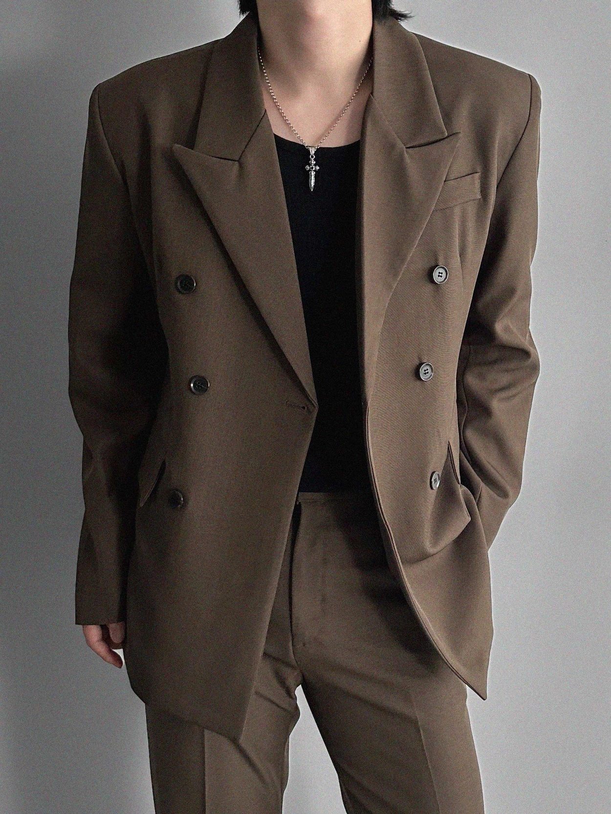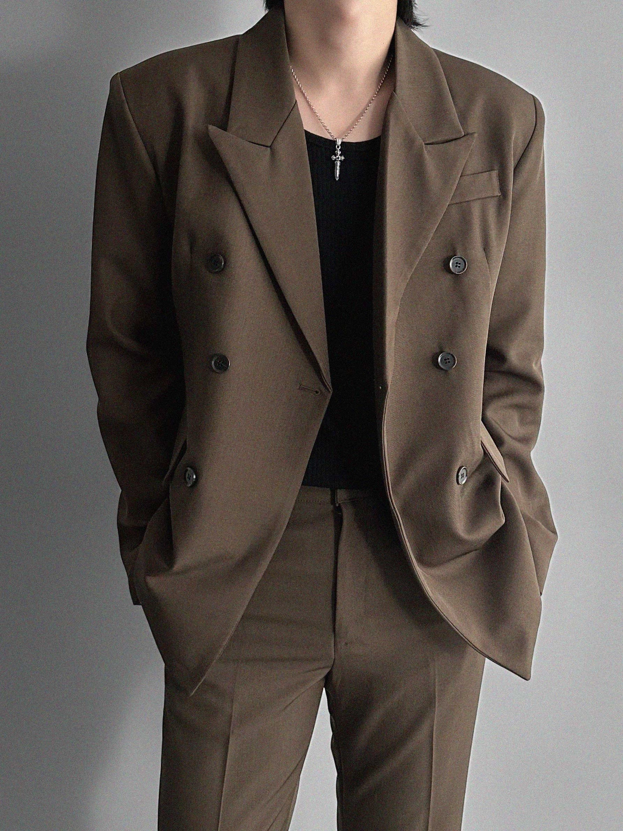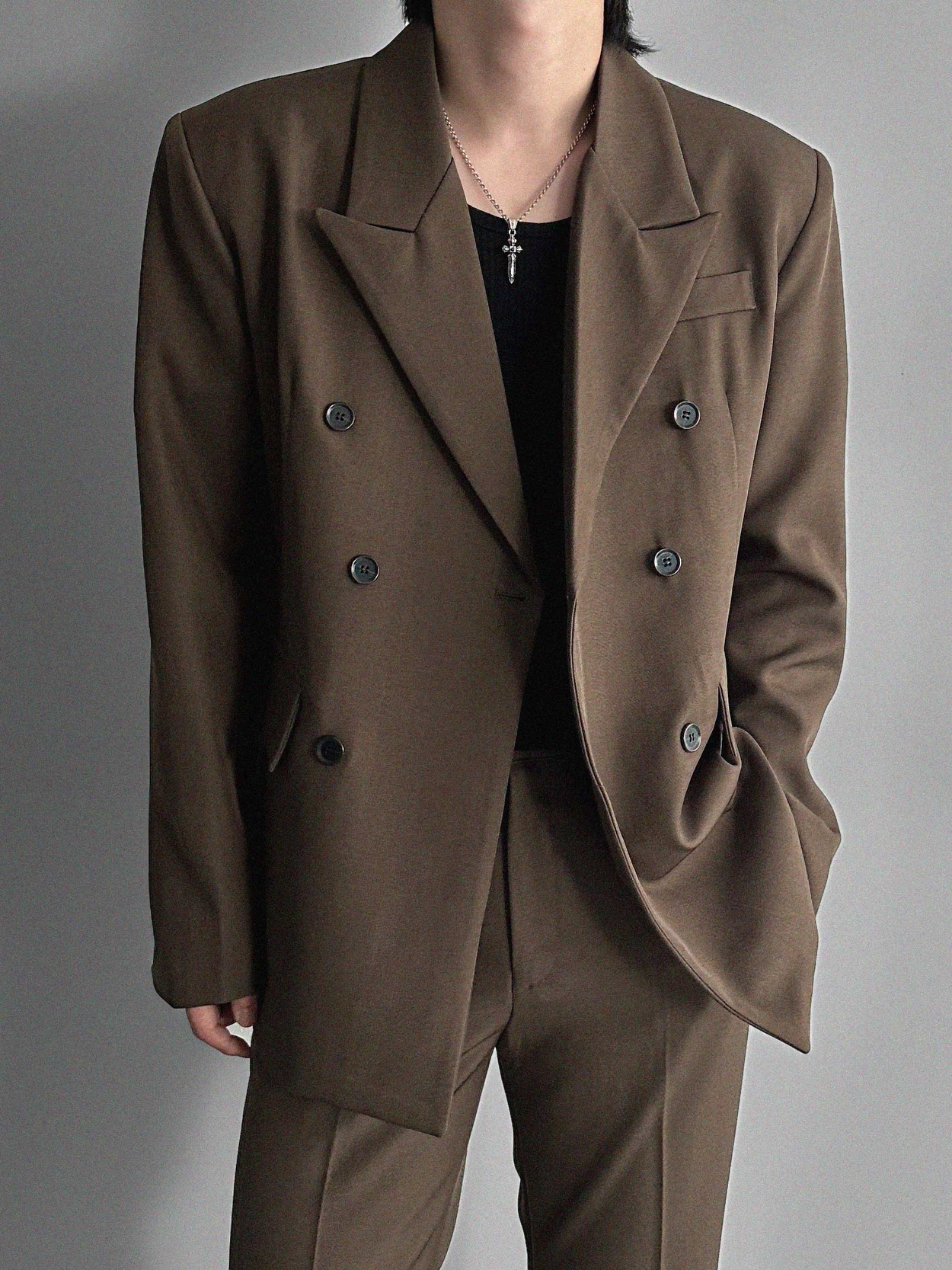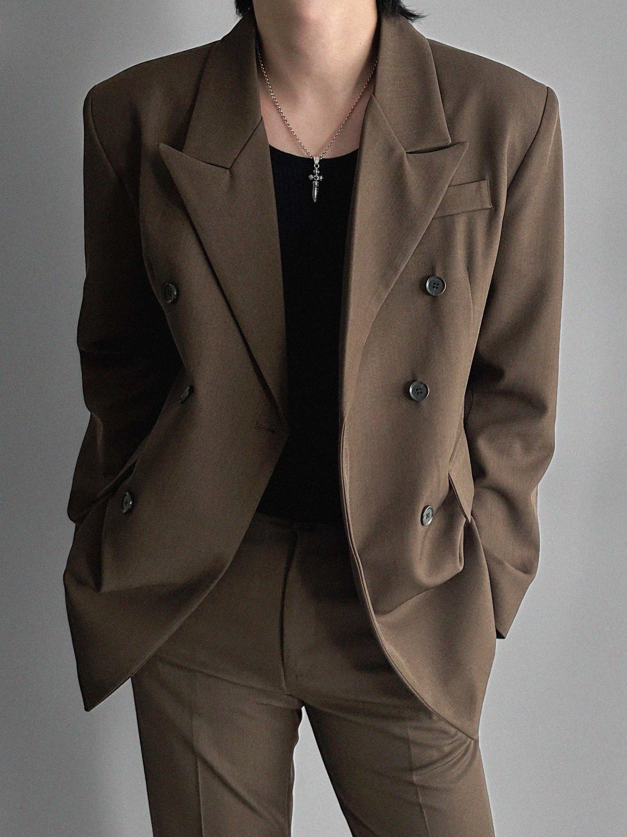 這款精緻的雙排扣西裝套裝融合了現代剪裁與休閒輪廓。