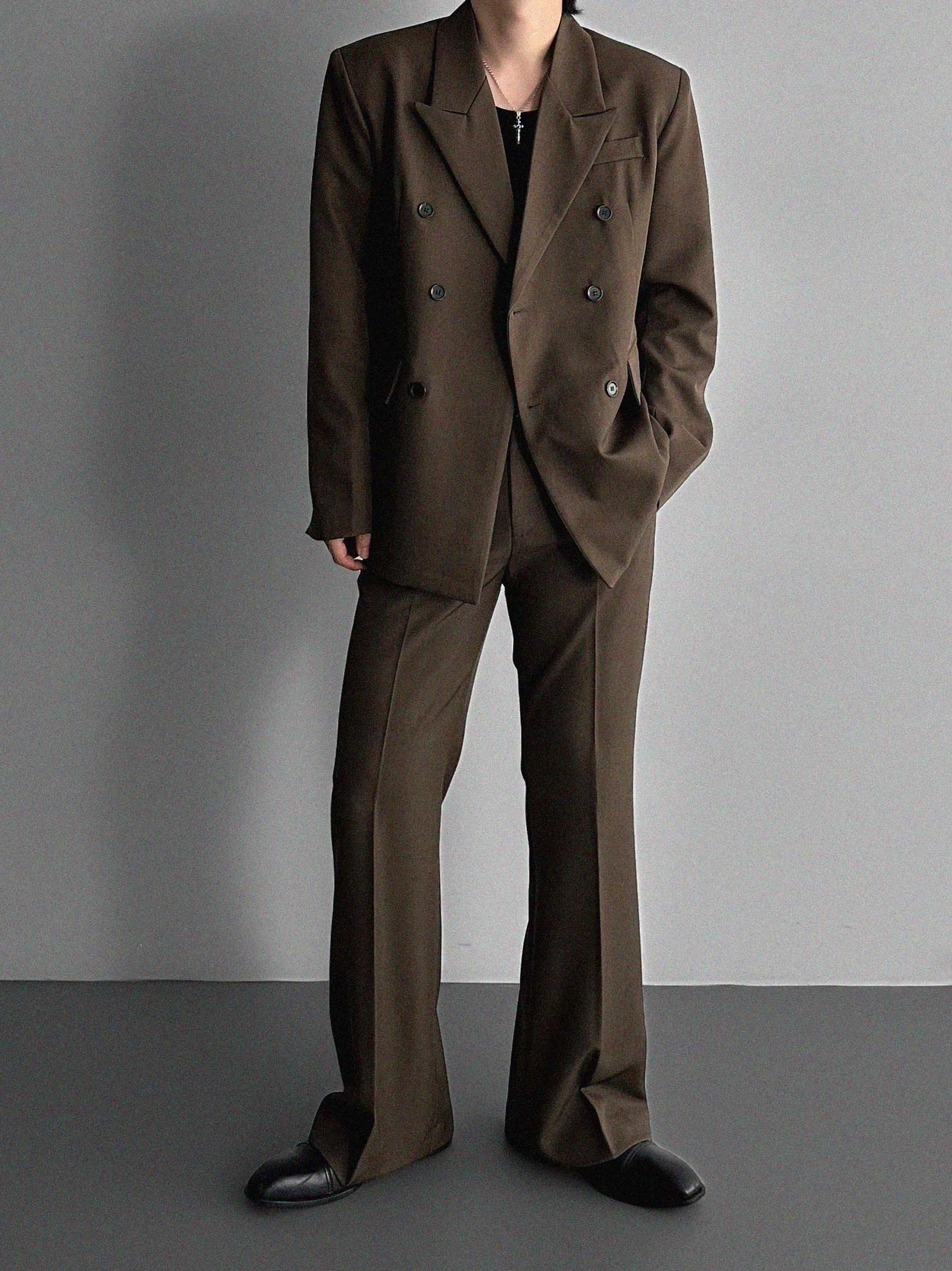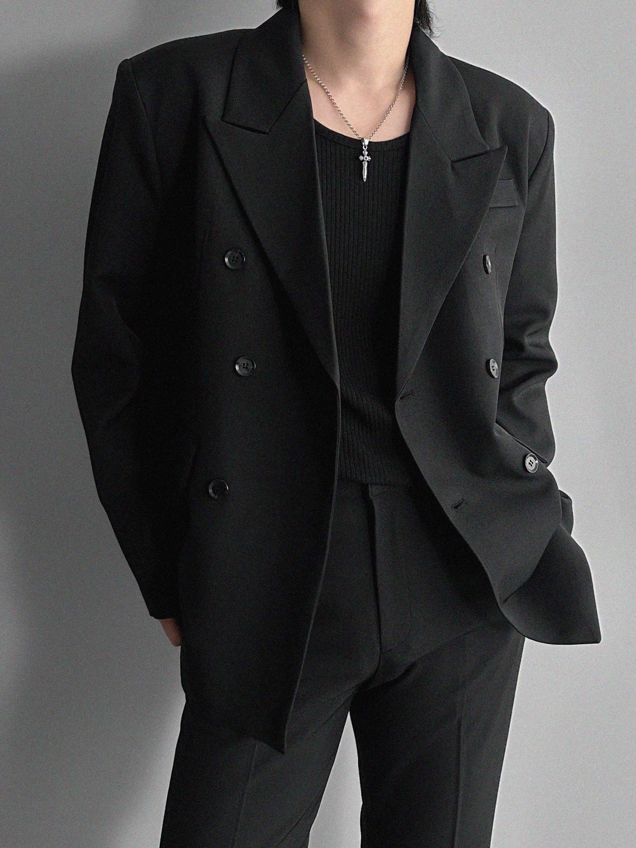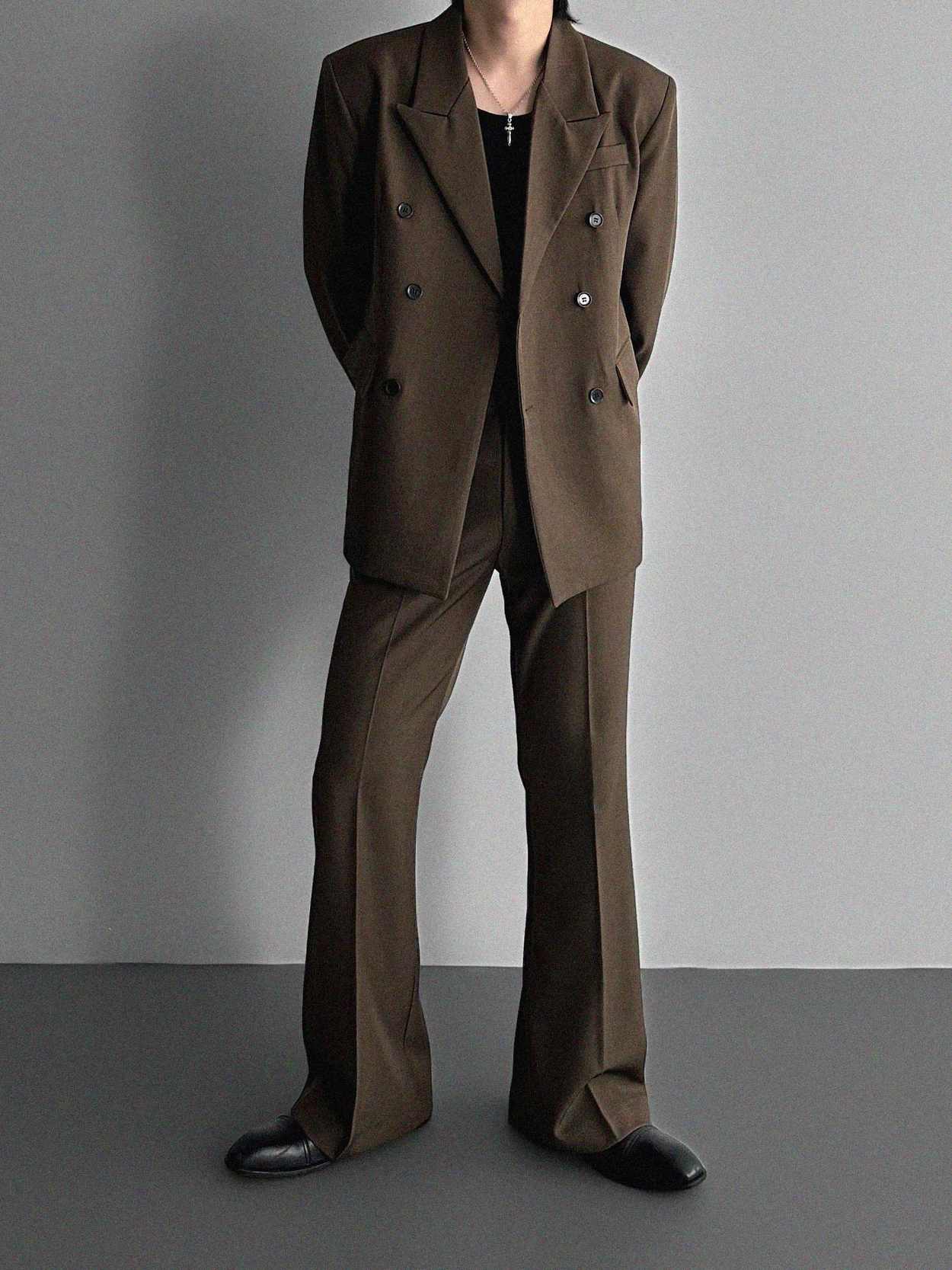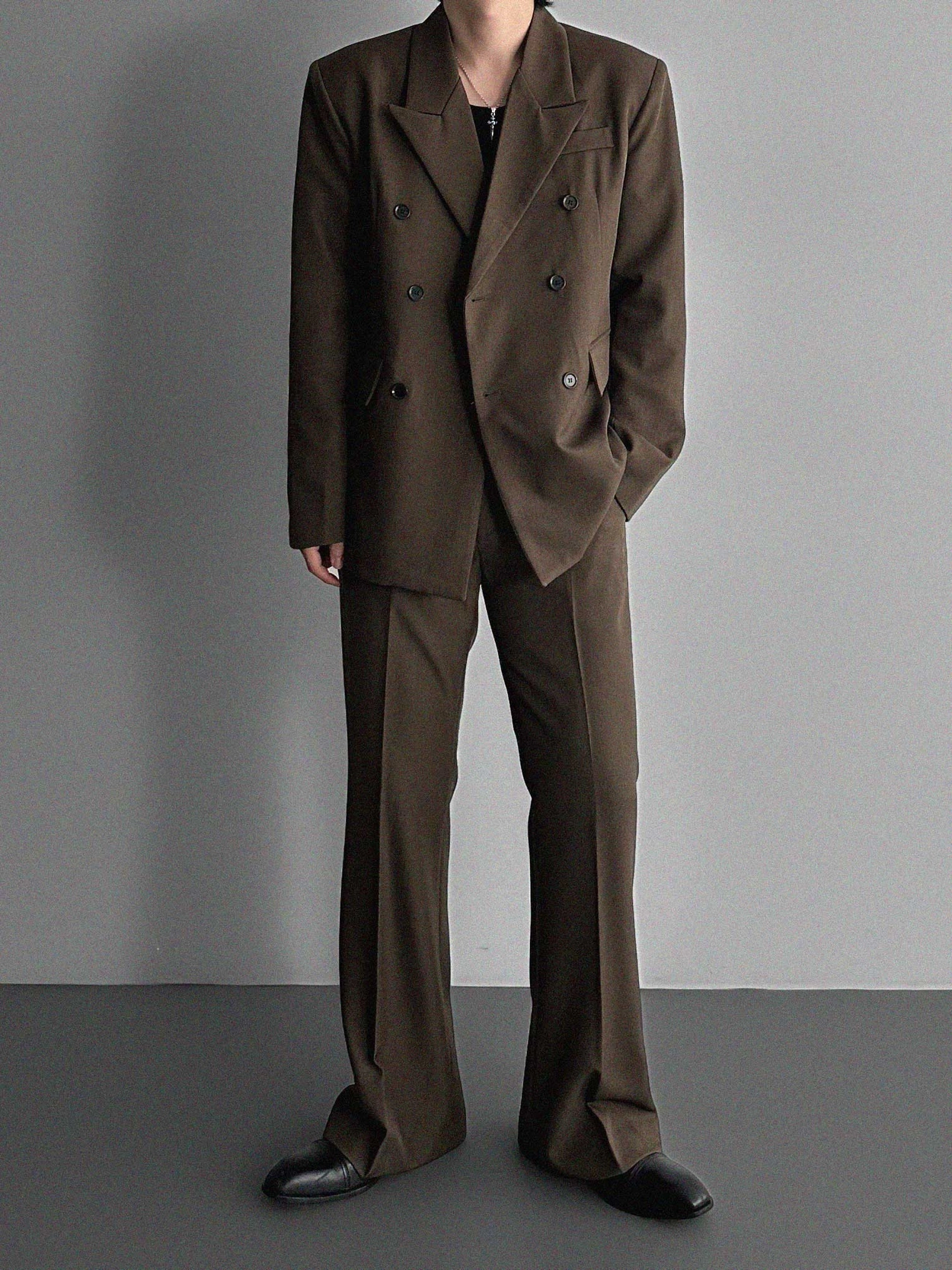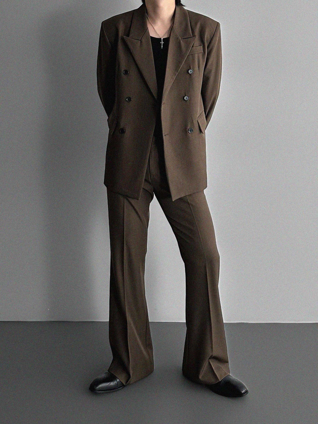 這款精緻的雙排扣西裝套裝融合了現代剪裁與休閒輪廓。