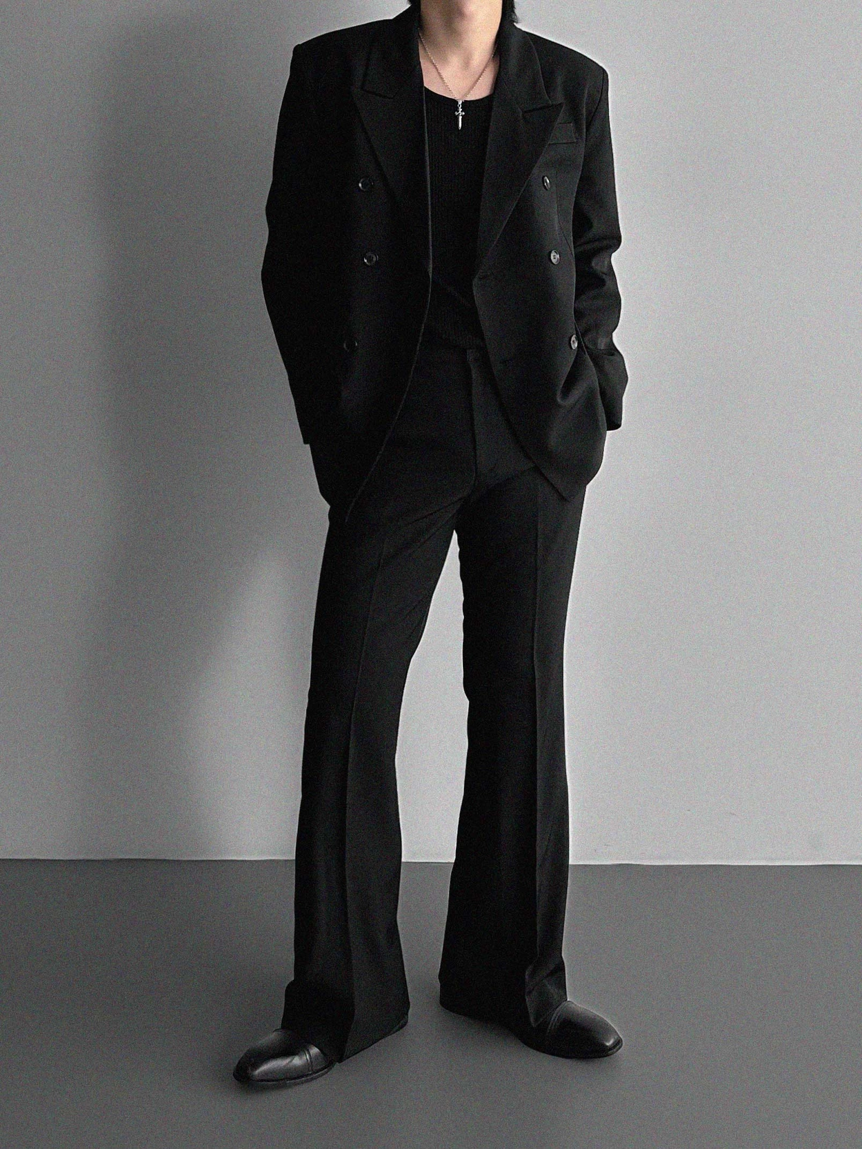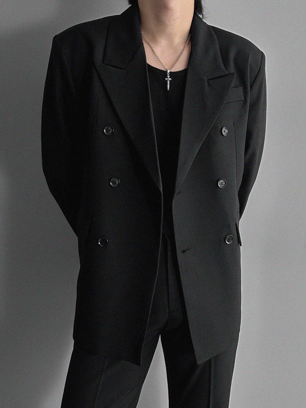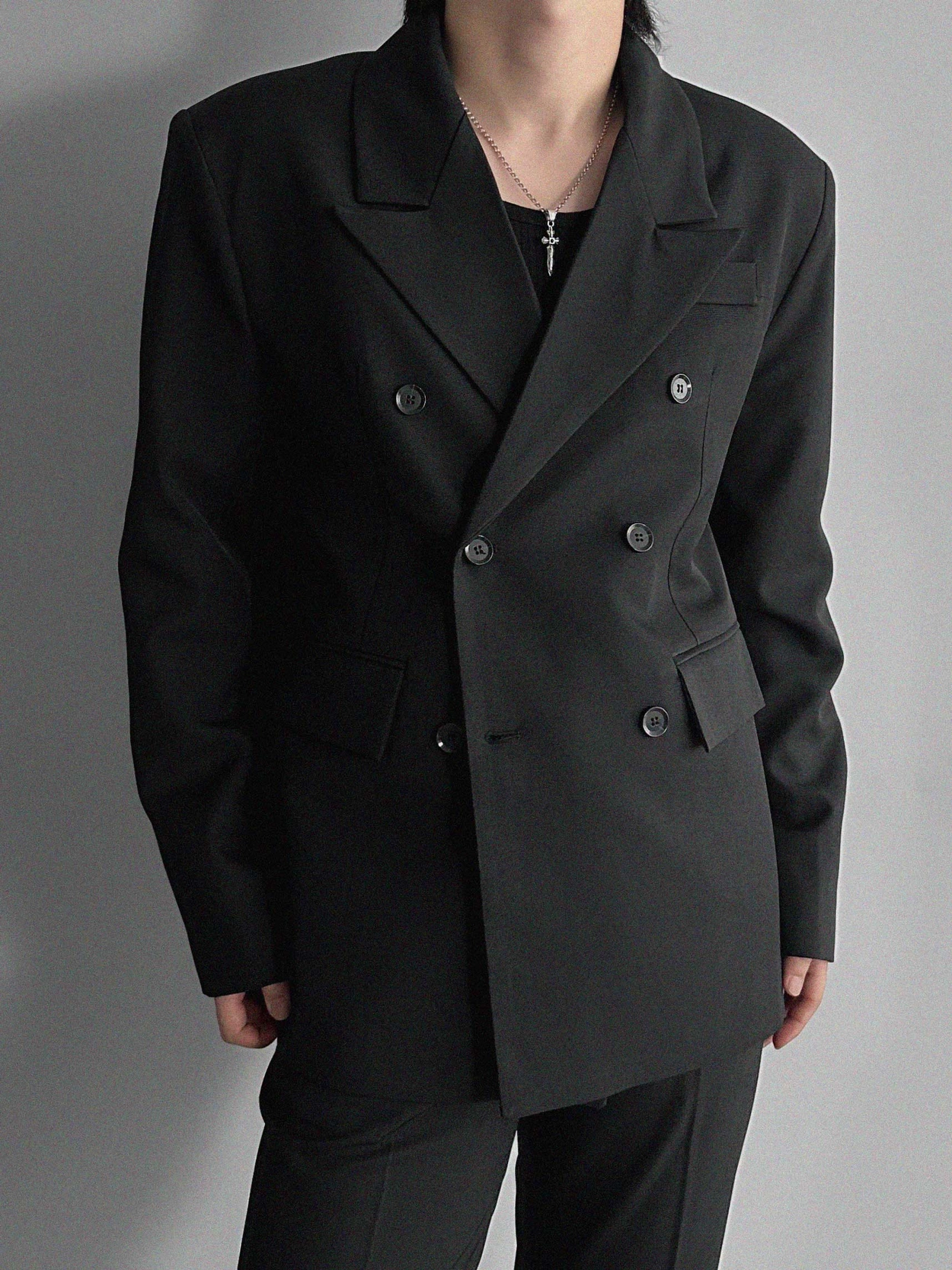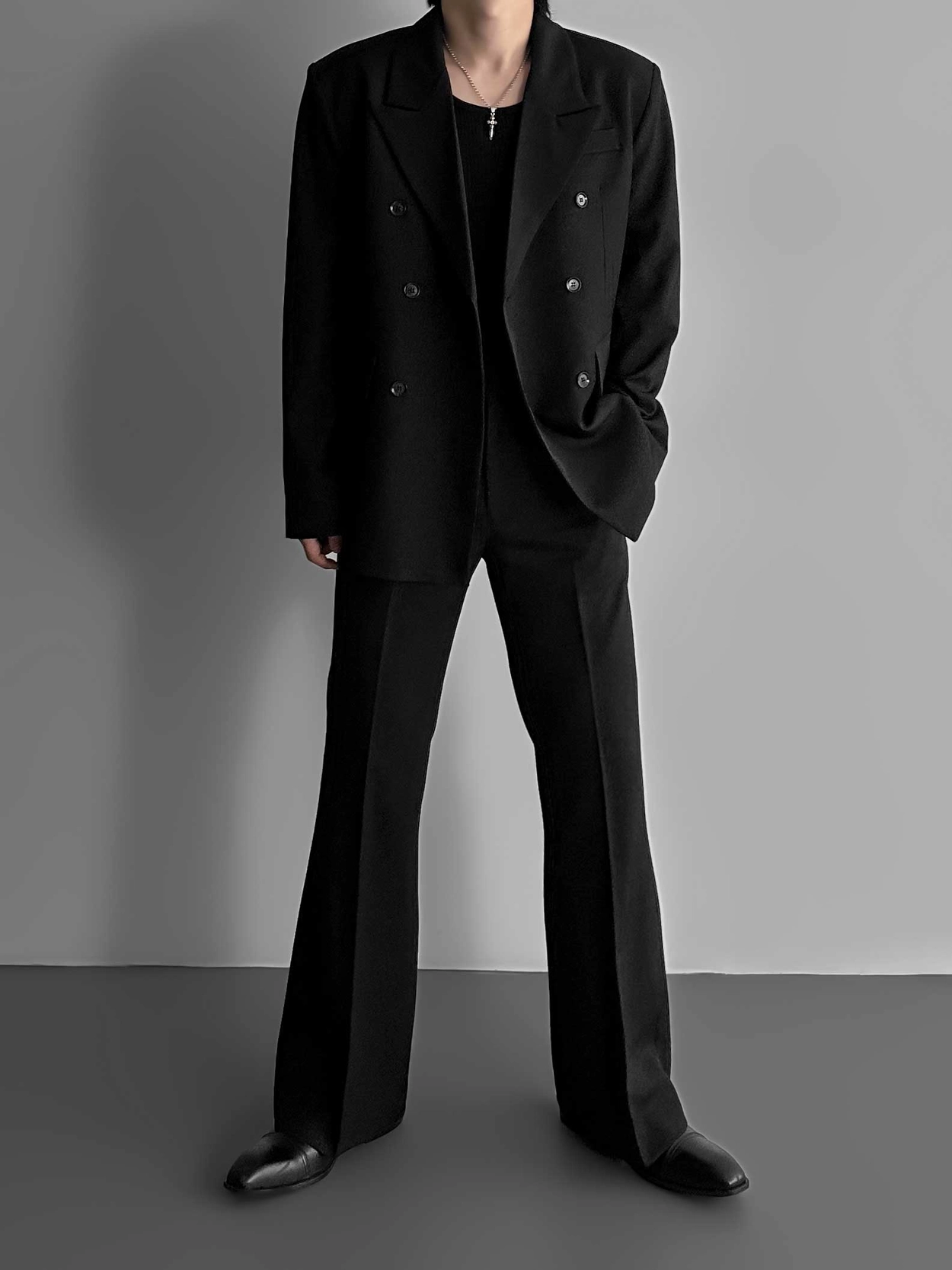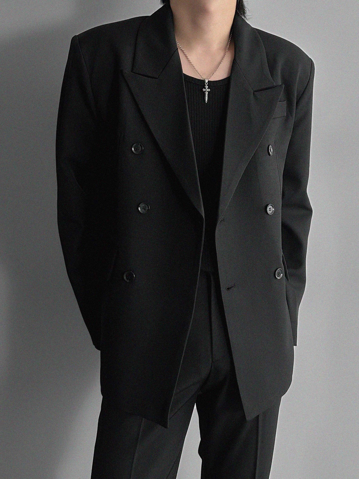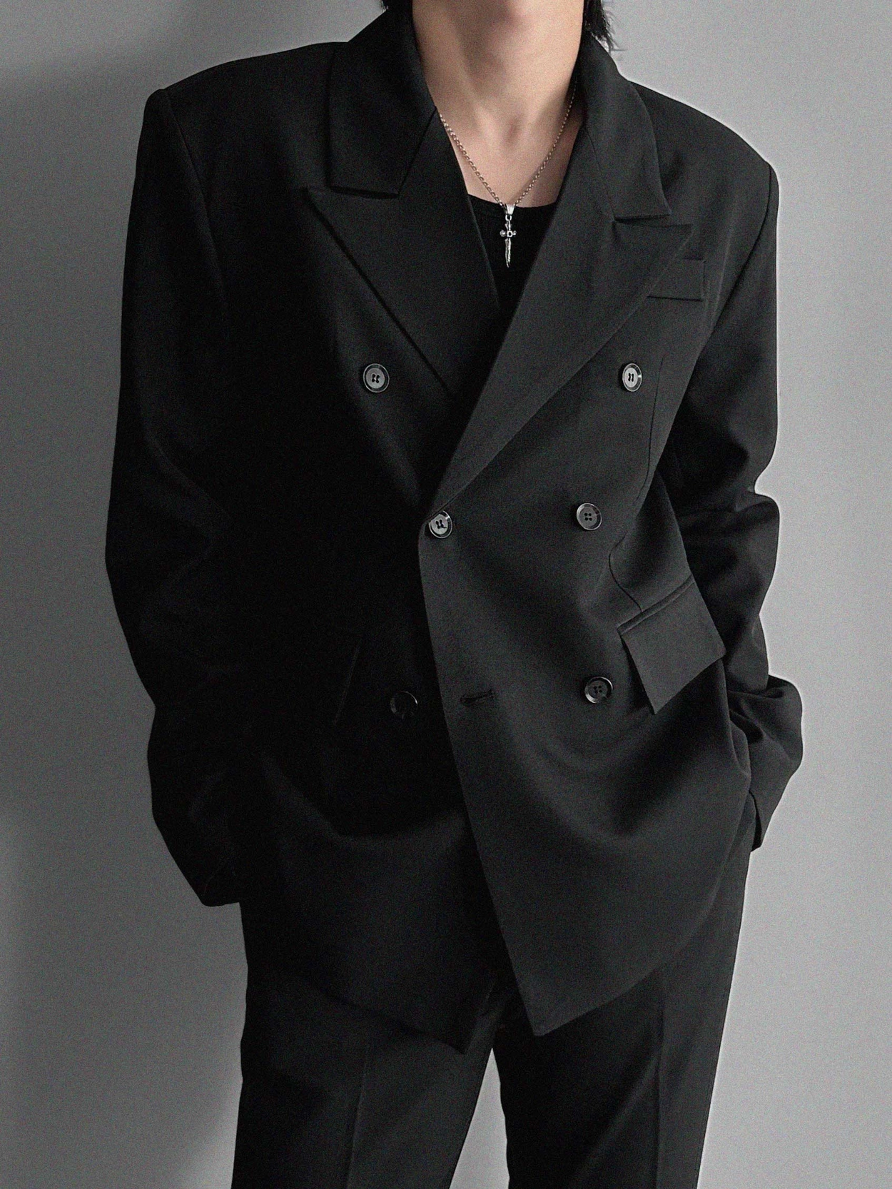 這款精緻的雙排扣西裝套裝融合了現代剪裁與休閒輪廓。